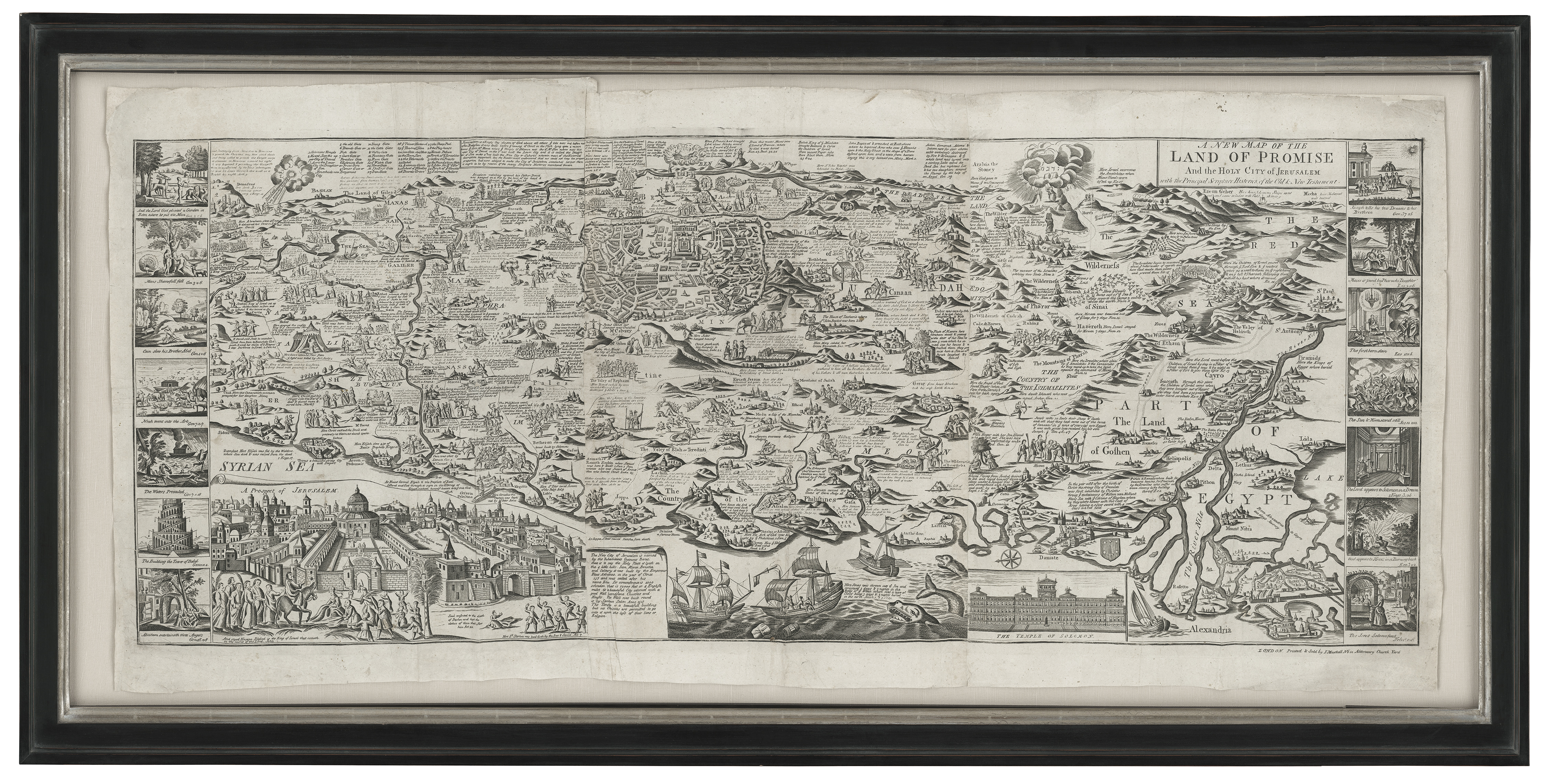 A map titled ‘A New Map of the Land of Promise and the Holy City of Jerusalem’. It depicts the Land of Promise and the Holy City of Jerusalem, including principal scripture histories from the Old and New Testaments. A version of this map was published April 5th, 1799 by J. Evans. Other references indicate a date of 1823. The style is vintage.