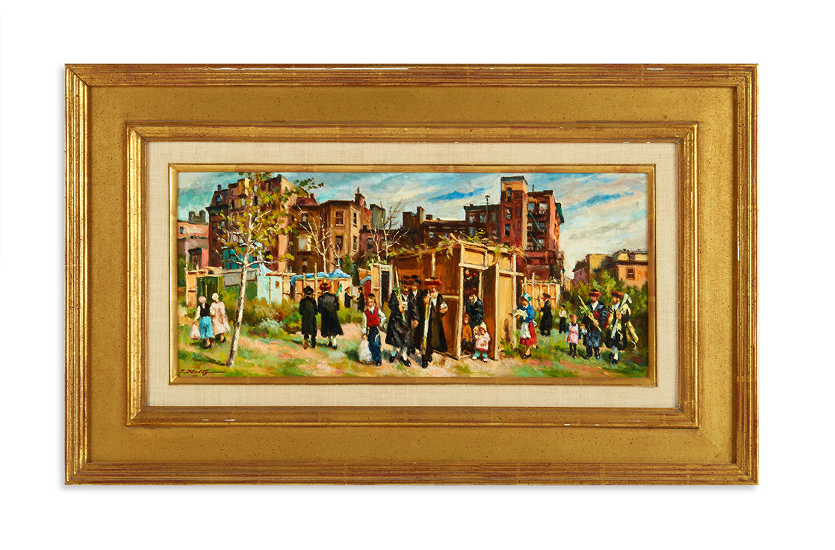 A framed panoramic painting, likely oil on canvas, depicting a vibrant urban street scene. The painting features numerous figures.