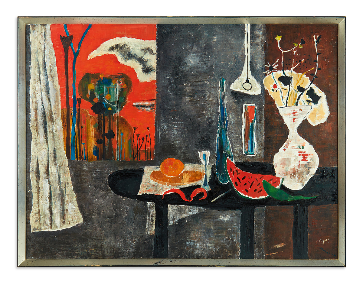Oil on canvas by Yohanan Simon (Israeli, 1905-1976), depicting an interior with fruit, dated to the 1960s.