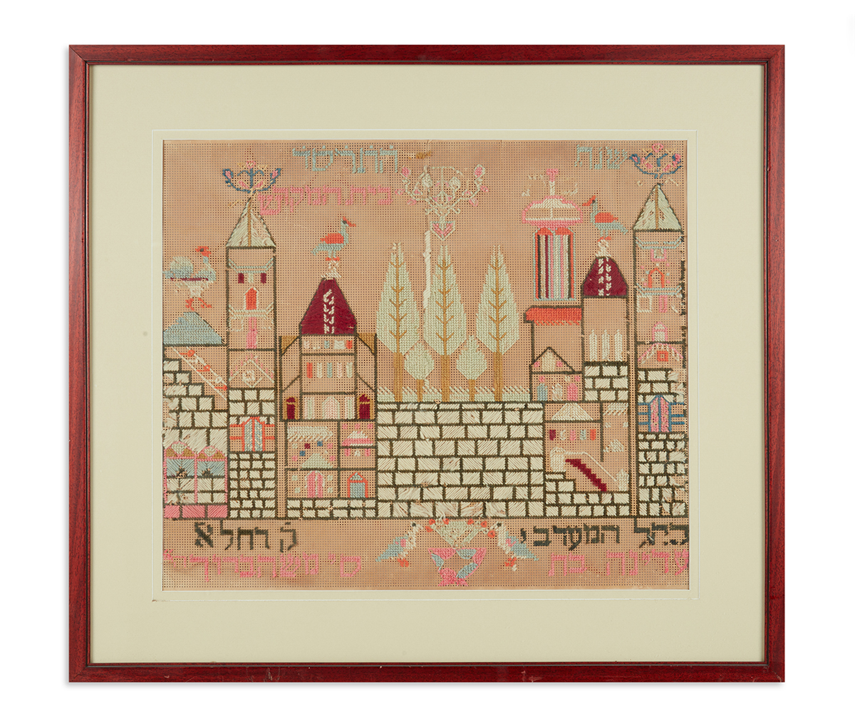 An early 20th-century Judaica Hebrew folk art embroidery with punchwork, identified as a ‘Mizrach’ sampler. This piece, dated 1901, is from Palestine and is designed to indicate the direction of prayer towards Jerusalem. It is associated with the Western Wall, a sacred site, and commemorates both routine and rare moments. Maker unknown.