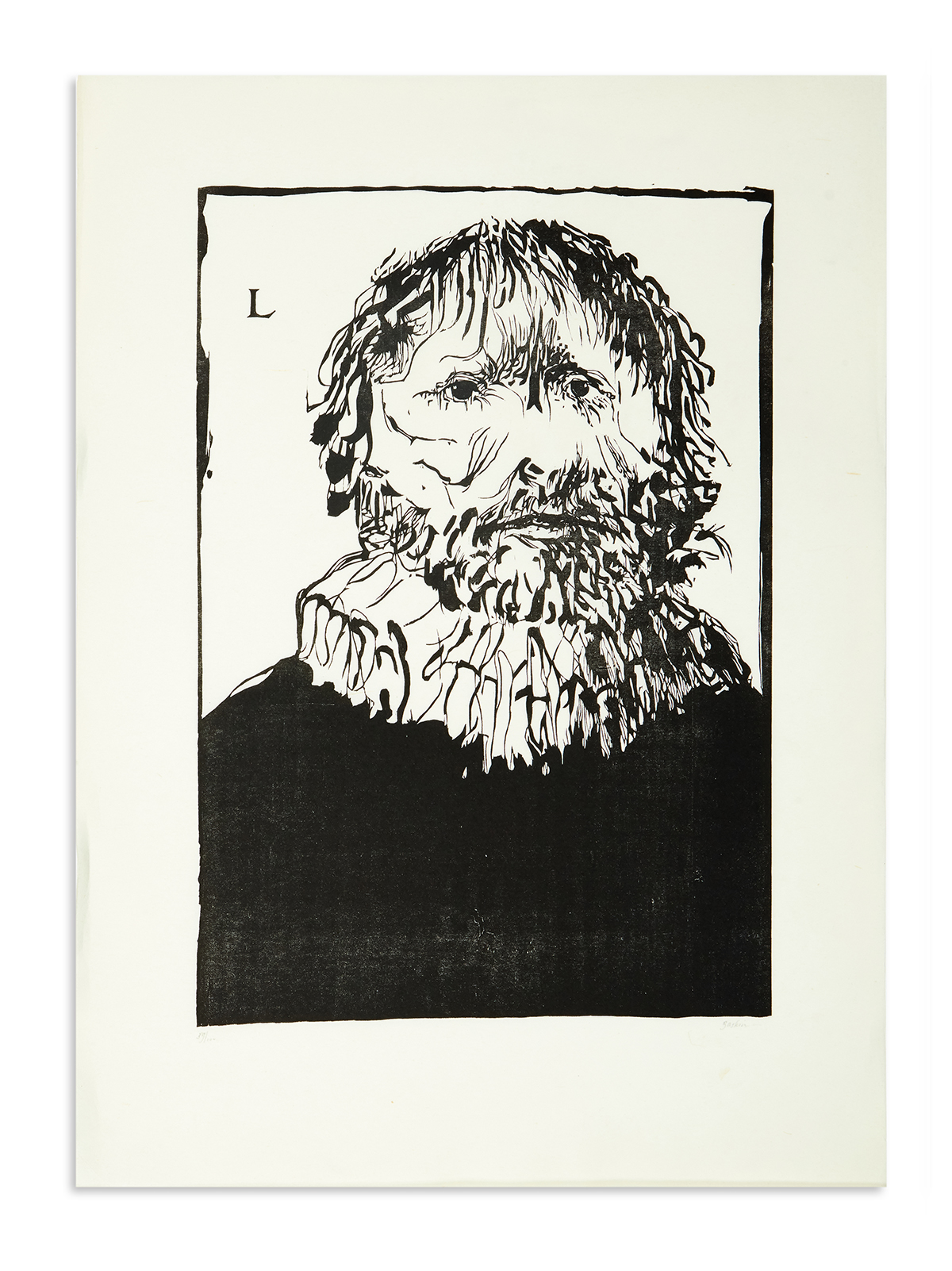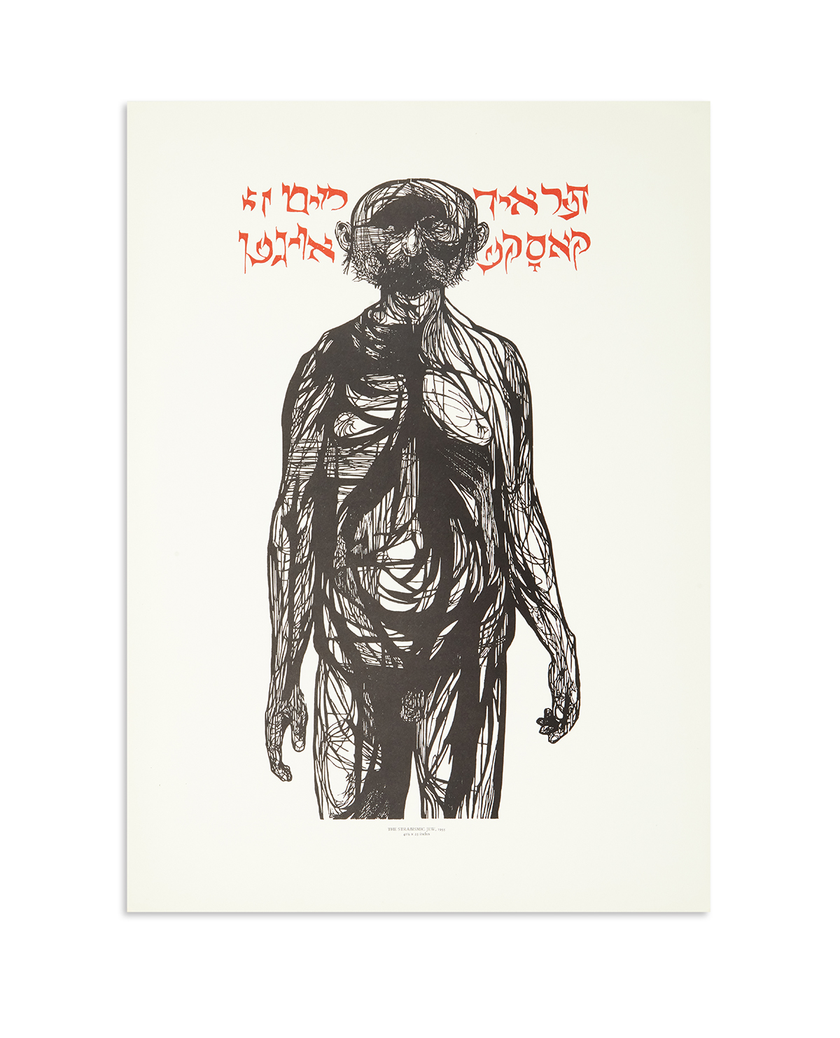 A woodcut print by Leonard Baskin titled “The Strabismic Jew.” The print is on wove paper, signed and titled. It is described as a large woodcut and dated 1955.