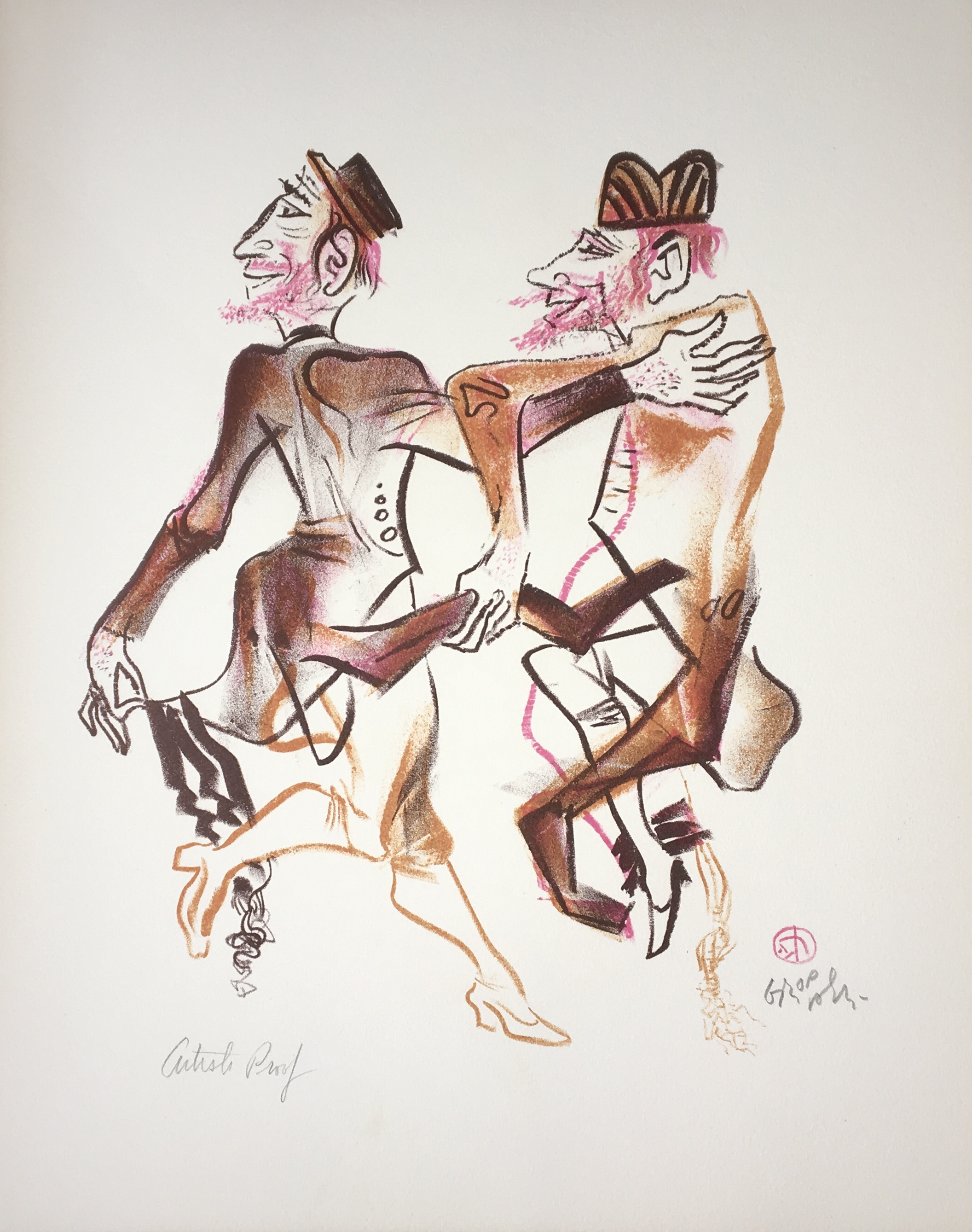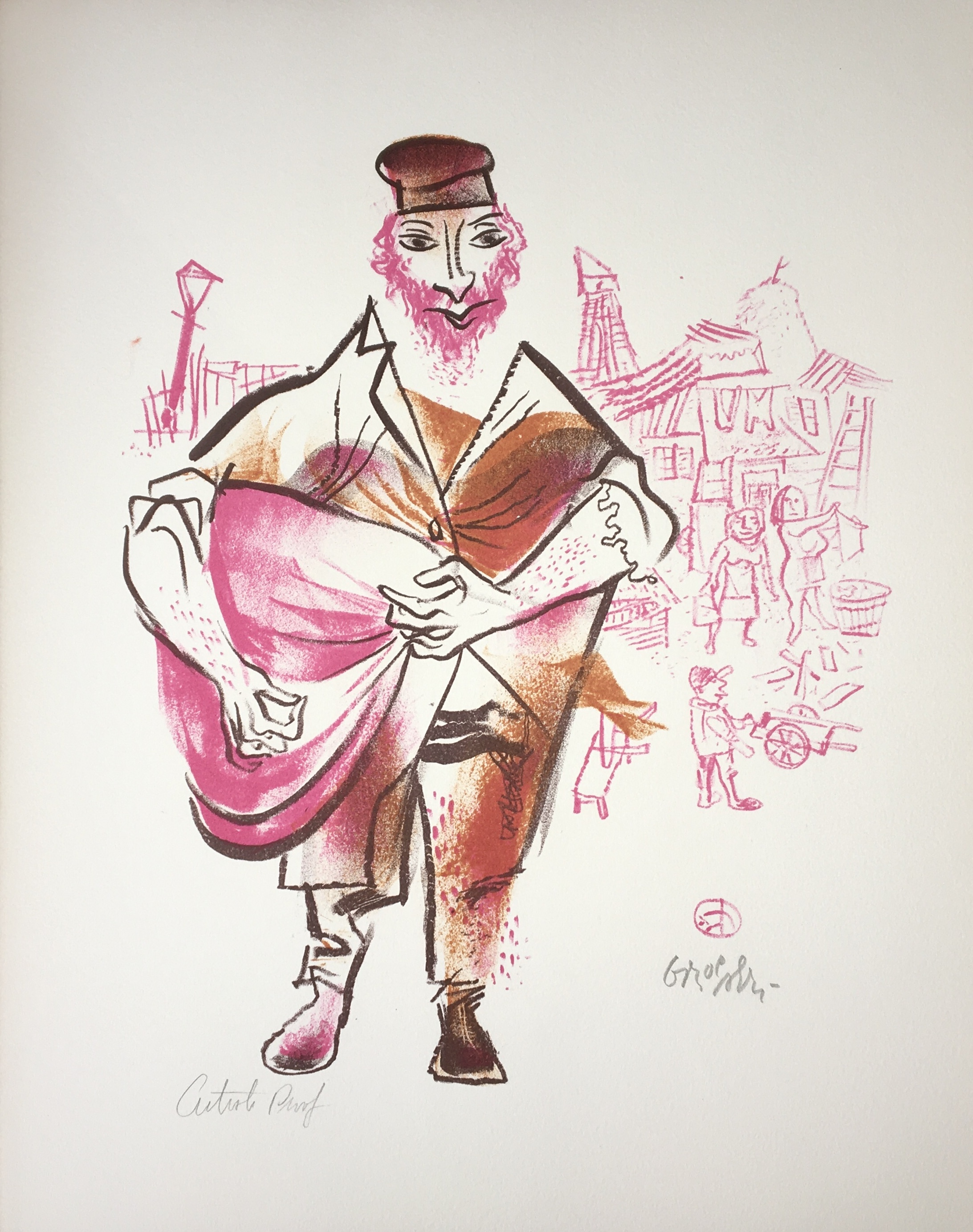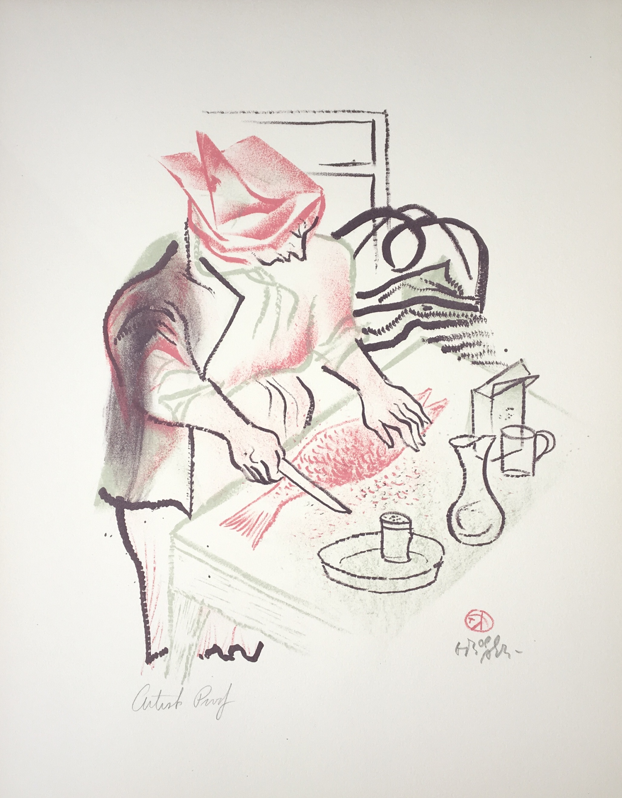 A lithograph in colours by William Gropper (USA 1897-1977), titled Fish Cutter (Preparing Fish for Dinner), created in 1970. The dimensions are 35.5×27.5cm. The work is an A/P (Artist’s Proof). It is associated with Social Realist Art and the WPA movement, often depicting Jewish Shtetl Americana Judaica themes.