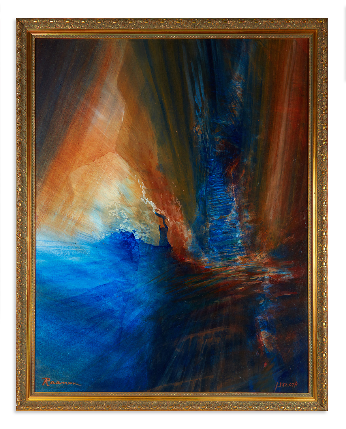 An abstract painting by Leonardo Nierman titled “Un Fuego Magico (Variation)”. The artwork is executed in oil on Masonite, and is signed and dated. The painting features broad, visible brushstrokes and a textured surface. Dominant colors include various shades of blue, ranging from light sky blue to deep navy, alongside orange, rust, and dark brown/black, with some lighter, almost white, accents. The composition is characterized by sweeping, vertical, and horizontal strokes. The upper sections primarily display orange and rust tones, transitioning to blues in the lower half, with a prominent area of bright blue visible in the lower left. The painting is housed in a square, gold-toned frame. The frame features an ornate, raised pattern resembling scrollwork or floral motifs along its inner and outer edges, with a smooth, slightly recessed band in between.