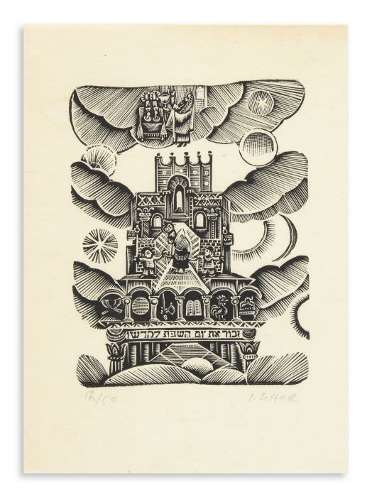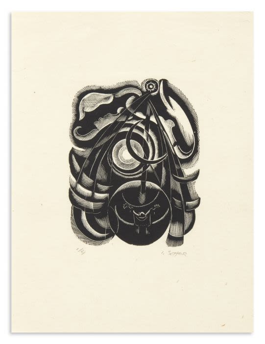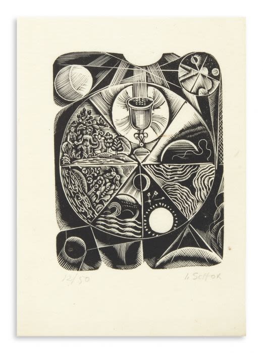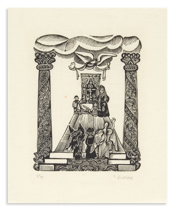 An Expressionist Judaica woodcut by Ilya Schor (1904 –1961), titled ‘The Sabbath’. Schor was a Polish-American Jewish artist, also known as a painter, jeweler, engraver, and sculptor. The image measures 5.5 X 4.5 inches, and when framed, the piece measures 12 X 10 inches.