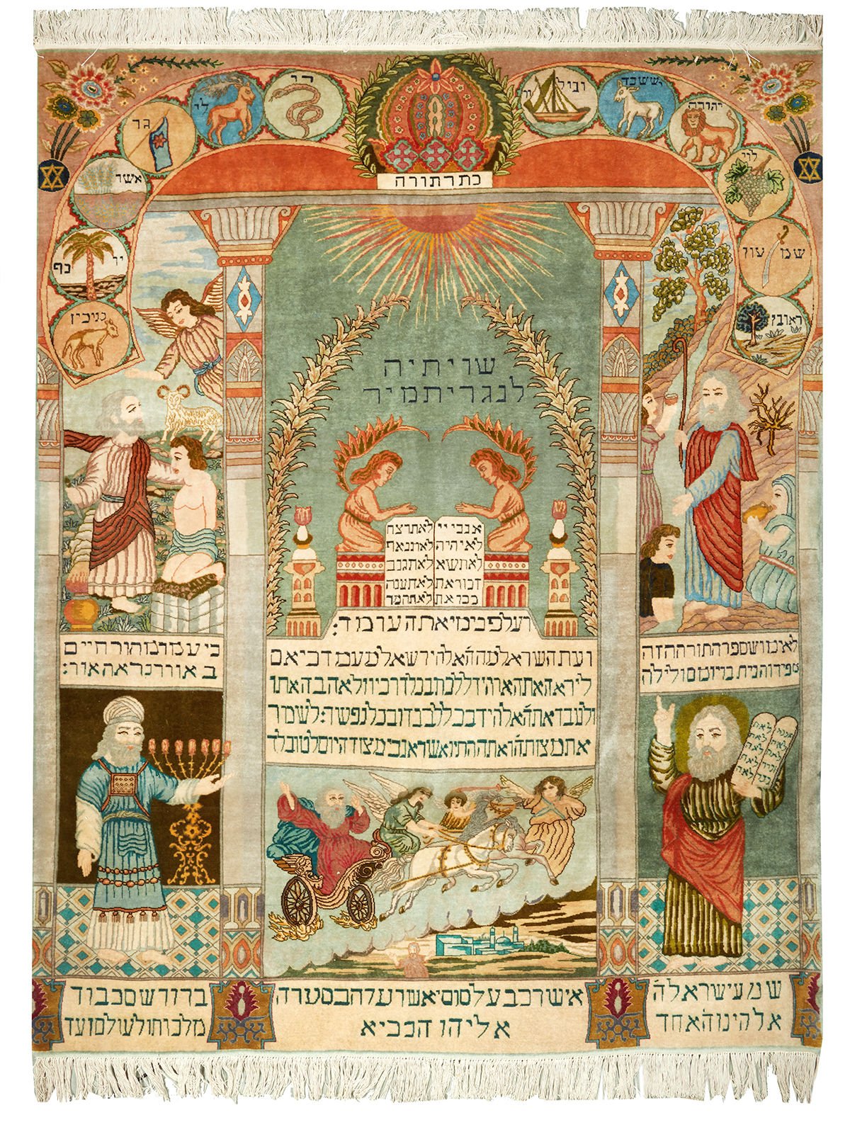 Vintage Tabriz Nami Rug. Pile: Kork. Foundation: Silk. Origin: Tabriz Nami. Design: Pictorial, depicting Jewish religious subjects and text. Approximate Age: 55 years. Measurements: 7’1″ x 6’5″ (approximately 216 cm x 196 cm).