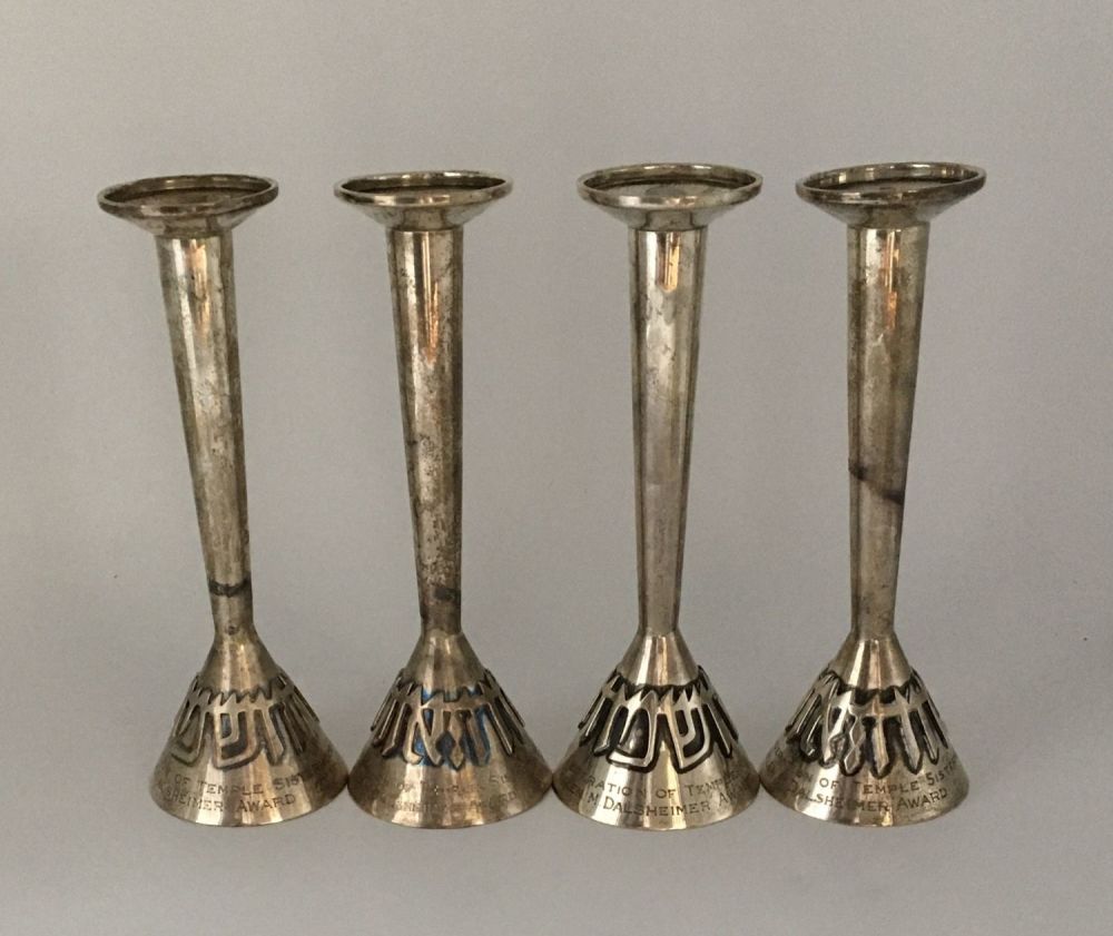 A pair of Crown sterling silver candlesticks, dating to the Mid Century period. Each measures 8.5 inches.