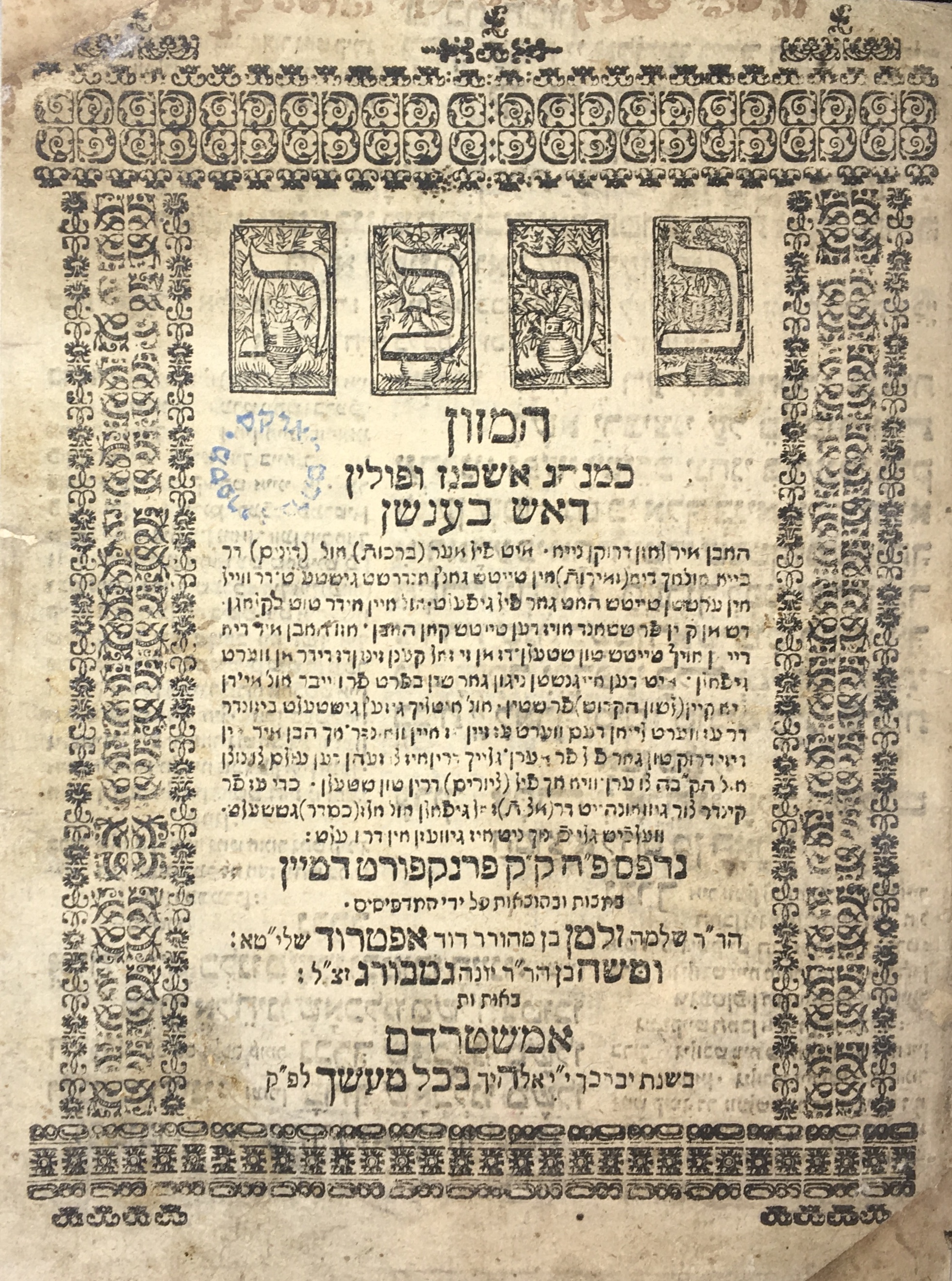 A book titled Sefer Shefa Tal, authored by Rabbi Shabtai Segal Horwitz. It was published in Frankfurt-am-Mein in 1719. The item bears stamps of Rabbi Mos.