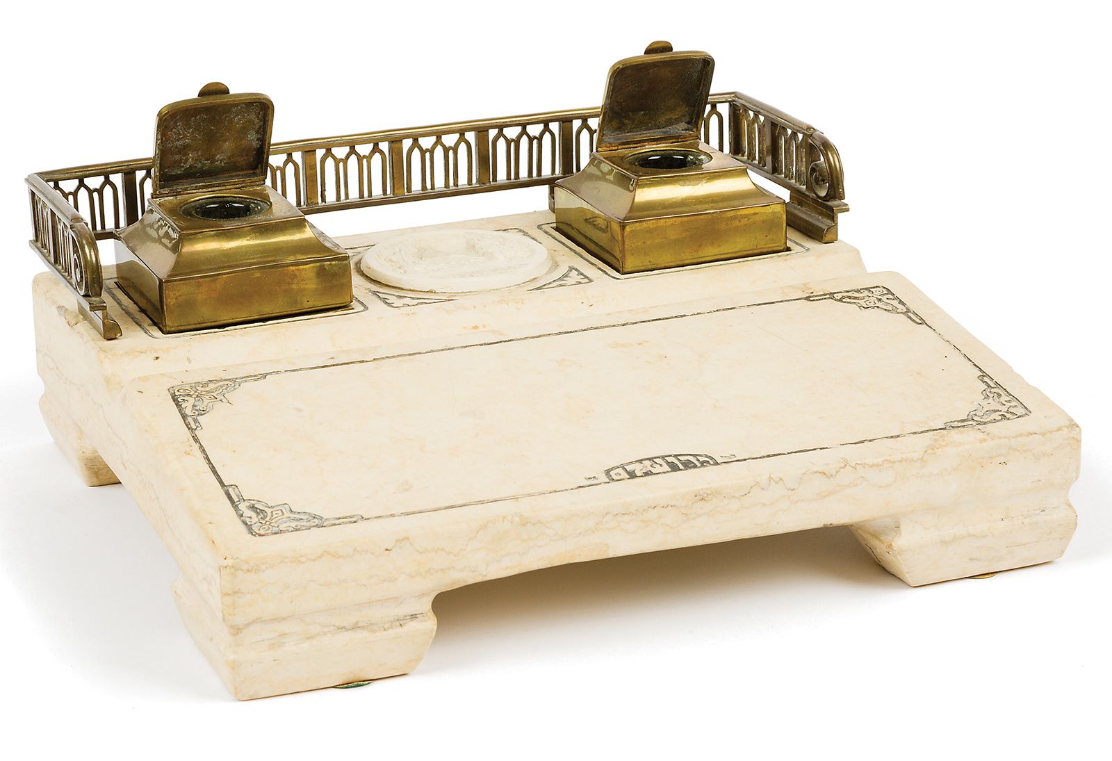 A vintage brass double inkwell, designed in the Art Nouveau style, circa 1890. Features include griffins and glass inkwells.