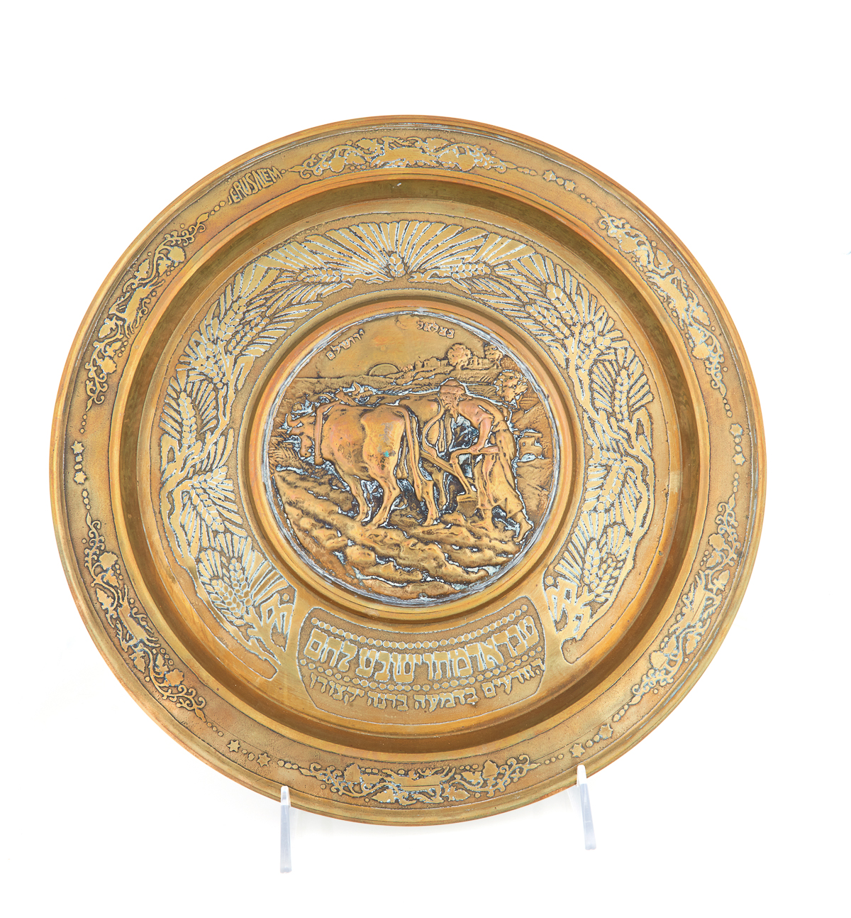 A vintage brass plate or tray, noted for being hand-engraved and custom-made. The item is associated with the Bezalel style.