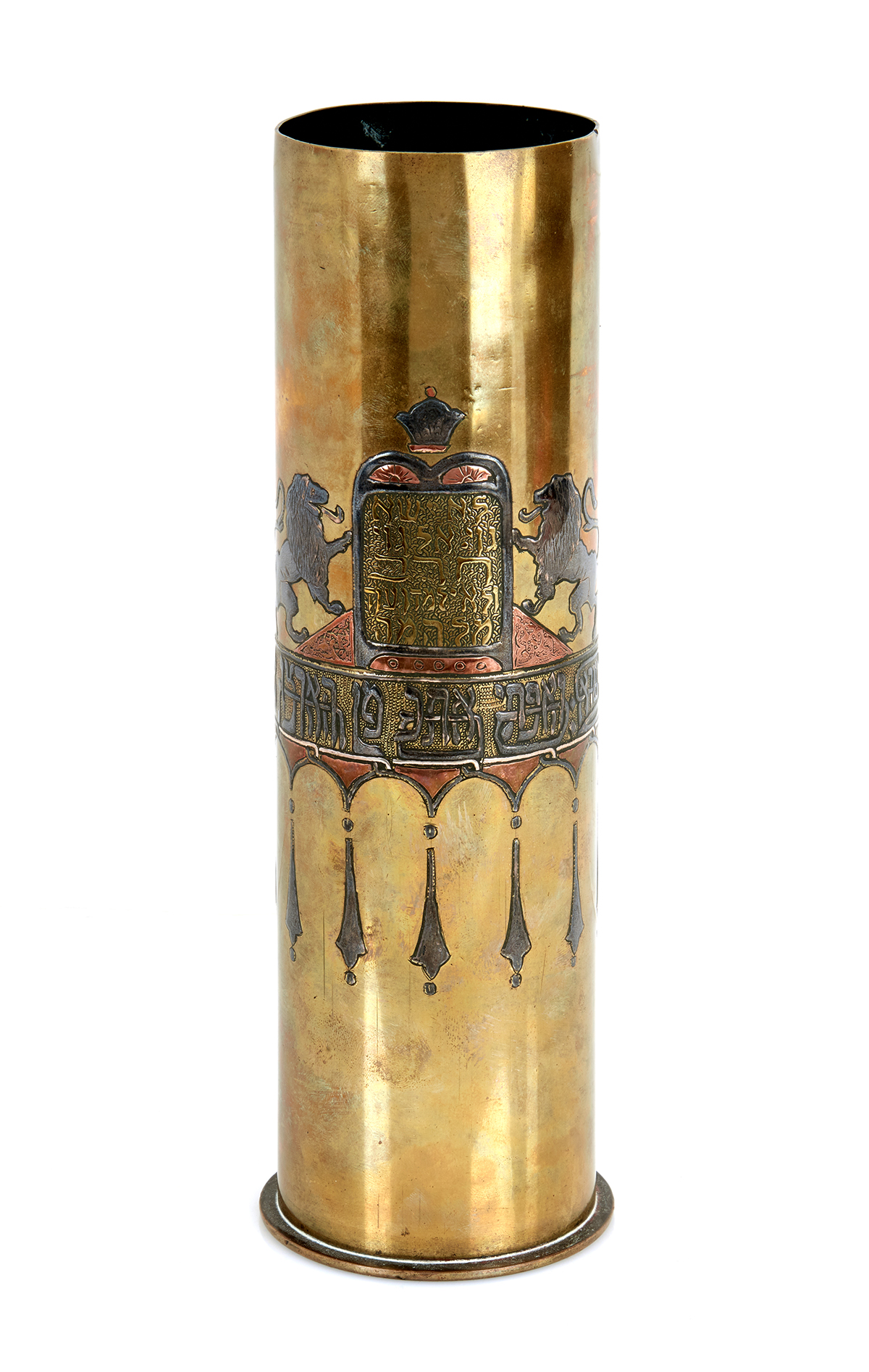 A Trench Art brass shell casing. The casing depicts the Mosque of Omar with a Muslim Sheik in its front courtyard. The top banner has the chased words “Souvenier de Jerusalem 1919”.