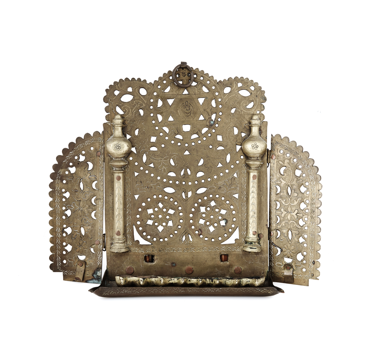 Moroccan brass Hanukkah lamp decorated with a menorah, columns, and verses. It features an arched openwork foliate designed backplate, depicting a seven-branched.