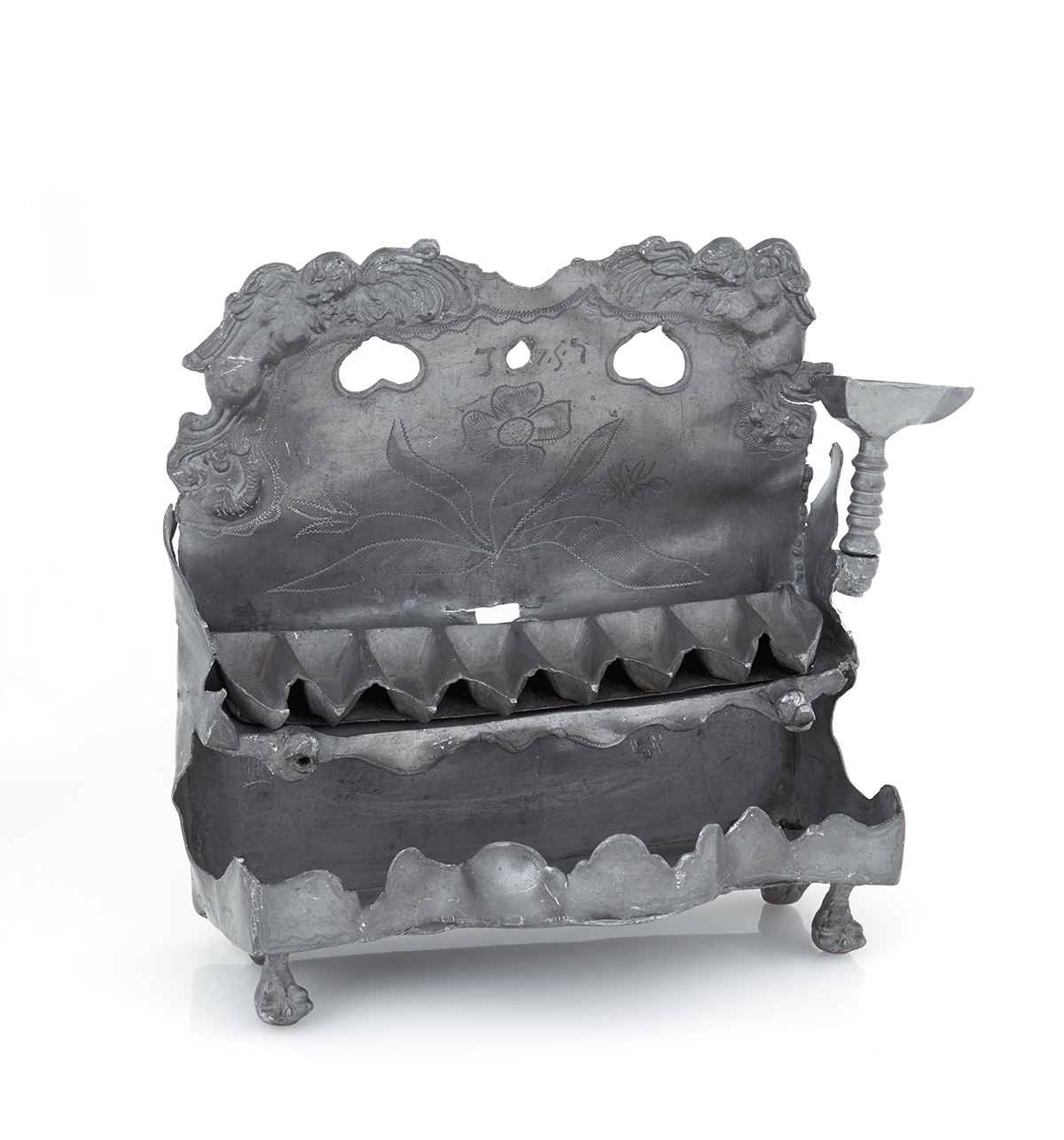 A German pewter Hanukkah lamp, dating from the 18th Century, specifically between 1786 and 1819. Originating from Nördlingen, this piece is a form of Judaica.