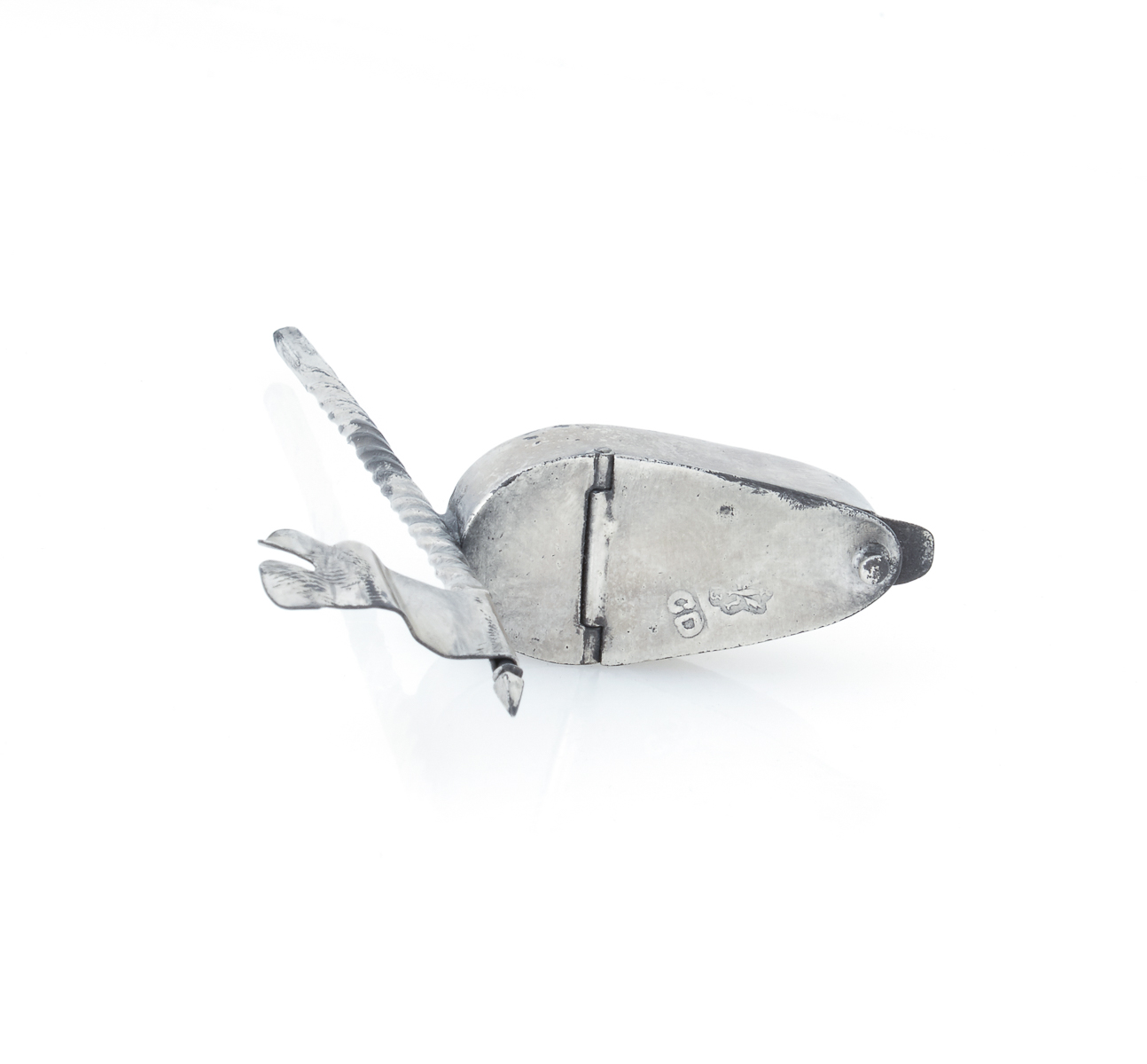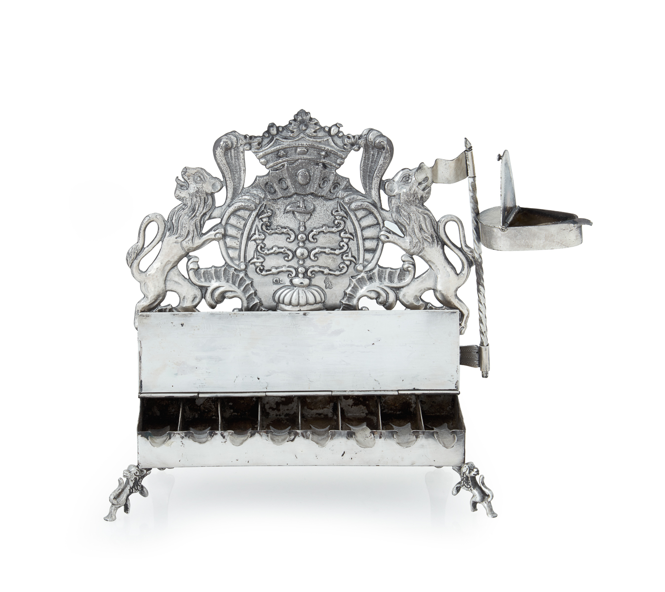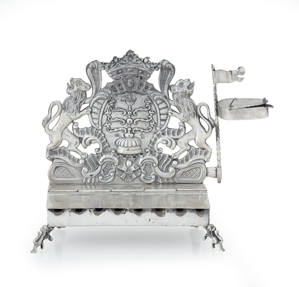 This is a German silver Hanukkah lamp, produced circa 1760 by Herfurth. It measures 17.5cm in height, 23cm in width, and 7cm in depth.