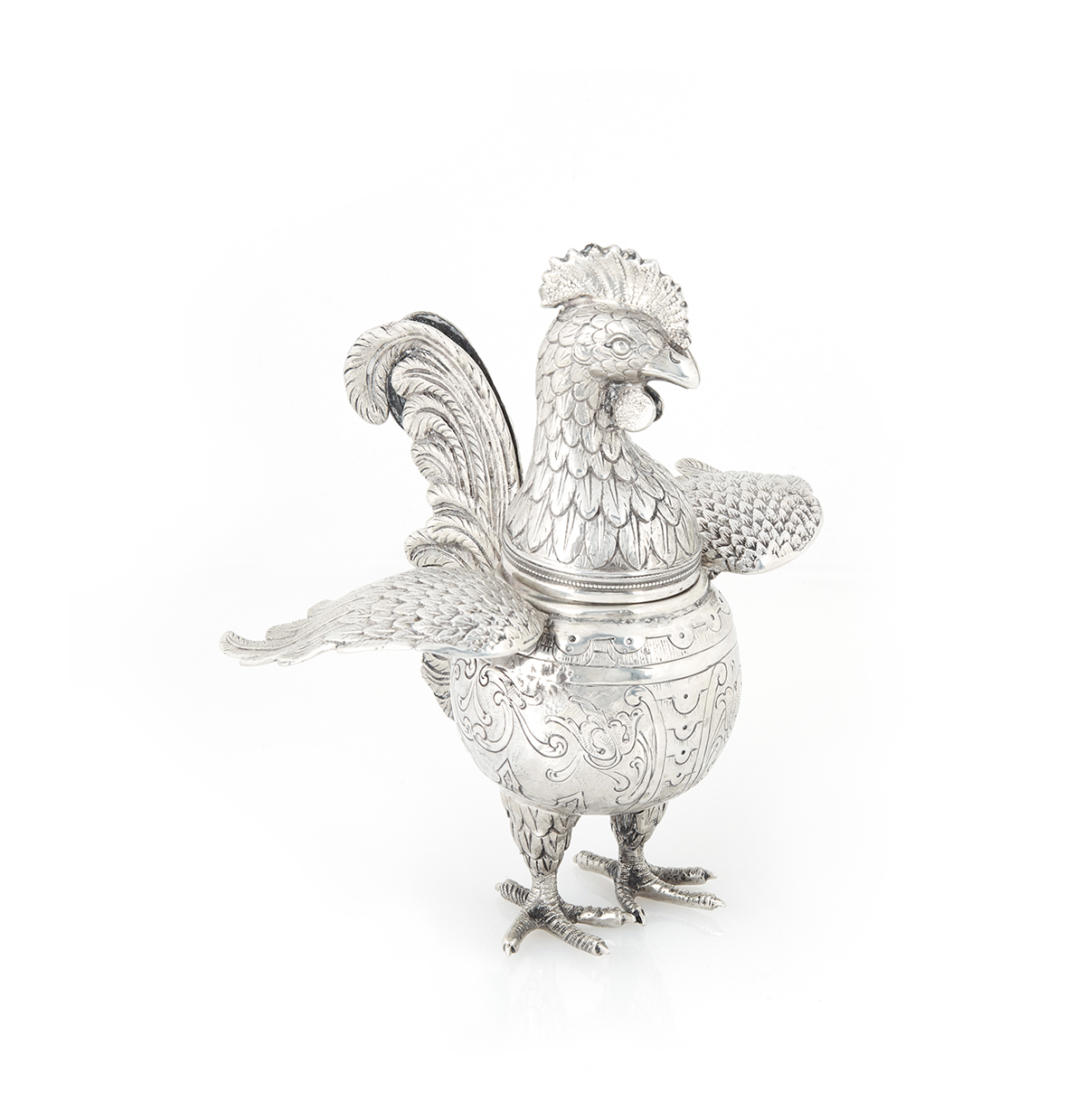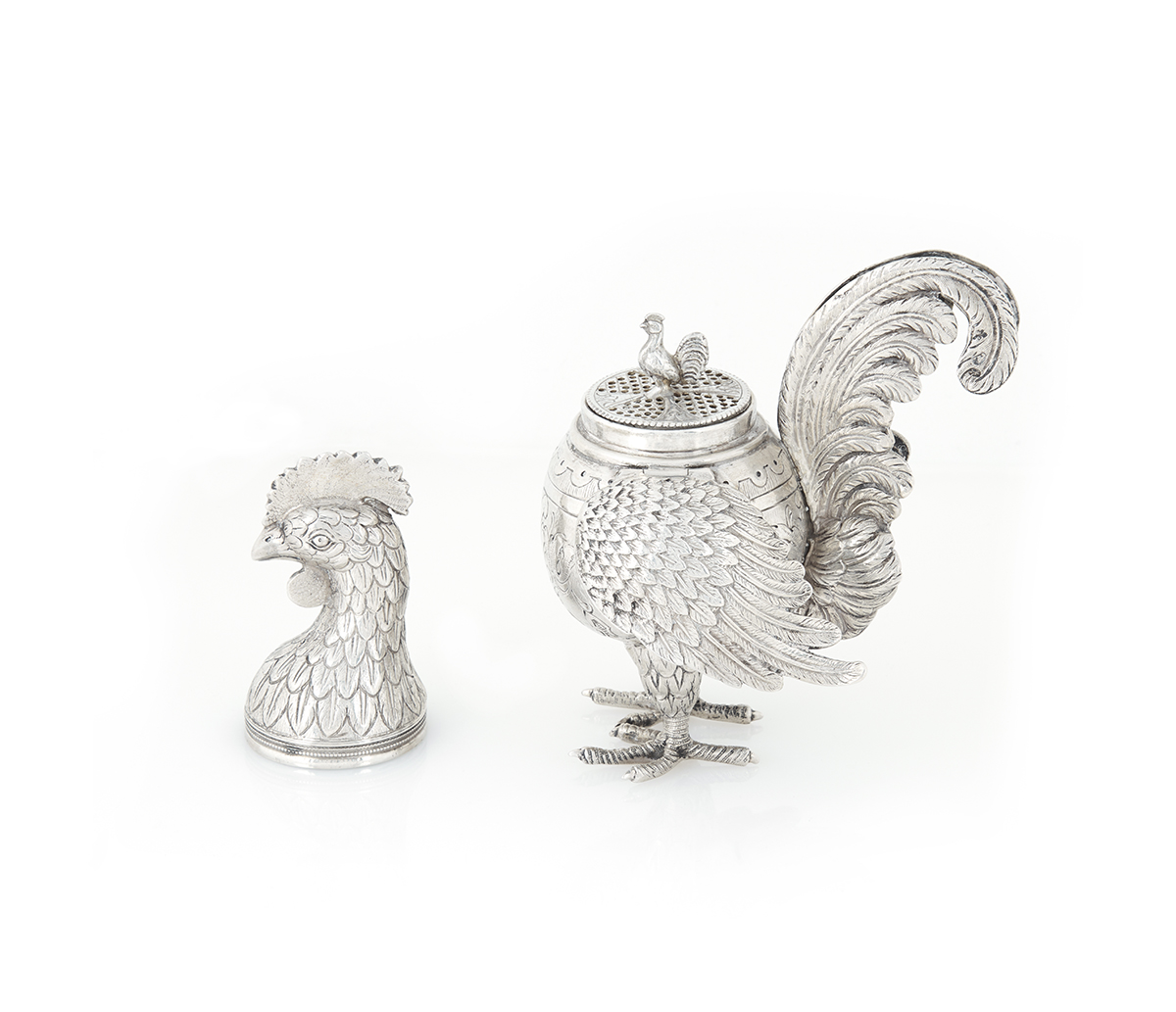 This antique silver and enamel figural rooster container is identified as antique, with a suggested period of circa 1900 and potential German origin. The item takes the form of a figural rooster. Similar items have been identified as spice containers (besamim), cocktail shakers, salt shakers, or sugar boxes.