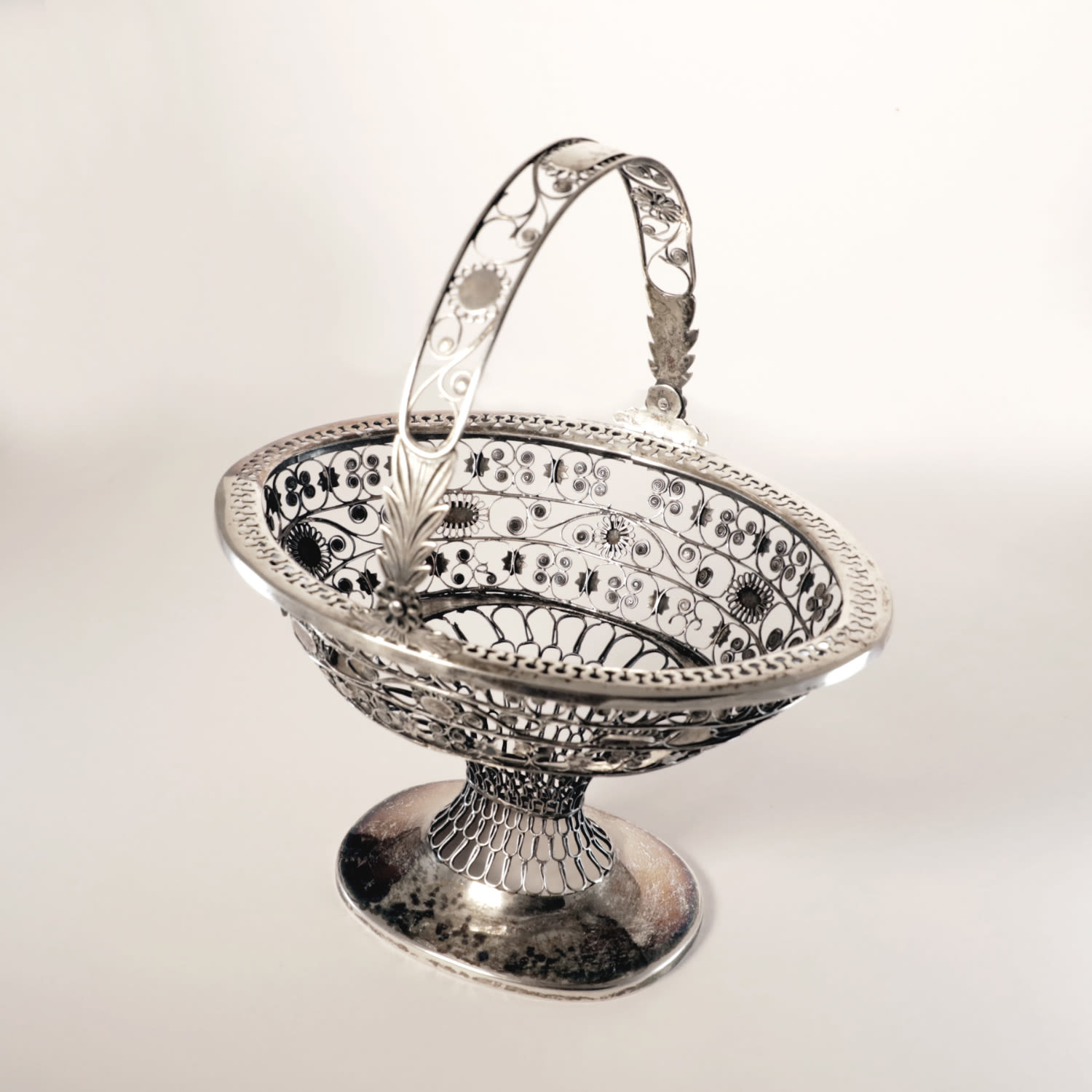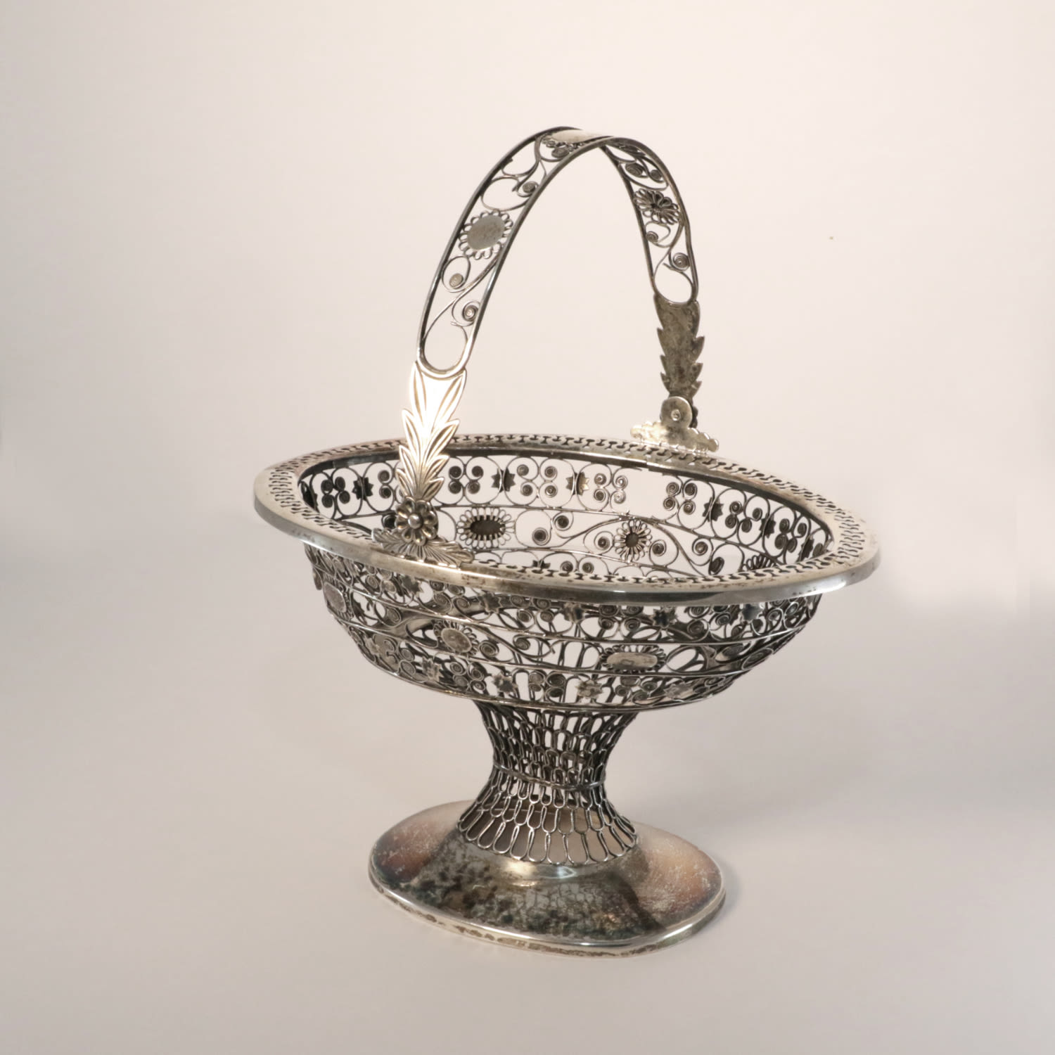 This item is a silver filigree sweets basket with .800 silver content. It is hallmarked to the rim of its foot and is raised on a tall domed base with three scrolled legs. It features a swing handle and a period monogram “MBF.”