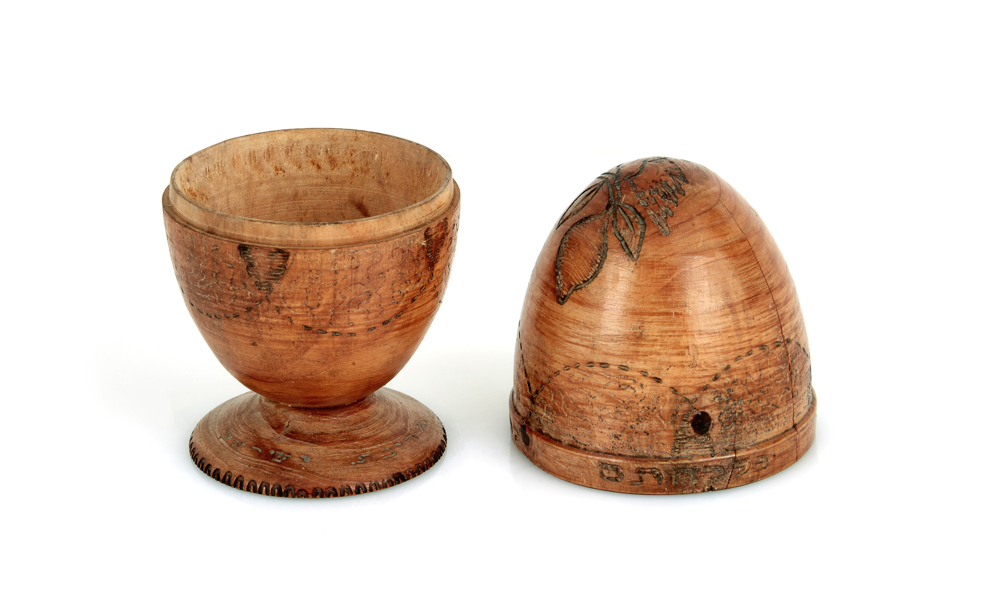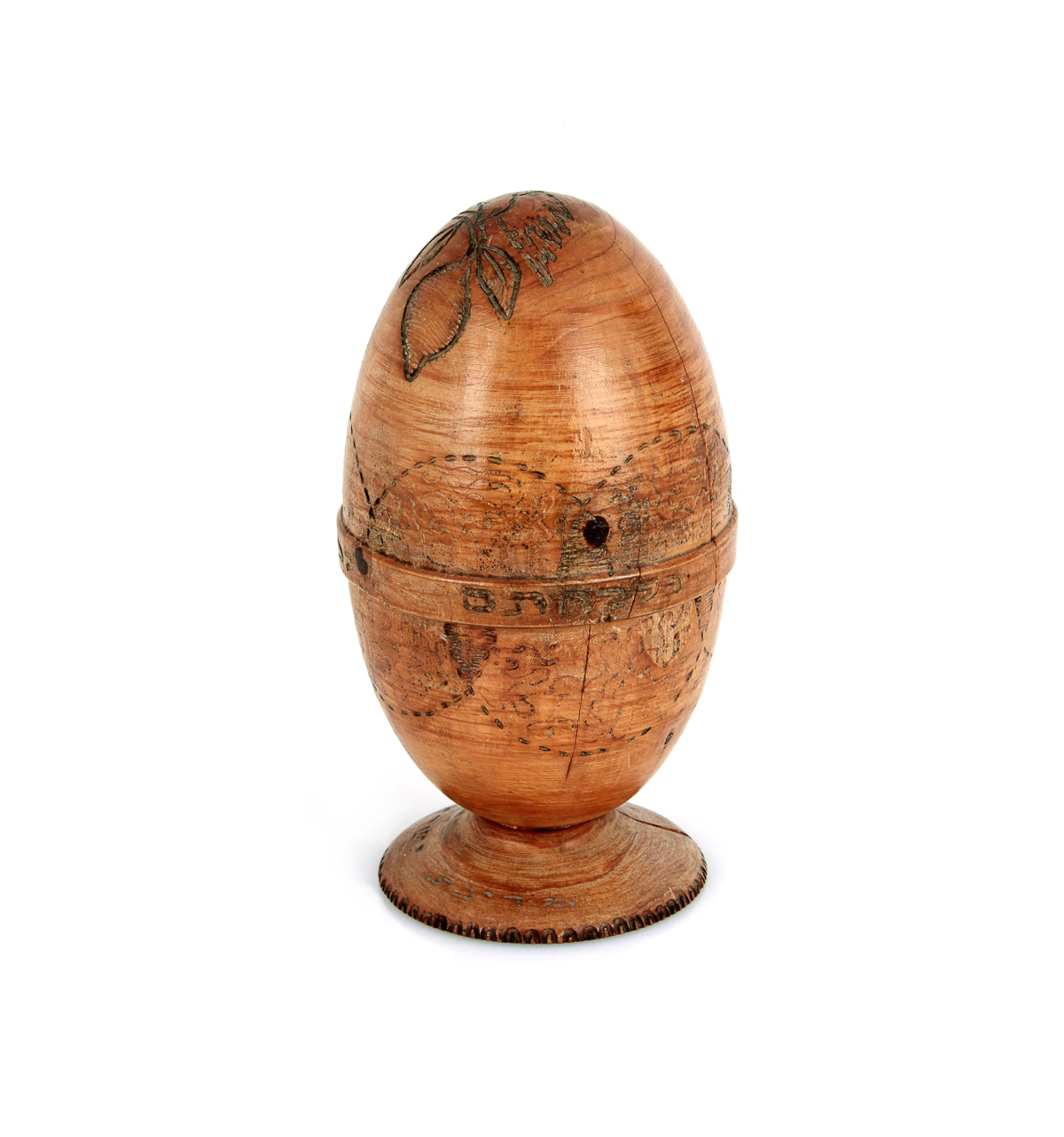 This item is identified as Mauchline Ware, an egg cup designed as a sewing etui box. It features a transfer depicting Guildhall Square, Plymouth.