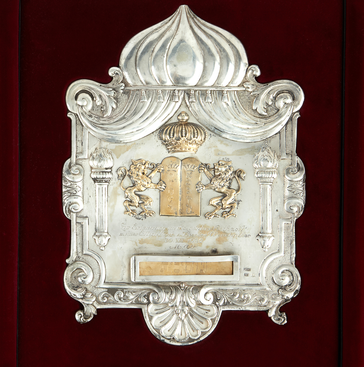 Torah Silver breastplate in Czechoslovakian repoussé silver, circa 1928. High quality embossed and chiseled silver sheet in the shape of a shield, it has two lateral scrolls starting from an oval cartouche with Jewish inscriptions, above which there is a horizontal hollow accessible from the back.
