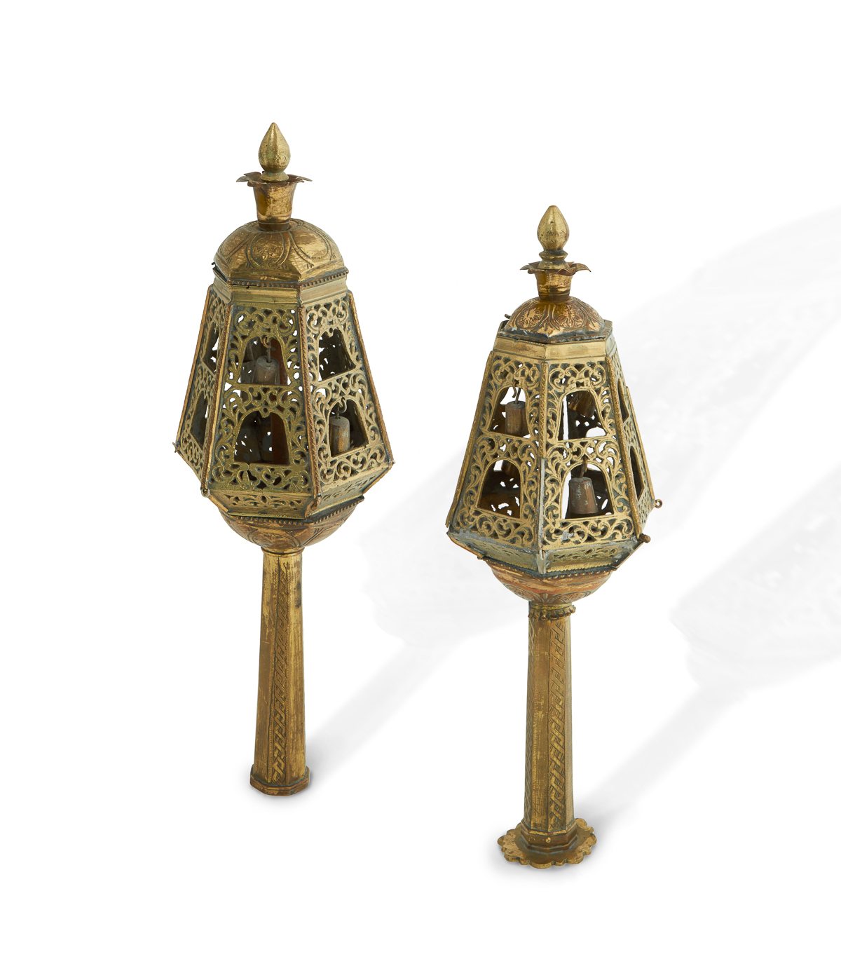 A pair of collectible antique Judaica Torah finials, known as Rimonim. They are crafted from brass and/or copper and feature an ornate, keyhole style.