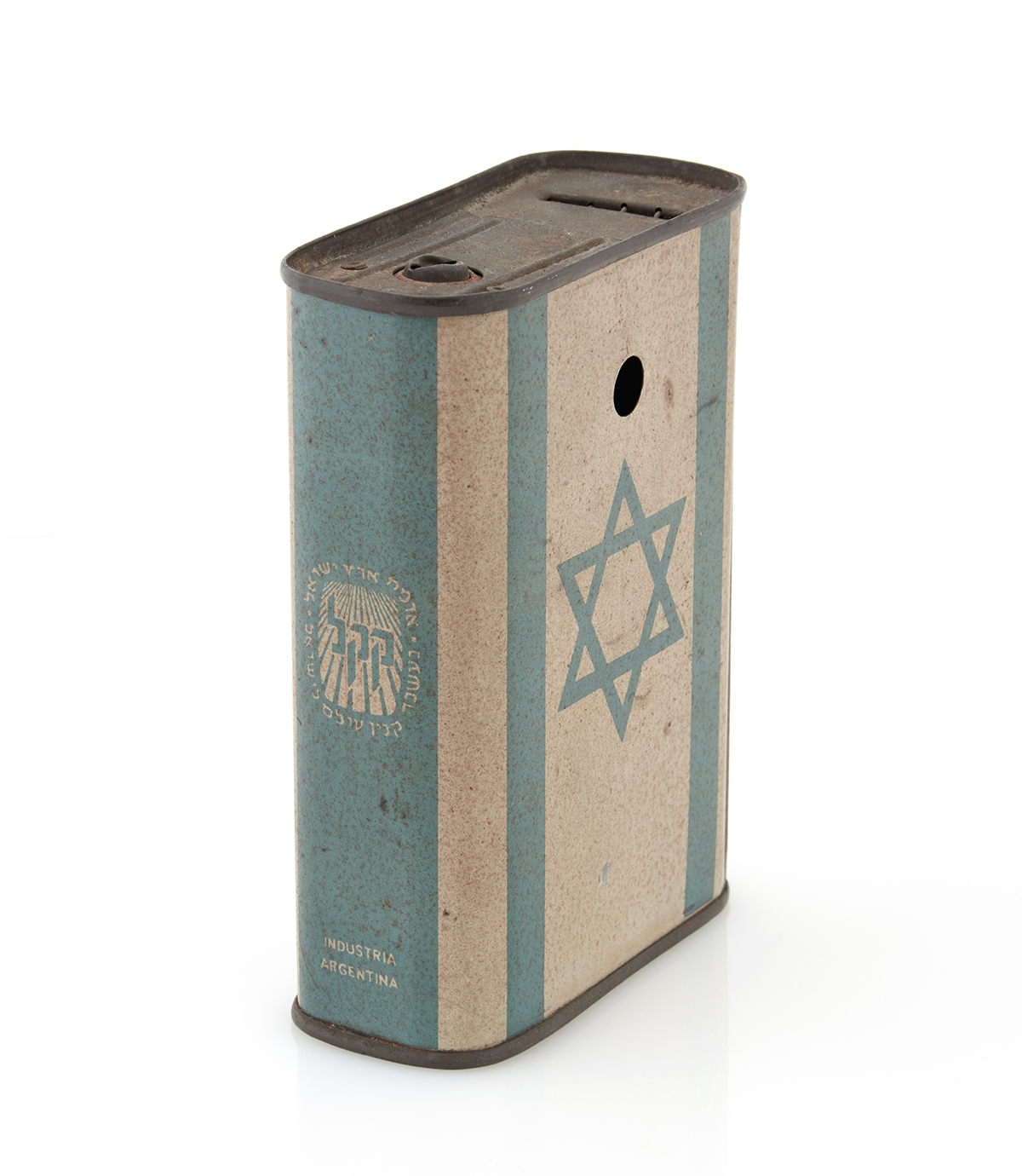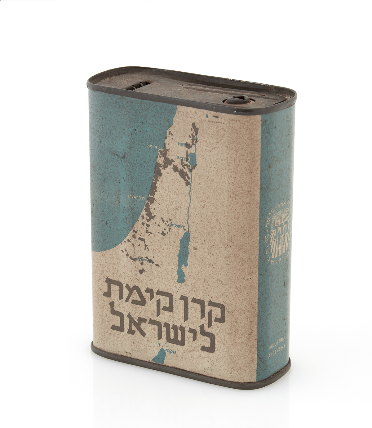 A vintage tin charity box, also referred to as a piggy bank or Tzeduka box. It is associated with the Keren Kayemeth Leisrael (KKL), also known as the Jewish National Fund (JNF). The item is described as rare and dates to the 1950s-60s. It may feature an Israel map or an Eretz Israel flag.