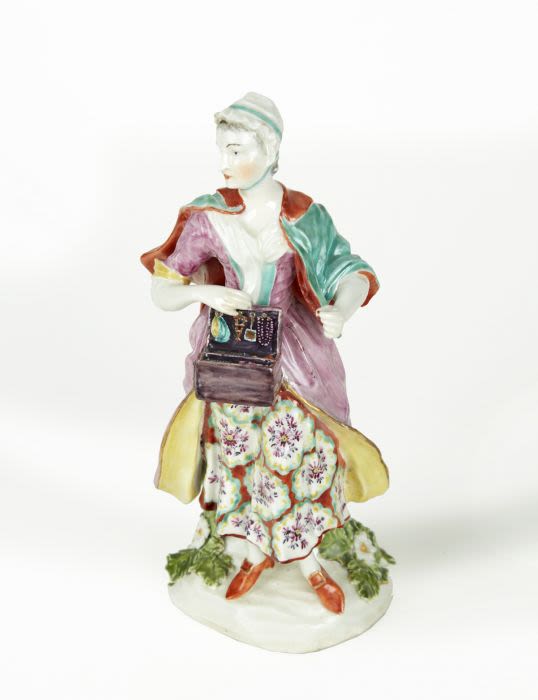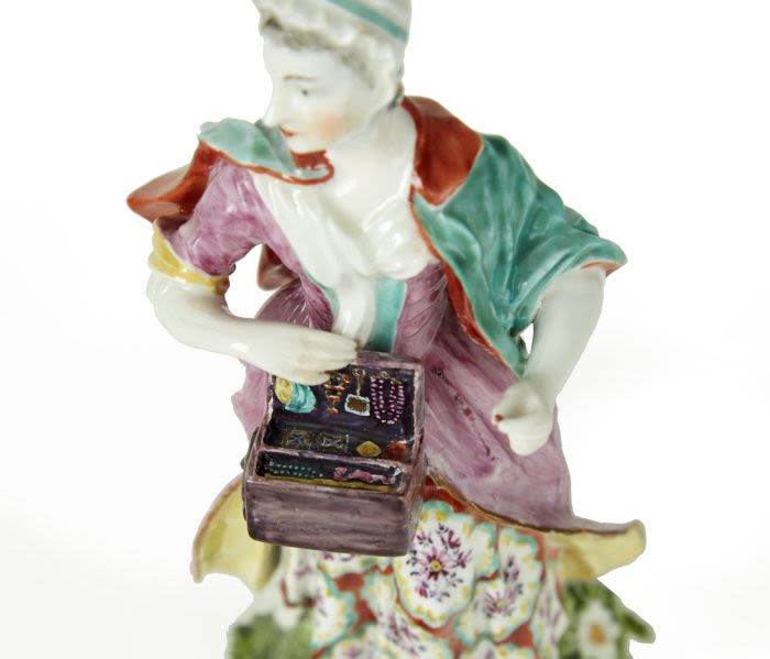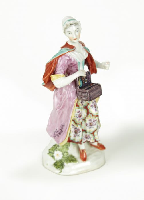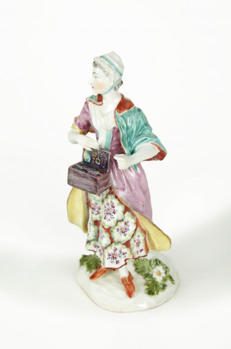 A pair of Derby, England porcelain figures, depicting a Jewish Peddler and his Wife, Circa 1770.