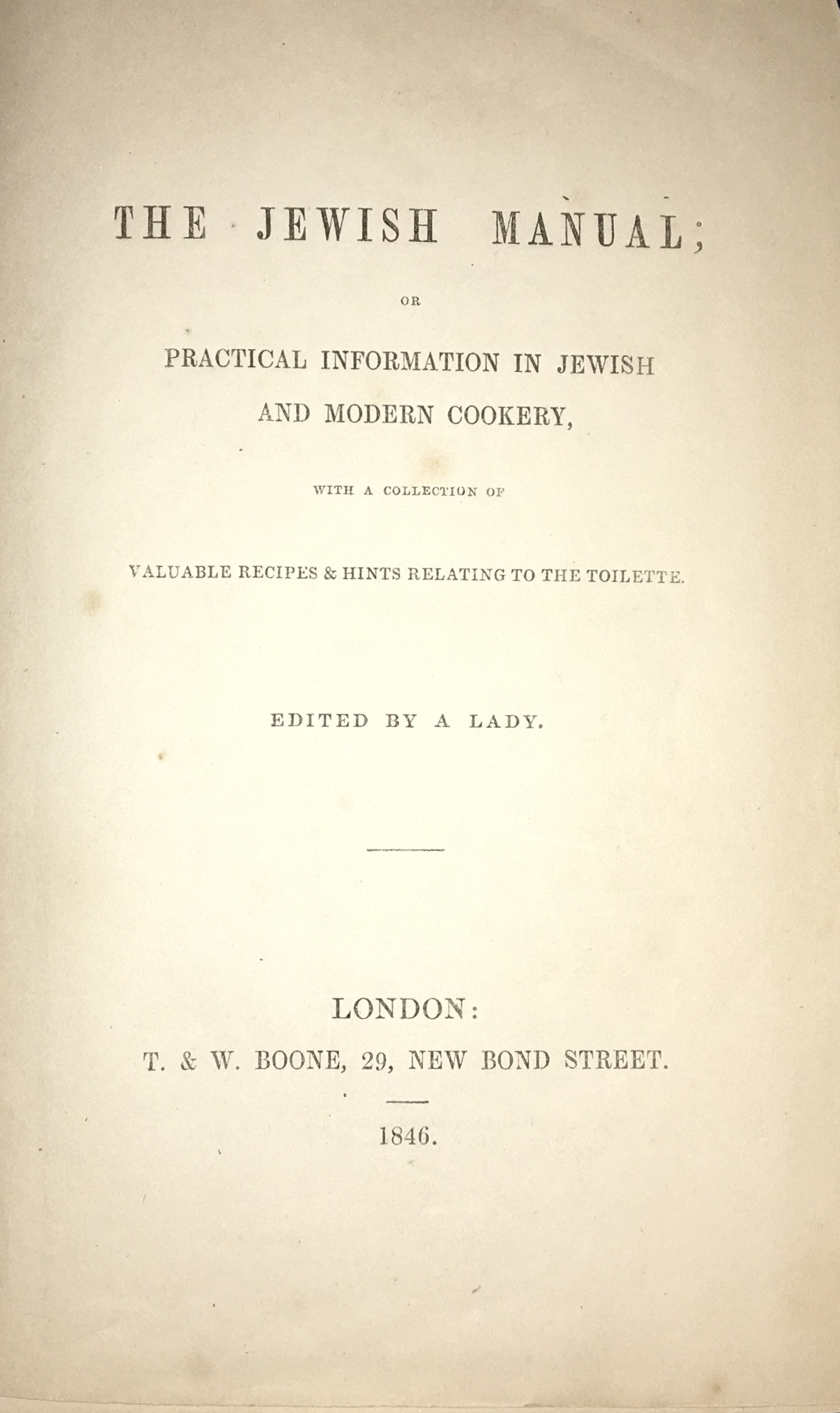 This item is a rectangular paper page, likely a title page from a book. The paper is an off-white or light cream color with dark grey or black printed text. The page displays several lines of centered text in varying font sizes and styles, reading: “THE JEWISH MANUAL; OR PRACTICAL INFORMATION IN JEWISH AND MODERN COOKERY, WITH A COLLECTION OF VALUABLE RECIPES & HINTS RELATING TO THE TOILETTE. EDITED BY A LADY.” This work is identified as a scarce Kosher Cookery book by Lady Montefiore, one of the first British Cookbooks devoted to the Hebrew kitchen, published in London in 1846. The editor, “A LADY,” is identified as Judith, Lady Montefiore.