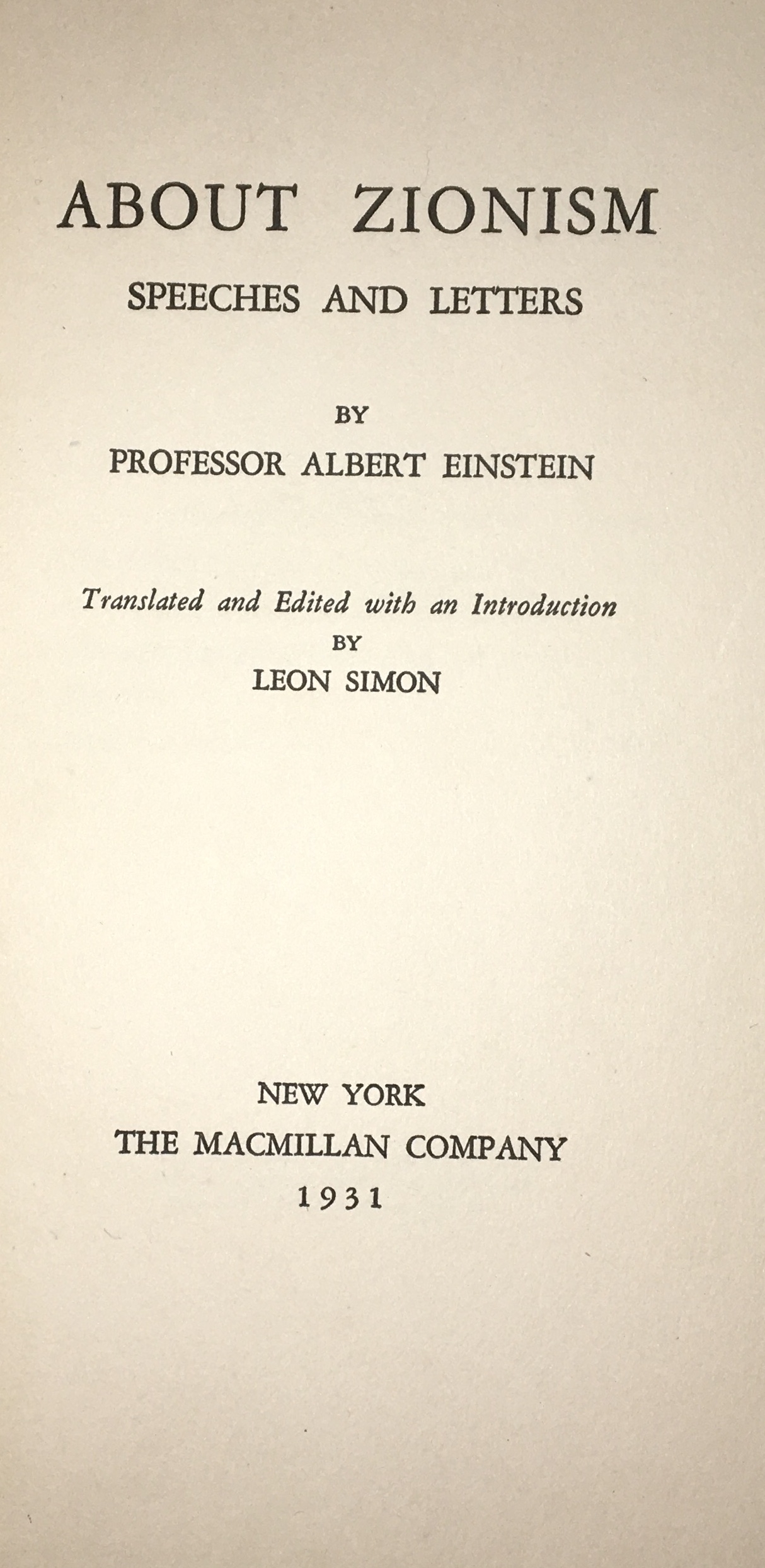 A first edition of “About Zionism: Speeches and Letters” by Professor Albert Einstein, translated and edited by Leon Simon. This volume was published by The Macmillan Company, with publication years noted as 1930 and 1931. The content compiles Einstein’s speeches and letters concerning Zionism.