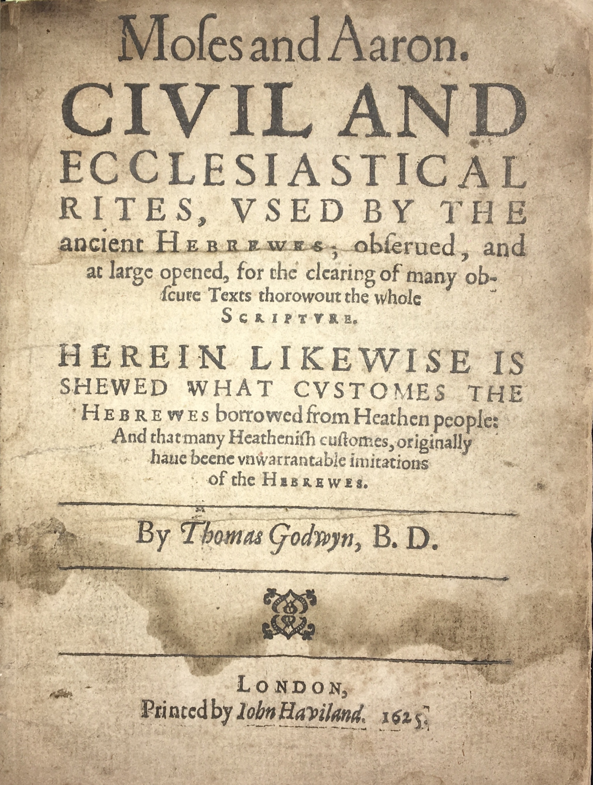 Thomas Godwyn, Moses & Aaron. Civil and Ecclesiastical Rites, Used by the Ancient Hebrewes. This work is described as a hardcover book, with editions noted from 1626 (2nd Edition) and 1655. It is presented as a text for clearing obscure texts throughout the whole Scripture, with these texts added at the end. It is associated with “Rare Antiquarian Books.”