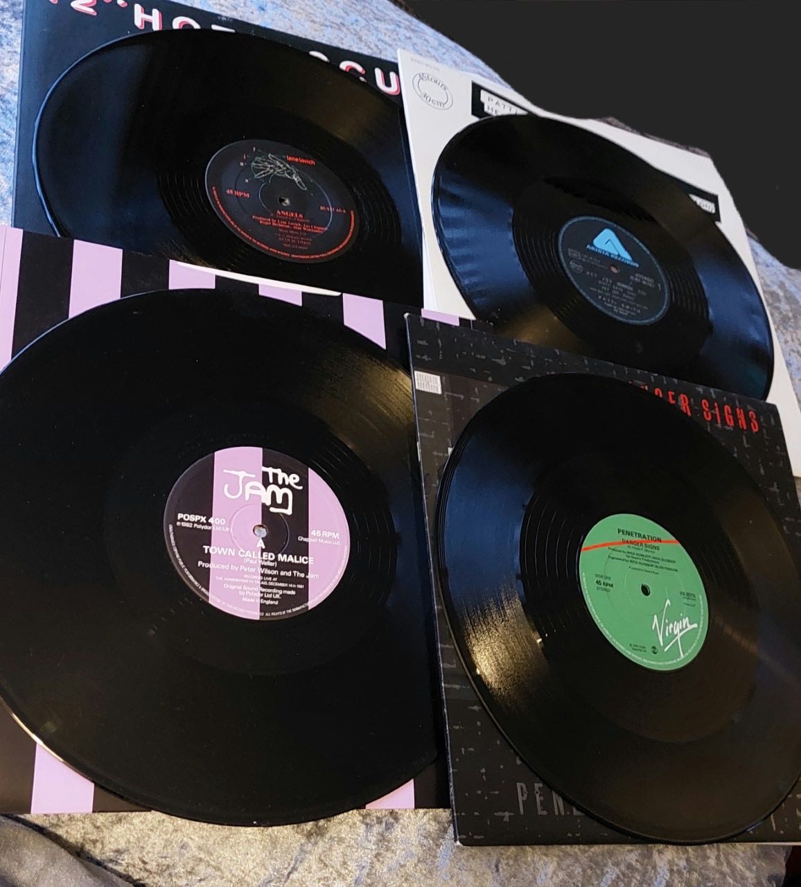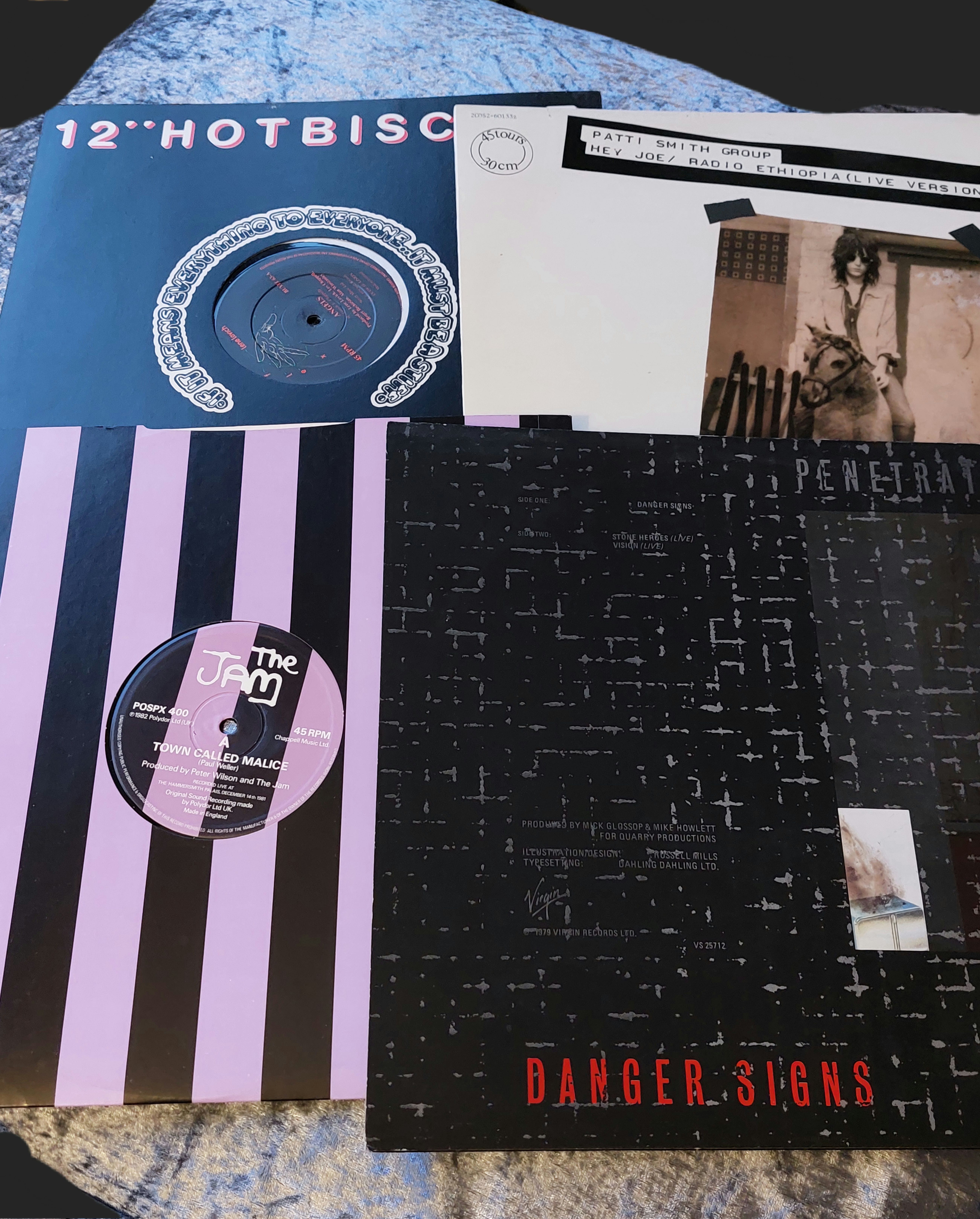 This lot comprises four 12-inch vinyl records. Three sleeves display graphic designs: one black and white, one with pink and black stripes, and one with black text on a dark background. The fourth sleeve is predominantly white. Visible text identifies artists including The Jam (“A Town Called Malice”), Patti Smith Group (“Hey Joe / Radio Ethiopia (Live Version)”), and Penetration (“Danger Signs”). Record labels include Virgin. The records appear to be black vinyl.