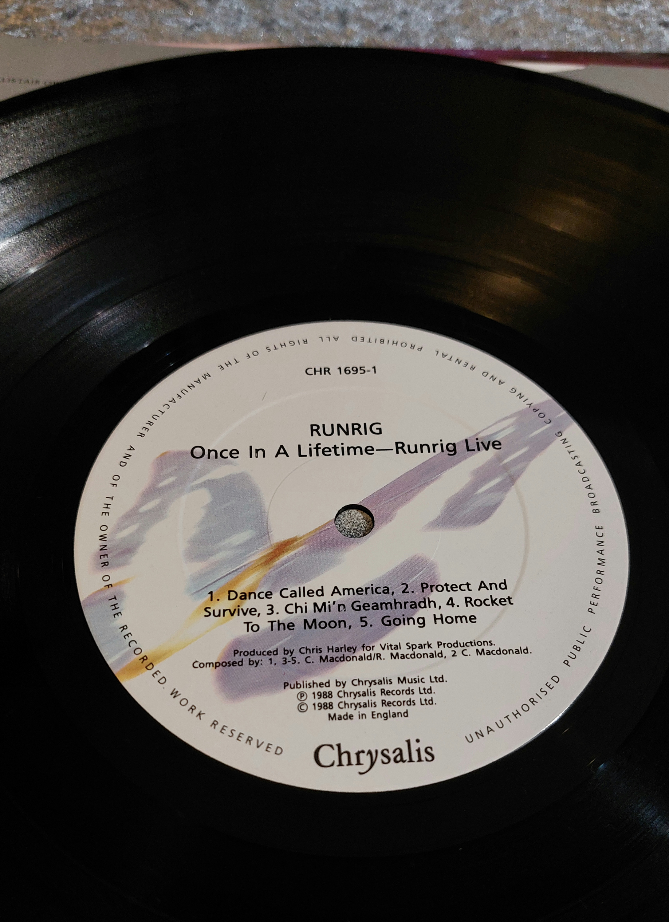 This vinyl LP record features a predominantly black album cover with a magenta/purple band at the bottom. The band’s name “Runrig” and the album title “Once In A Lifetime – Live” appear in white lettering. A rectangular logo containing stylized mountains and the word “RUNRIG” is centrally placed. The record label is black with white text, listing the title, track list, production details, copyright information (© 1988 Chrysalis Records Ltd.), and catalog number CHR 1695-1. The vinyl itself appears to have minimal wear based on the provided images.