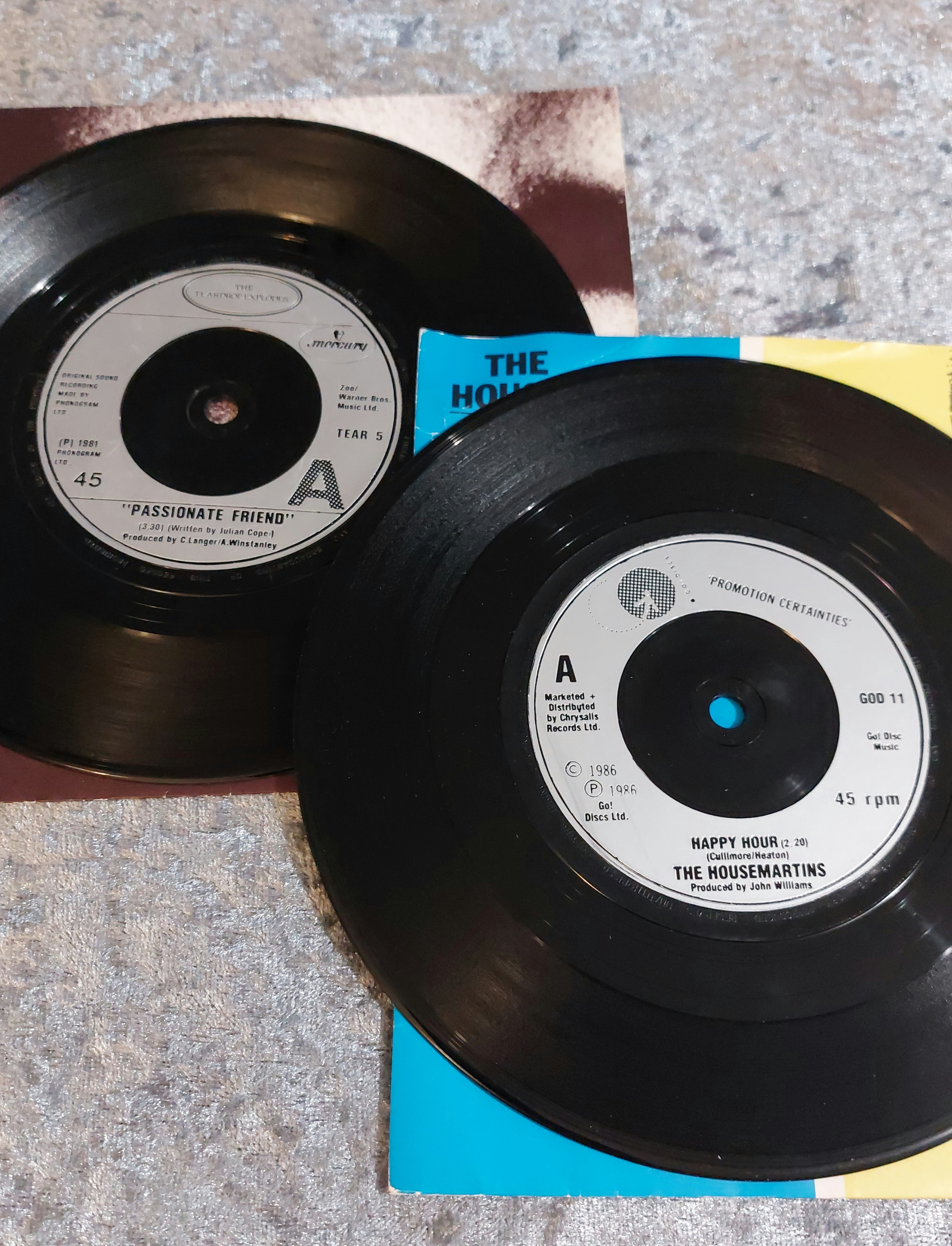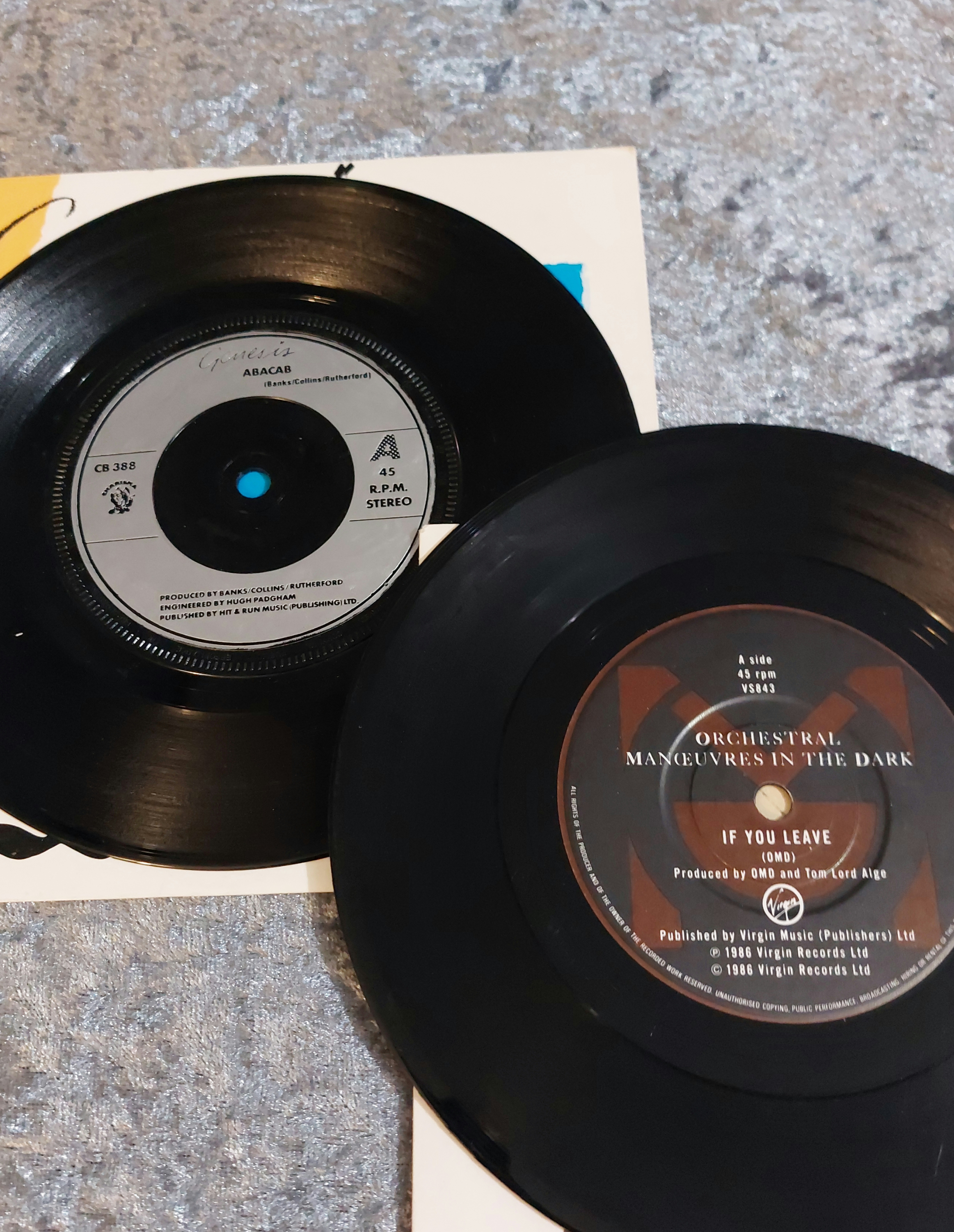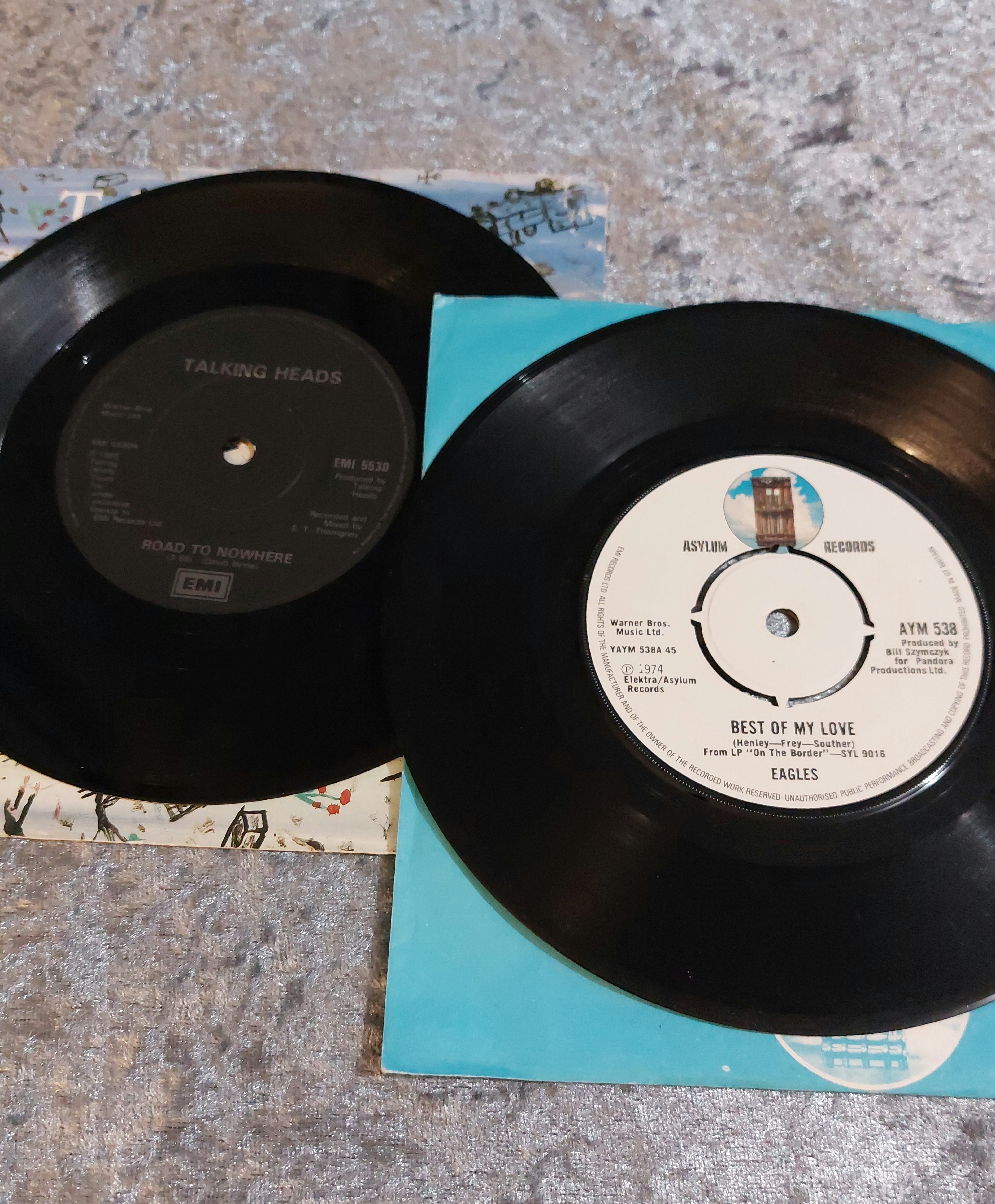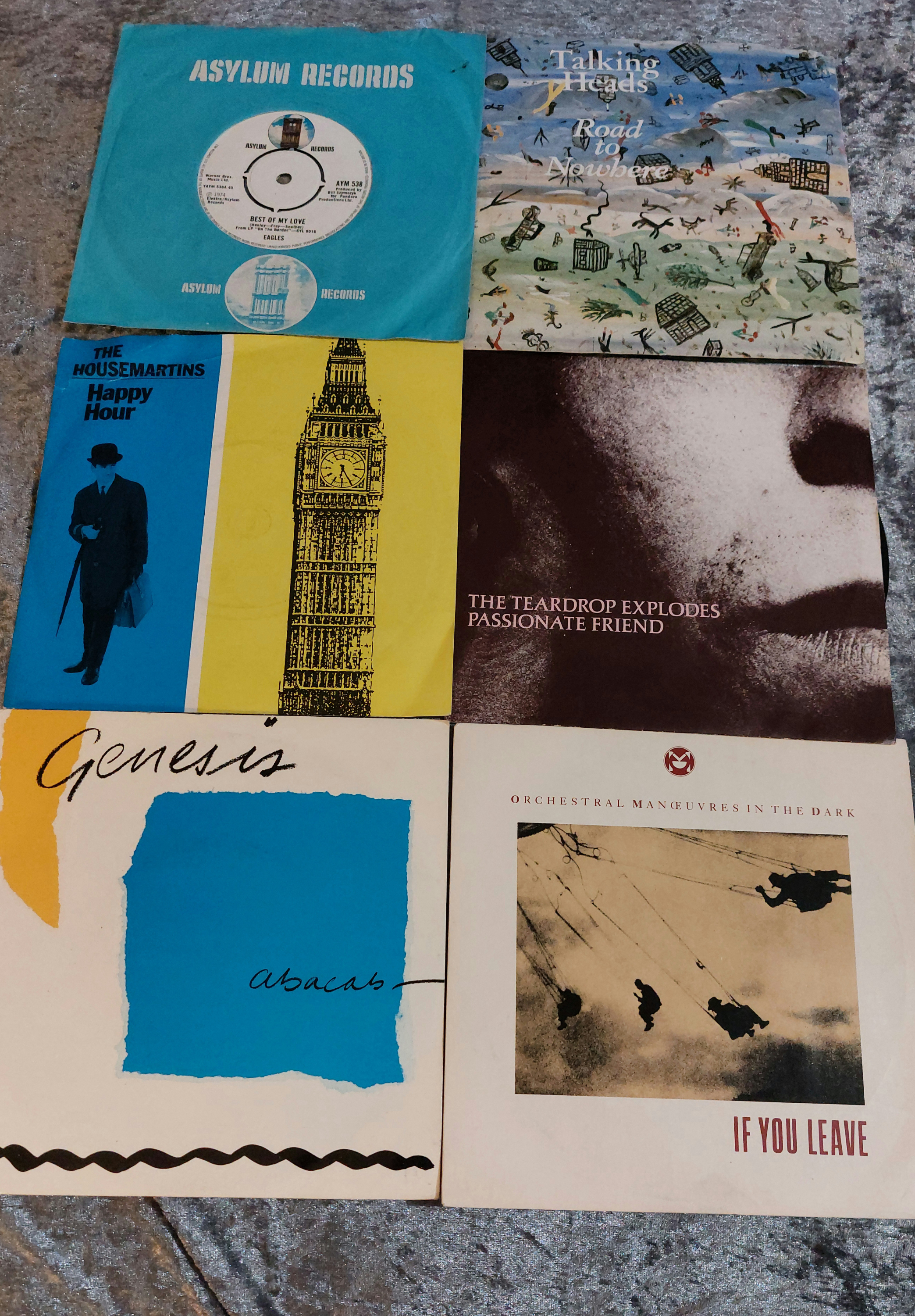 A collection of eight 7-inch vinyl singles featuring various artists, including Talking Heads, Eagles, The Housemartins, Genesis, Orchestral Manoeuvres in the Dark, and The Teardrop Explodes. The records appear to be in generally good condition and are housed in their original picture sleeves, which exhibit a range of styles and designs. Labels include artist and song titles, record company logos (Asylum, EMI, Virgin), production details, and catalog numbers. The singles appear to date from the late 1970s to the 1980s.