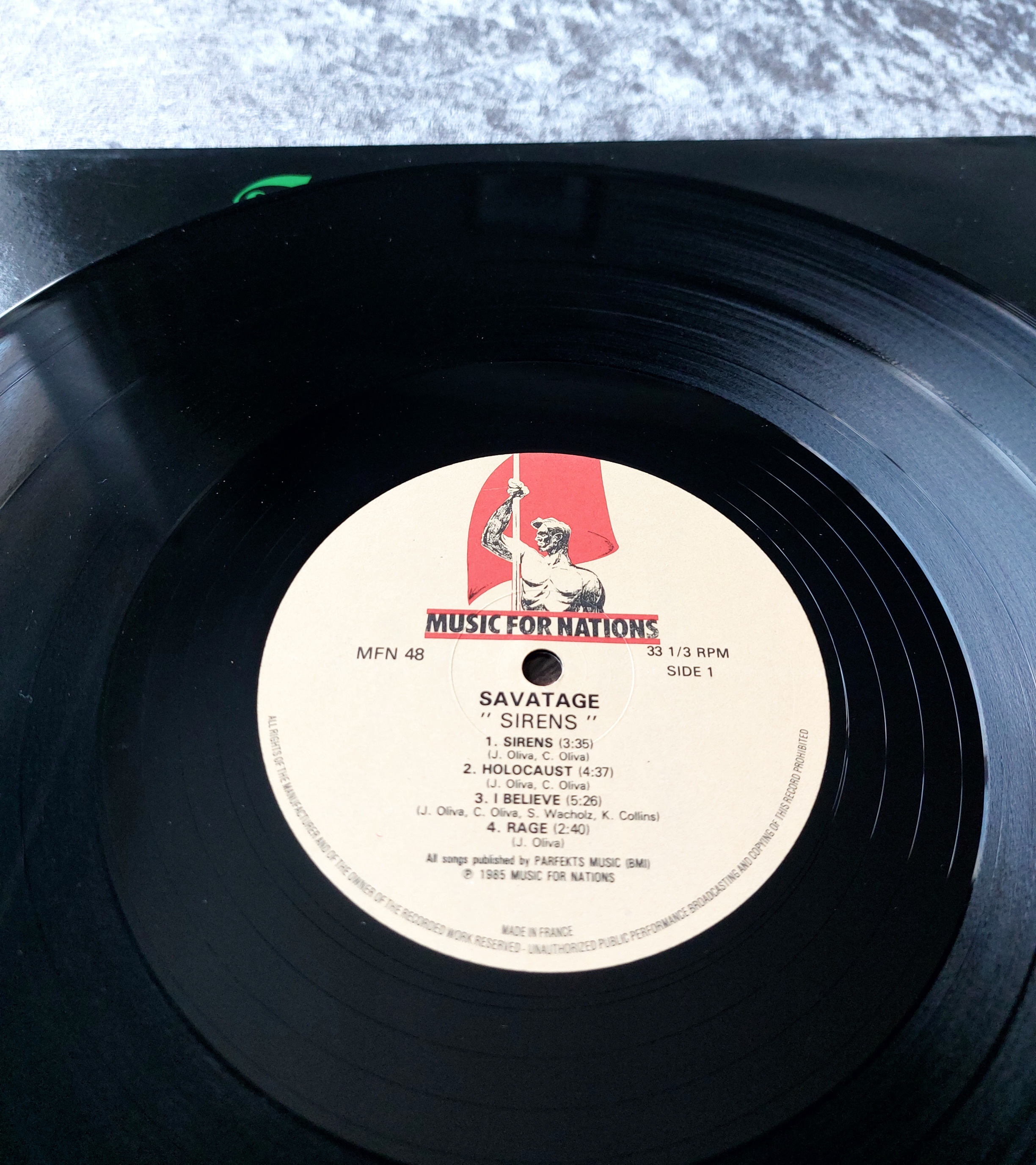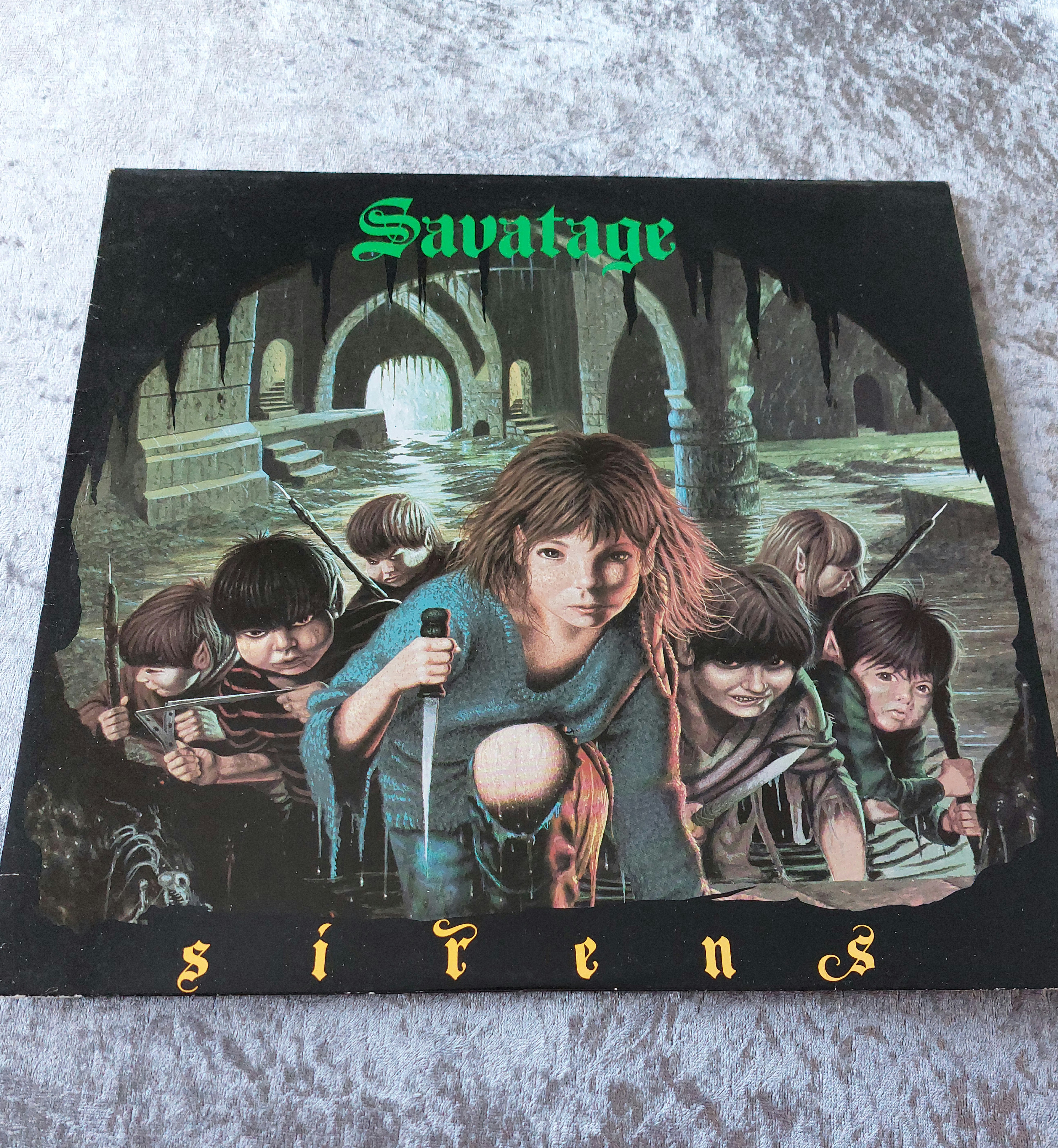 Vinyl LP record of Savatage’s album “Sirens,” released by Music for Nations (catalog number MFN 48). The cover features fantasy artwork depicting children in a cavernous setting. The record label confirms the album title, track listing, and credits. Made in France.