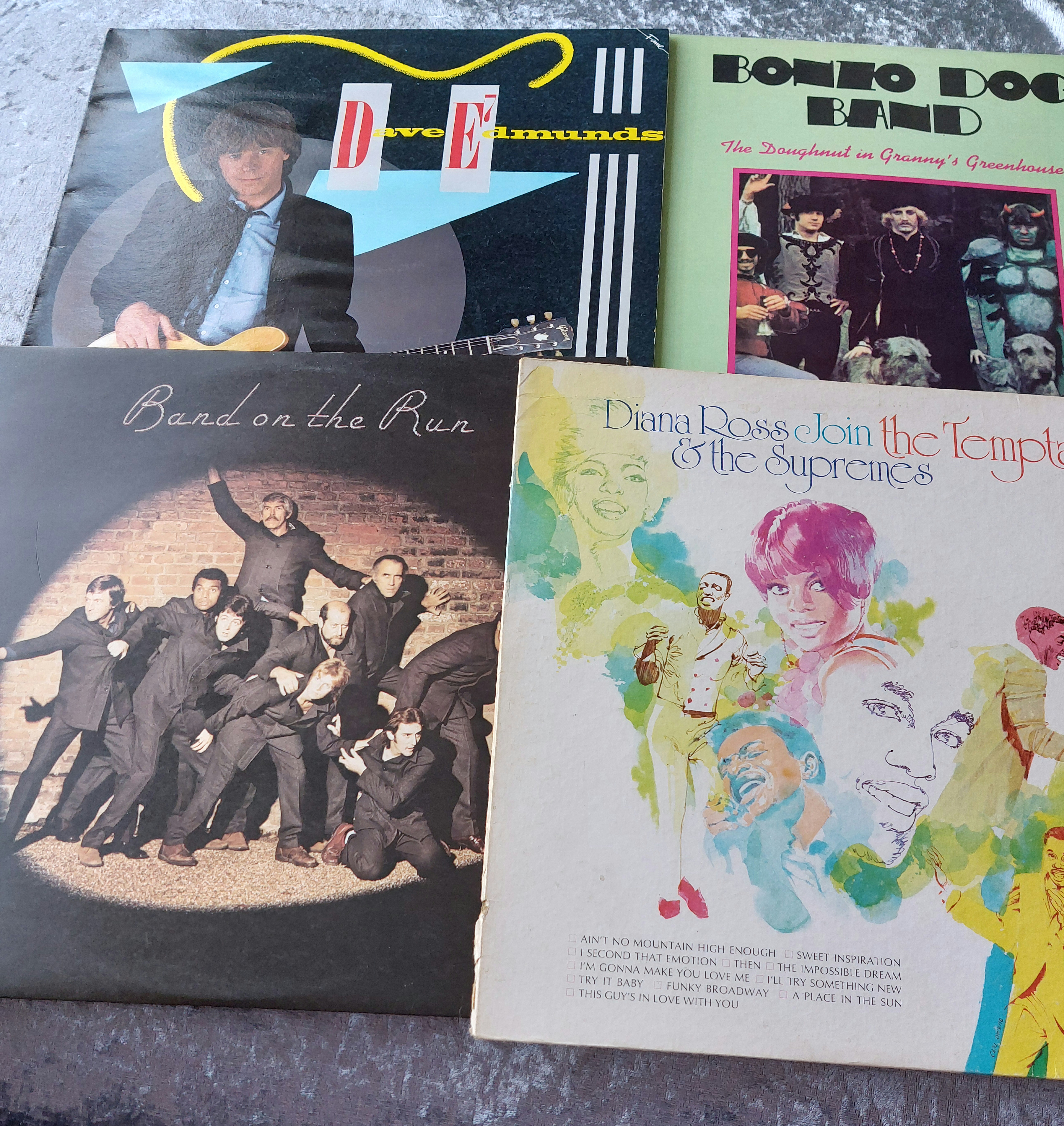 This lot comprises four vinyl LP records spanning the 1960s-1980s. Included are albums by Paul McCartney and Wings (“Band on the Run”), Dave Edmunds, Diana Ross & The Supremes, and The Bonzo Dog Band (“The Doughnut in Granny’s Greenhouse”). The records and covers show varying degrees of wear. Labels and copyright information are visible on the records.