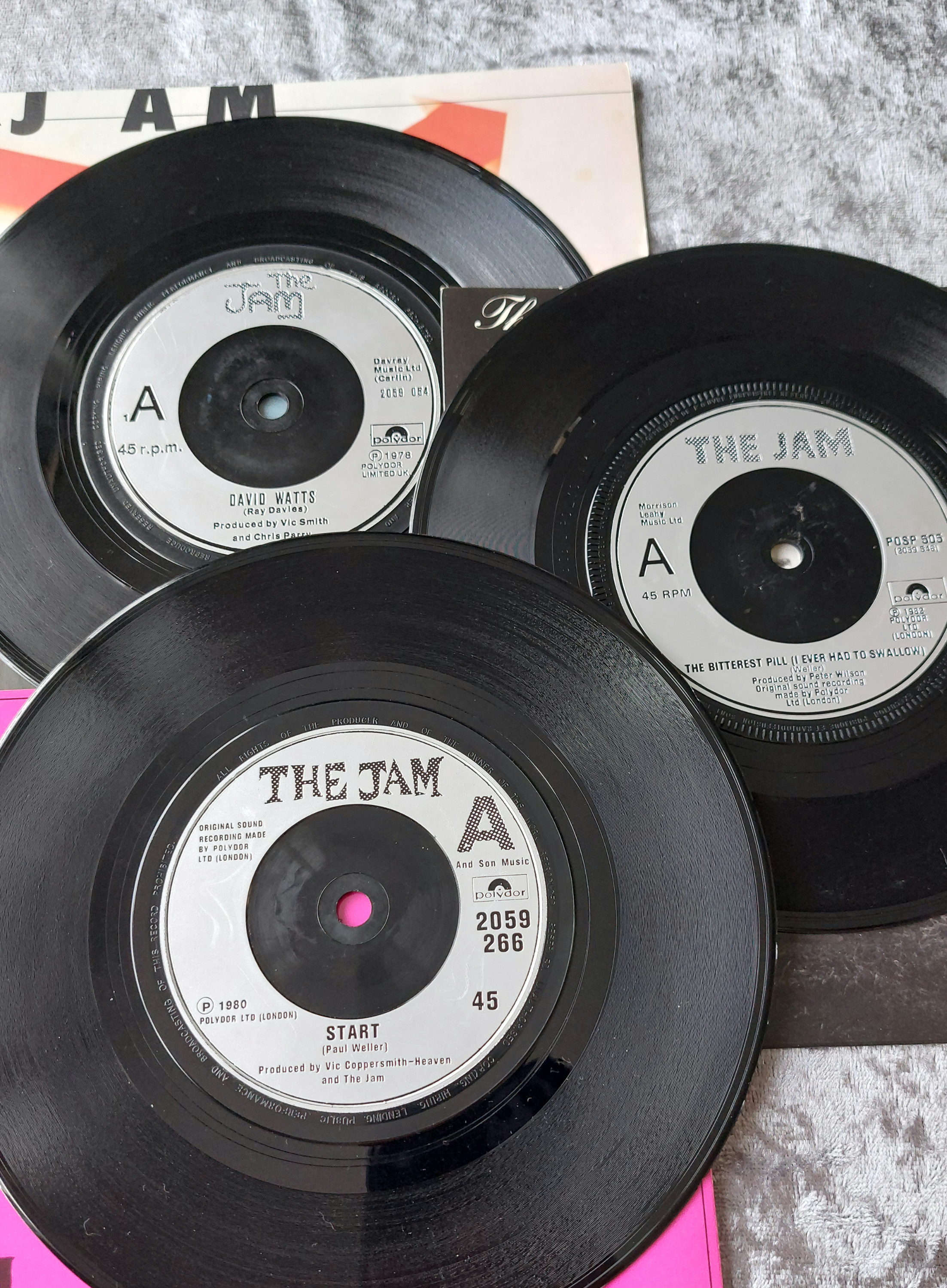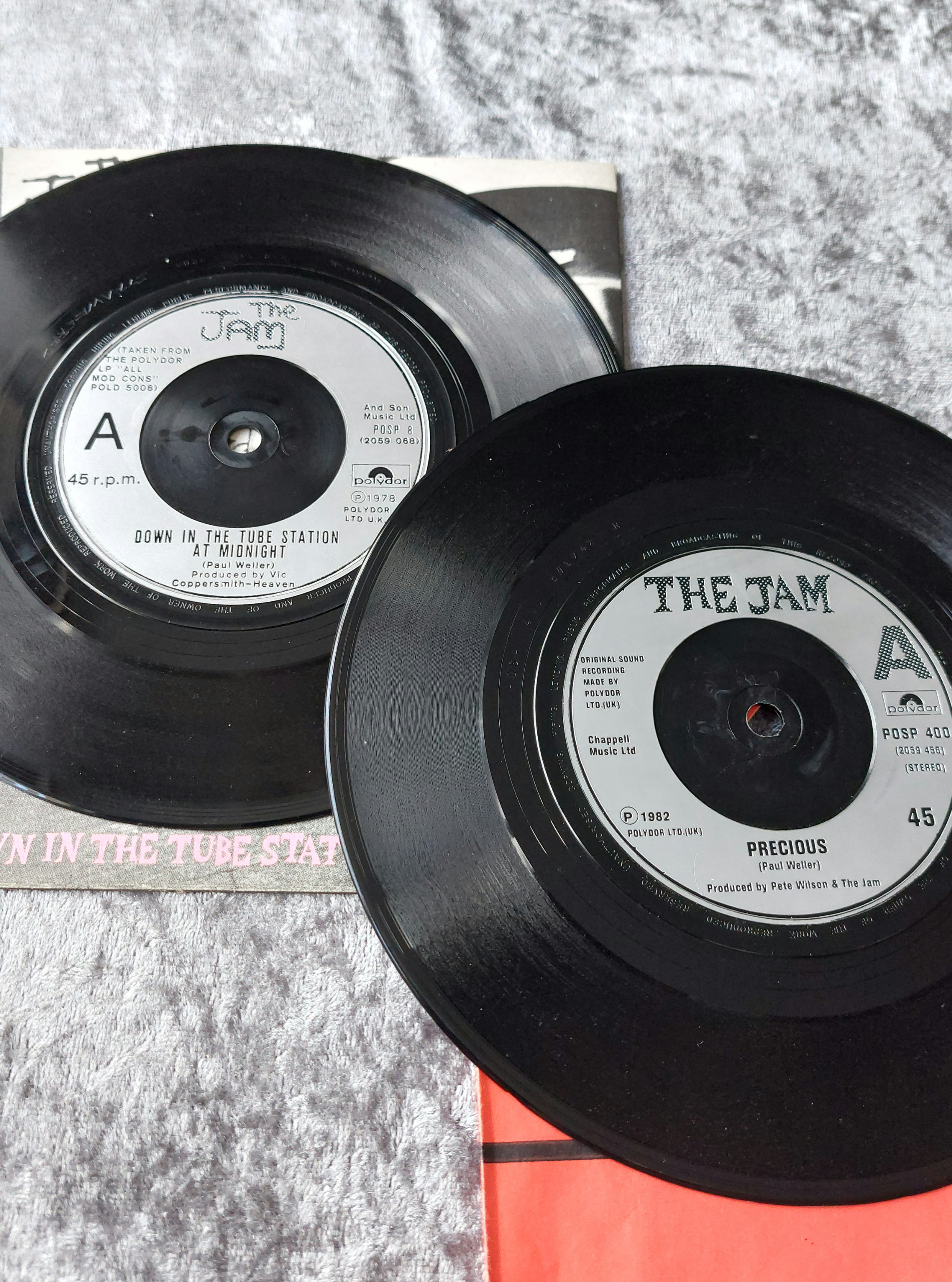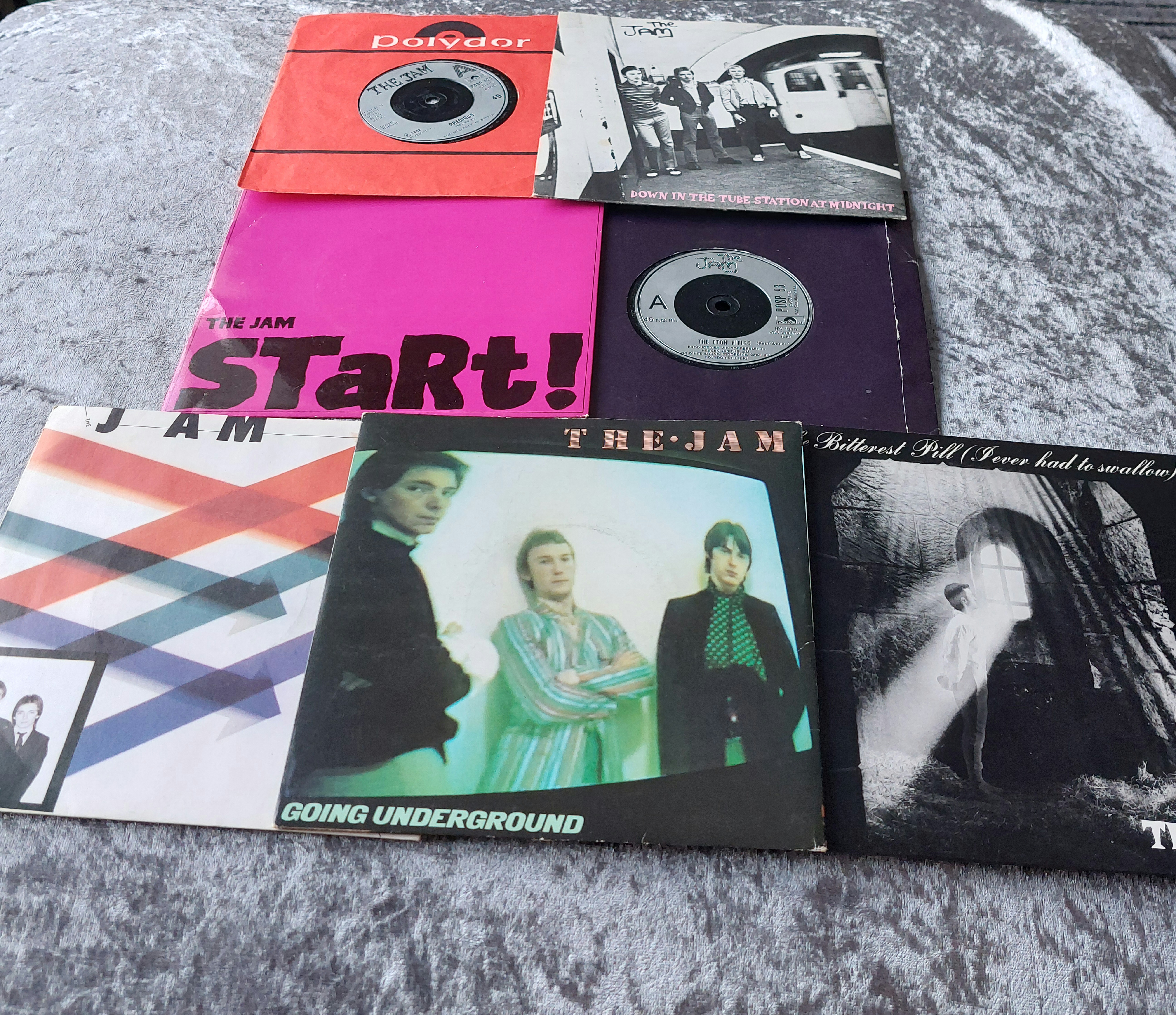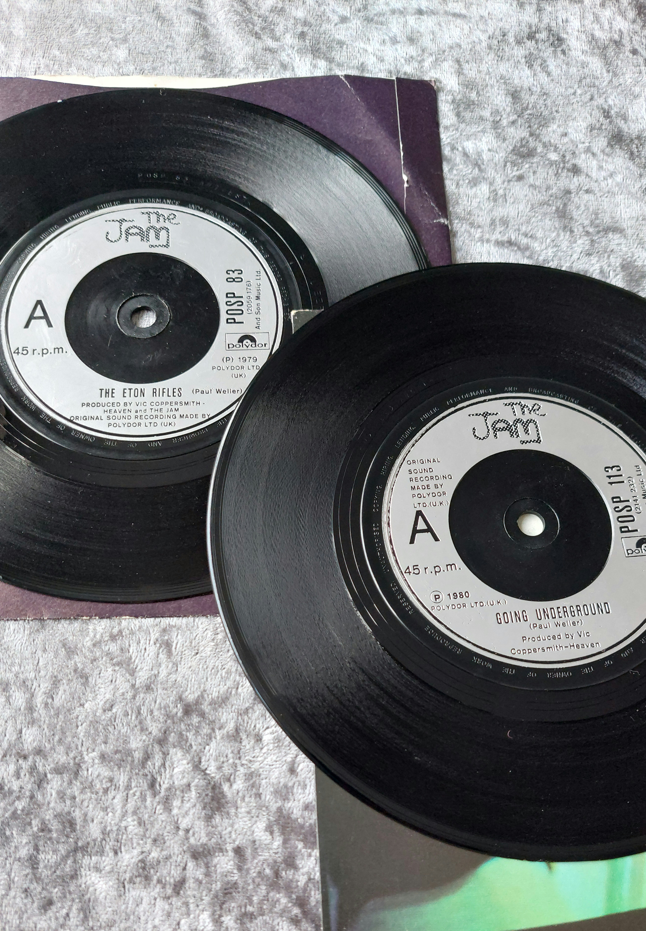 A collection of eight 7-inch vinyl records by The Jam, including “Down in the Tube Station at Midnight,” “Going Underground,” “Start!,” and “The Eton Rifles.” The records are black vinyl with printed labels featuring song titles, band name, Polydor record company information, and catalog numbers. The picture sleeves are included and exhibit varying degrees of wear, including creasing and discoloration.