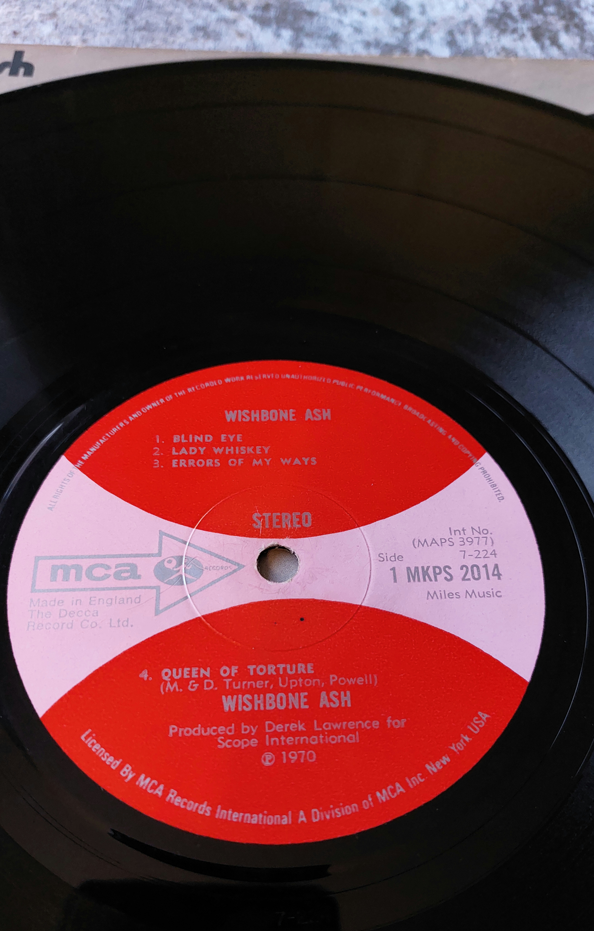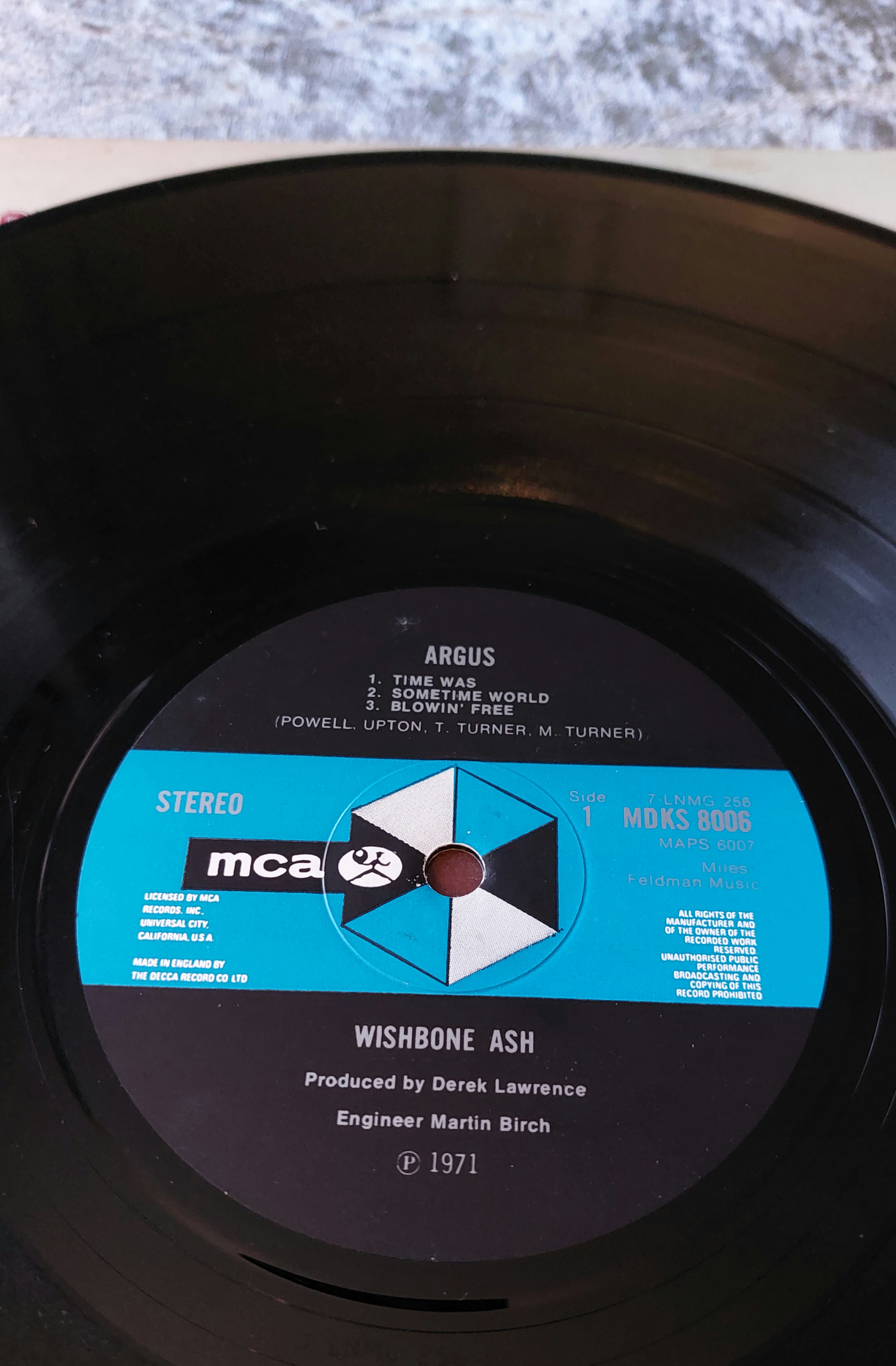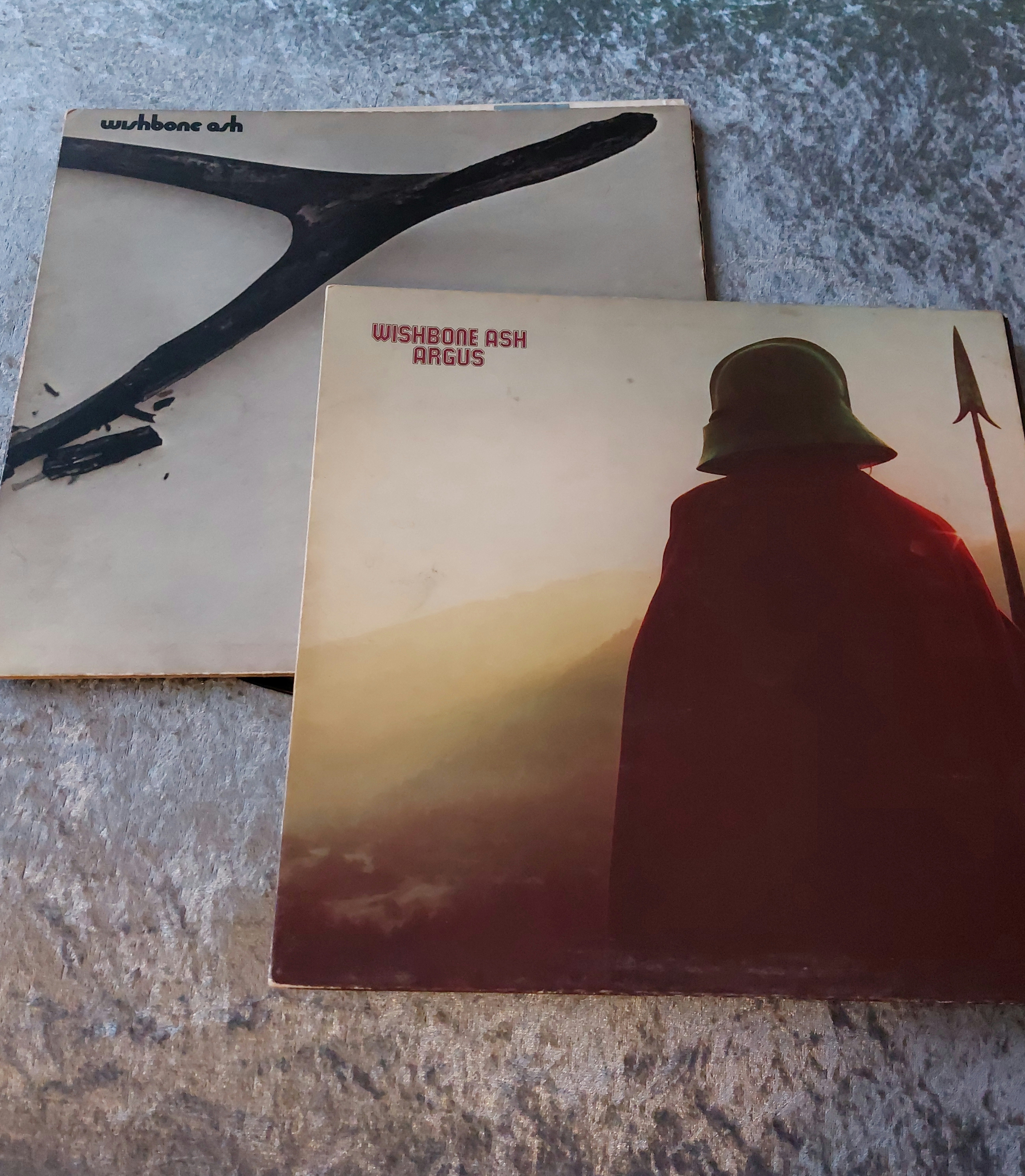 Two vinyl LP records by Wishbone Ash. One LP is titled *Argus* and features cover art depicting a figure in medieval garb. The other LP is self-titled, *Wishbone Ash*, and features a broken wishbone on the cover. Both LPs are MCA Records pressings and display matrix numbers and production information. The *Wishbone Ash* LP includes the tracks “Blind Eye,” “Lady Whiskey,” “Errors of My Ways,” and “Queen of Torture.” The *Argus* LP includes the tracks “Time Was,” “Sometime World,” and “Blowin’ Free.” Both album covers show wear and soiling commensurate with age. The records themselves appear to have been played and exhibit signs of use. Further examination is required to fully assess their playability and condition.