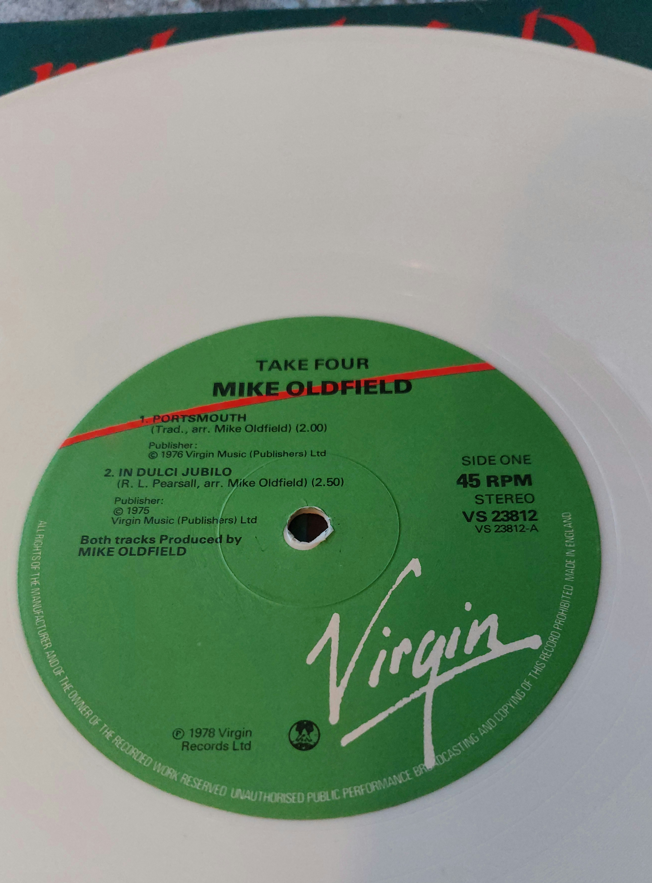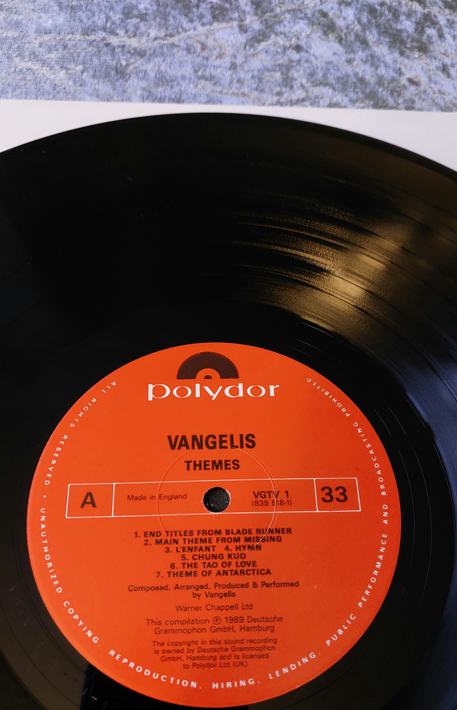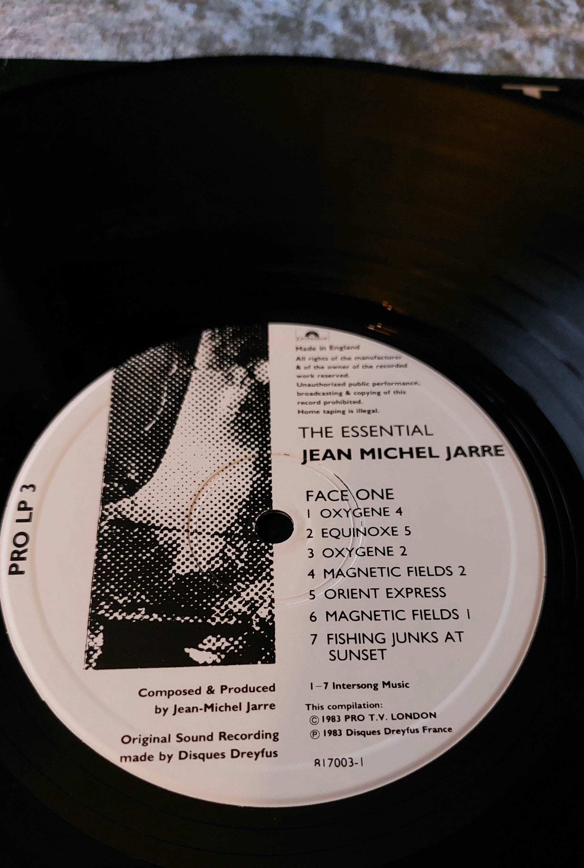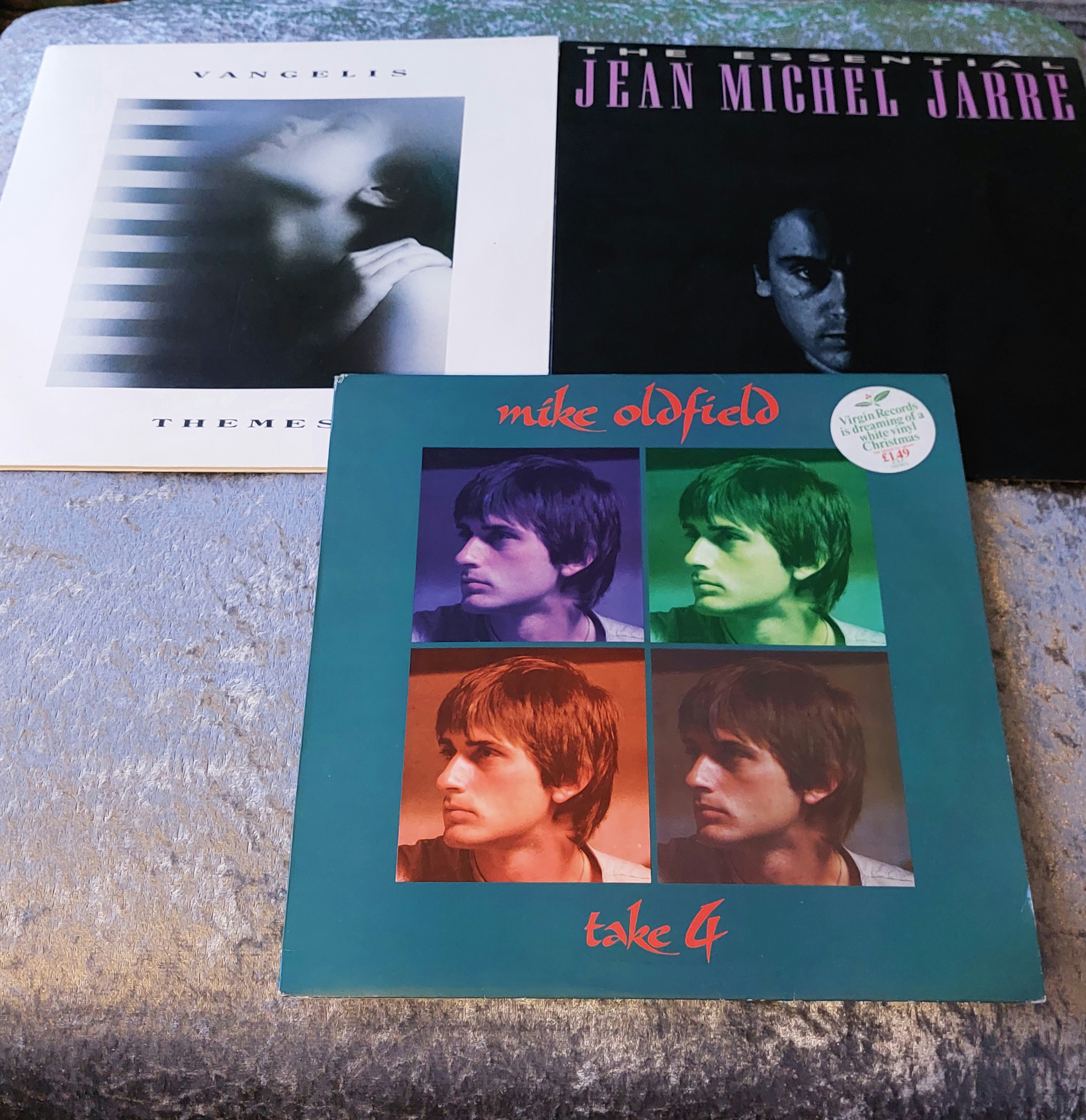Three vinyl LPs comprising Vangelis “Themes” (Polydor), Mike Oldfield “Take Four” (Virgin Records), and Jean Michel Jarre “The Essential” (Disques Dreyfus). All present production details and tracklists on their respective labels. The records and jackets show some signs of handling and potential surface wear.