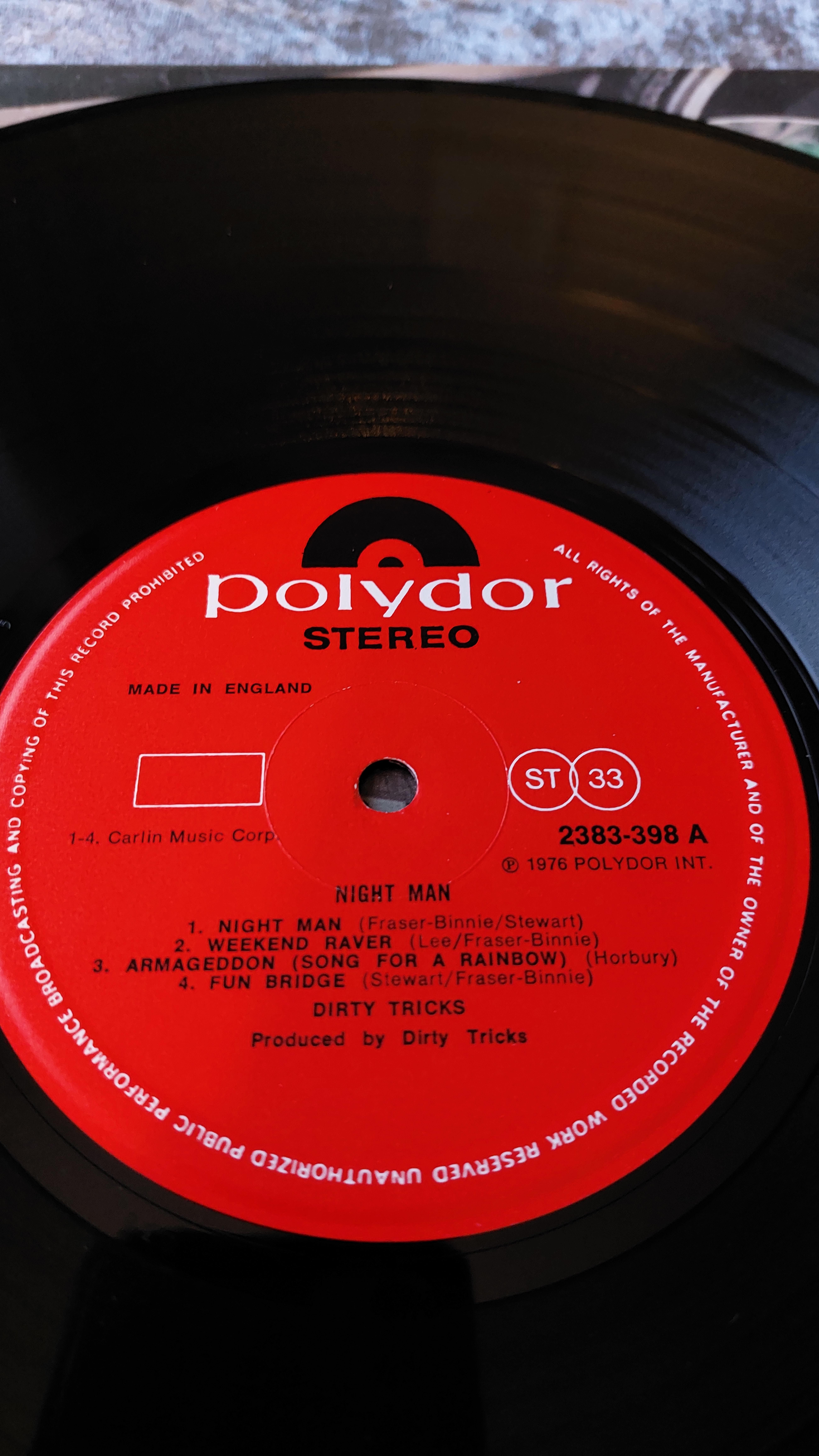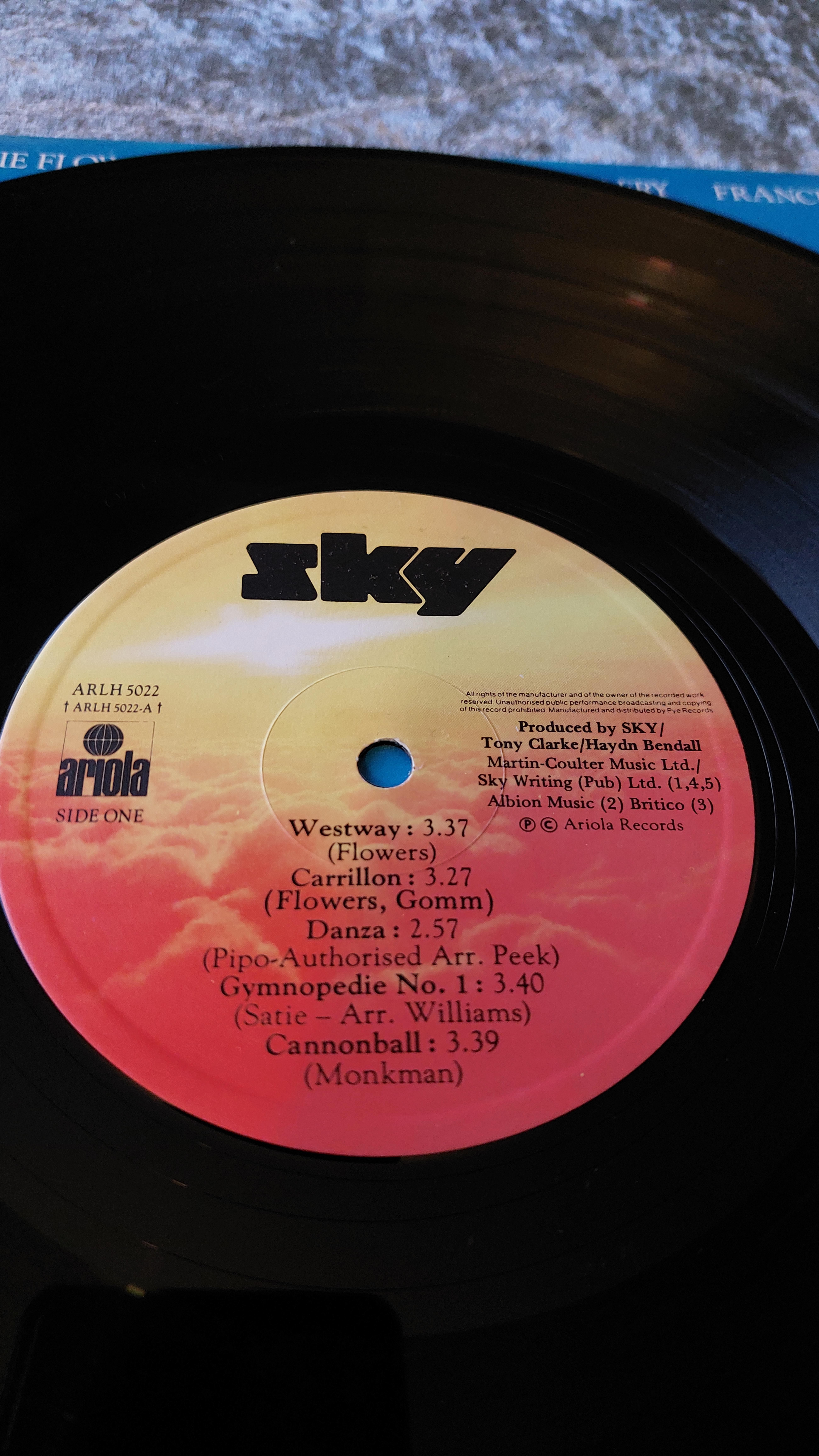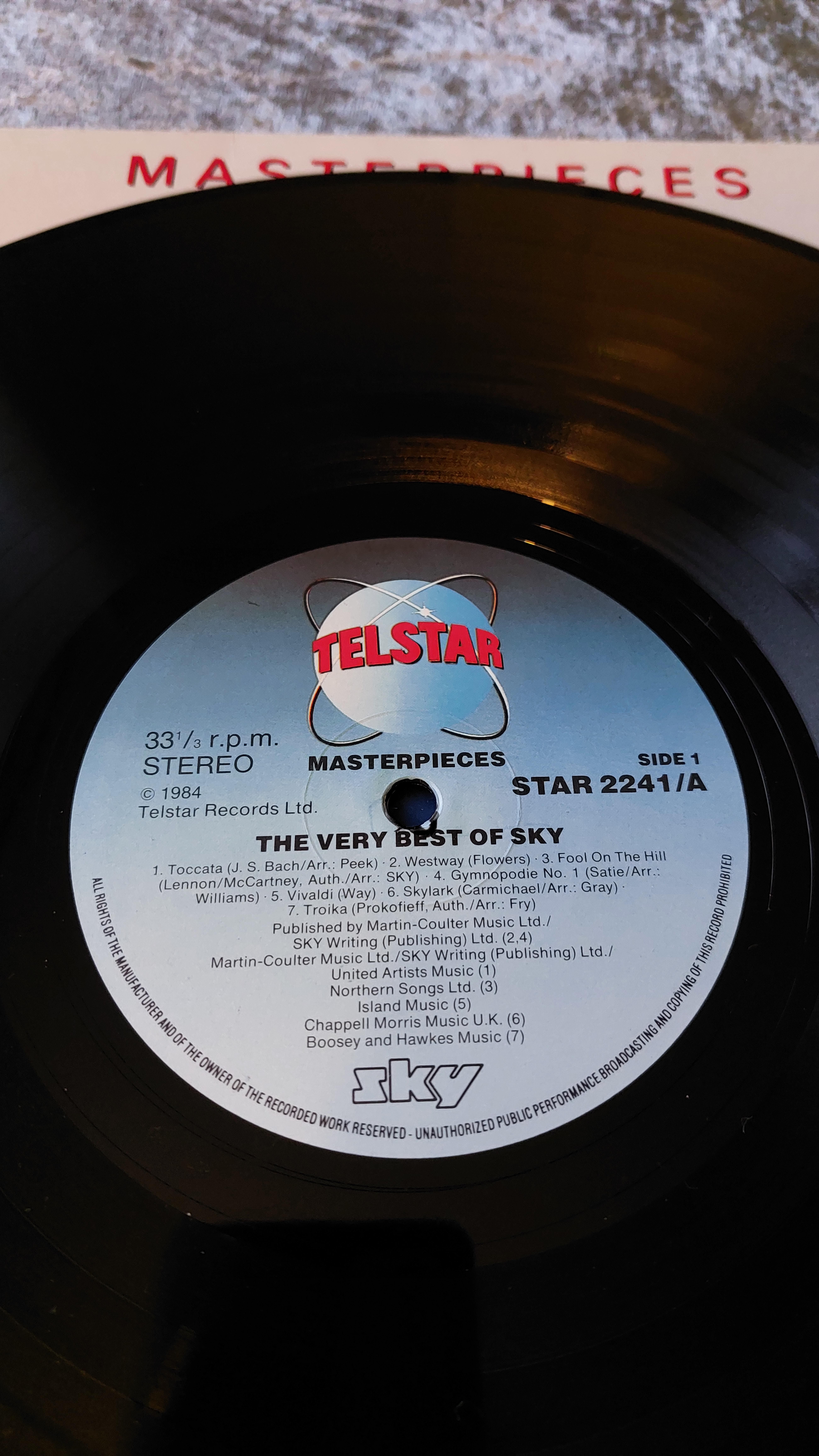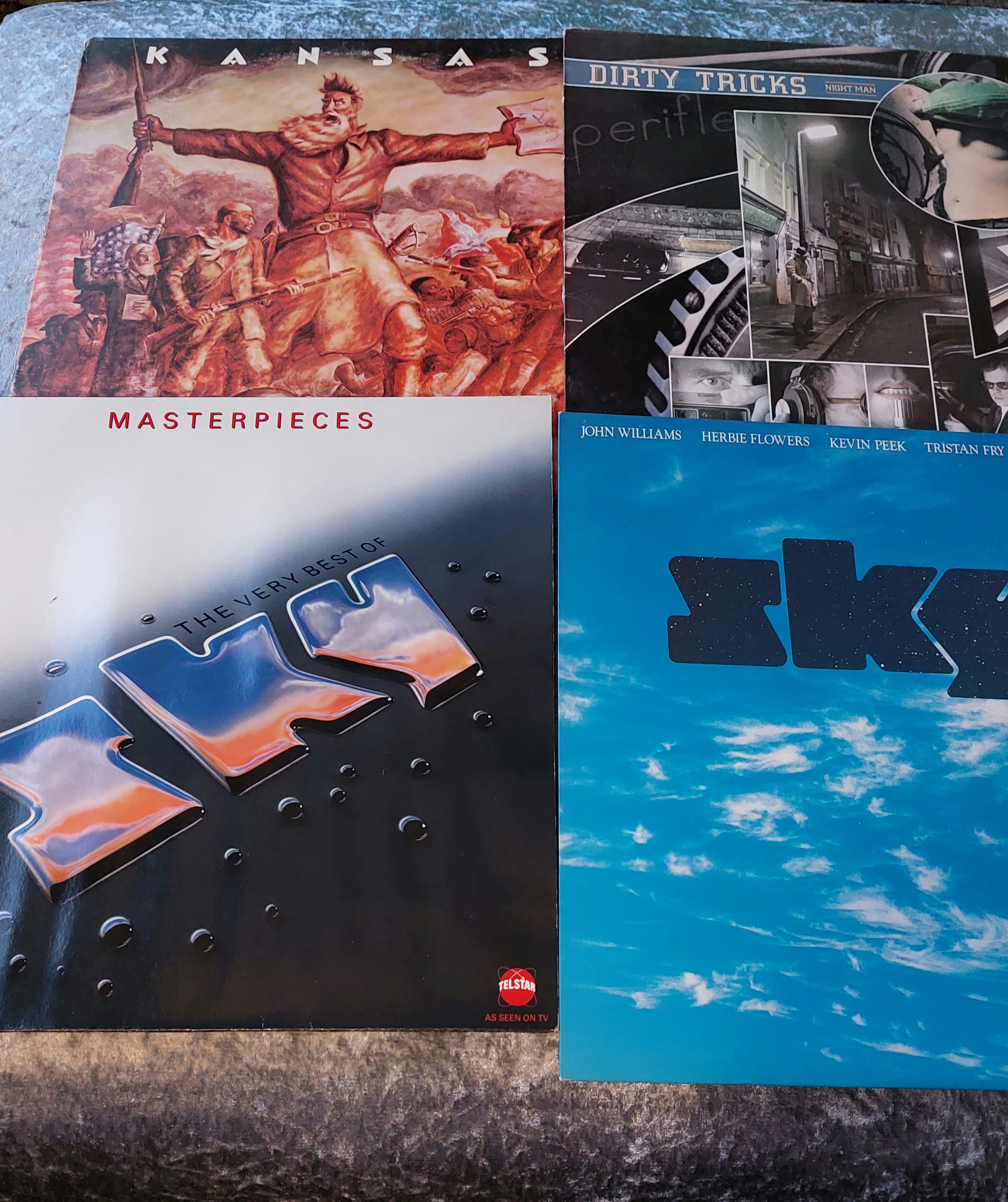 Four vinyl LP records. The first, “Kansas,” features a cover with a graphic image and the text “Masterpieces.” The label indicates it was released by Columbia Records/CBS Inc. with catalog number KZ 32817. The second LP, “Dirty Tricks” by Night Man, is on the Polydor label with catalog number 2383-398. The third is “The Very Best of Sky,” a Telstar record with the text “Masterpieces” and catalog number STAR 2241/A. The fourth record, simply titled “Sky,” lists the names John Williams, Herbie Flowers, Kevin Peek, and Tristan Fry, and was released on the Ariola label with catalog number ARLH 5022. All records are stereo and exhibit varying degrees of wear to the sleeves and labels.