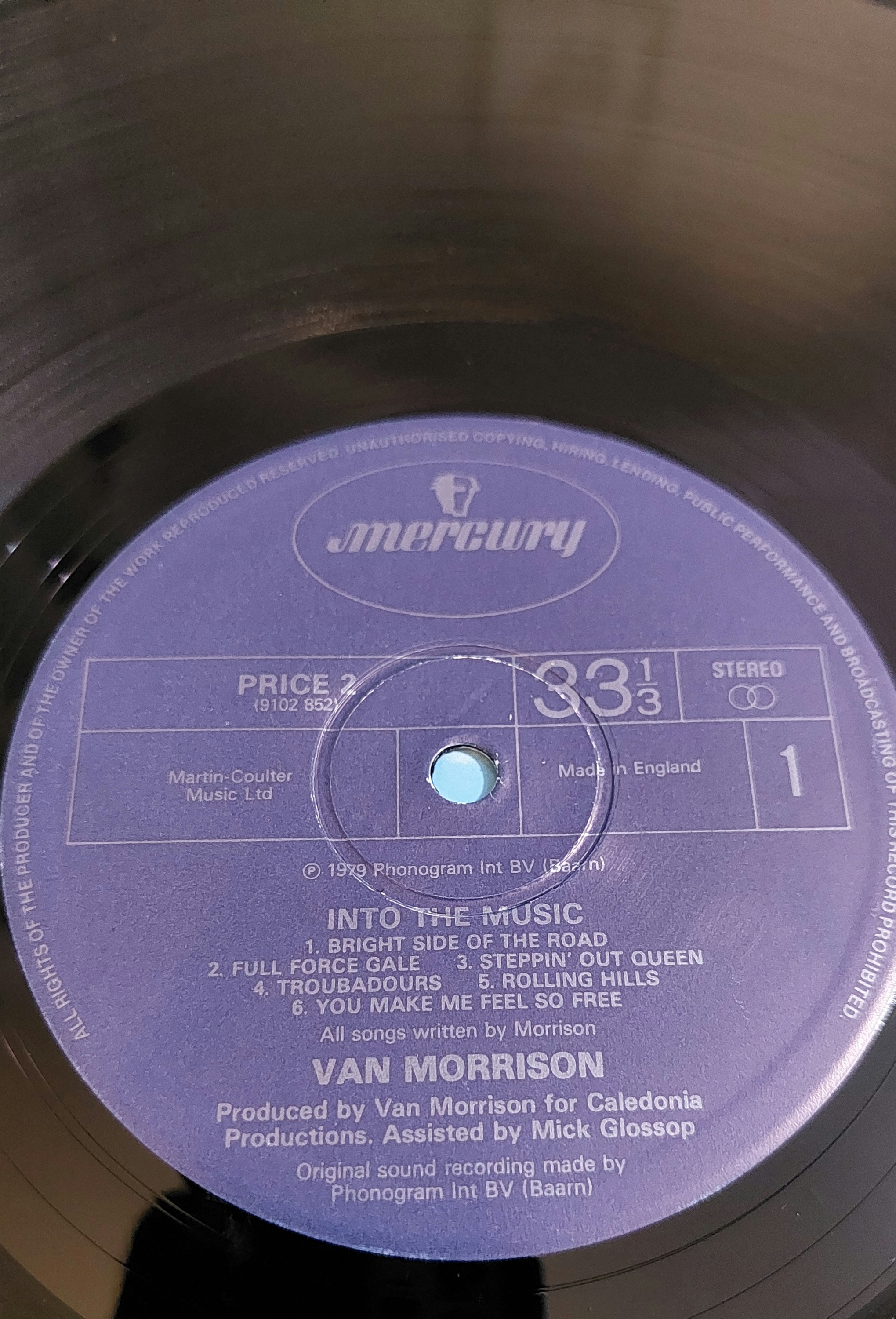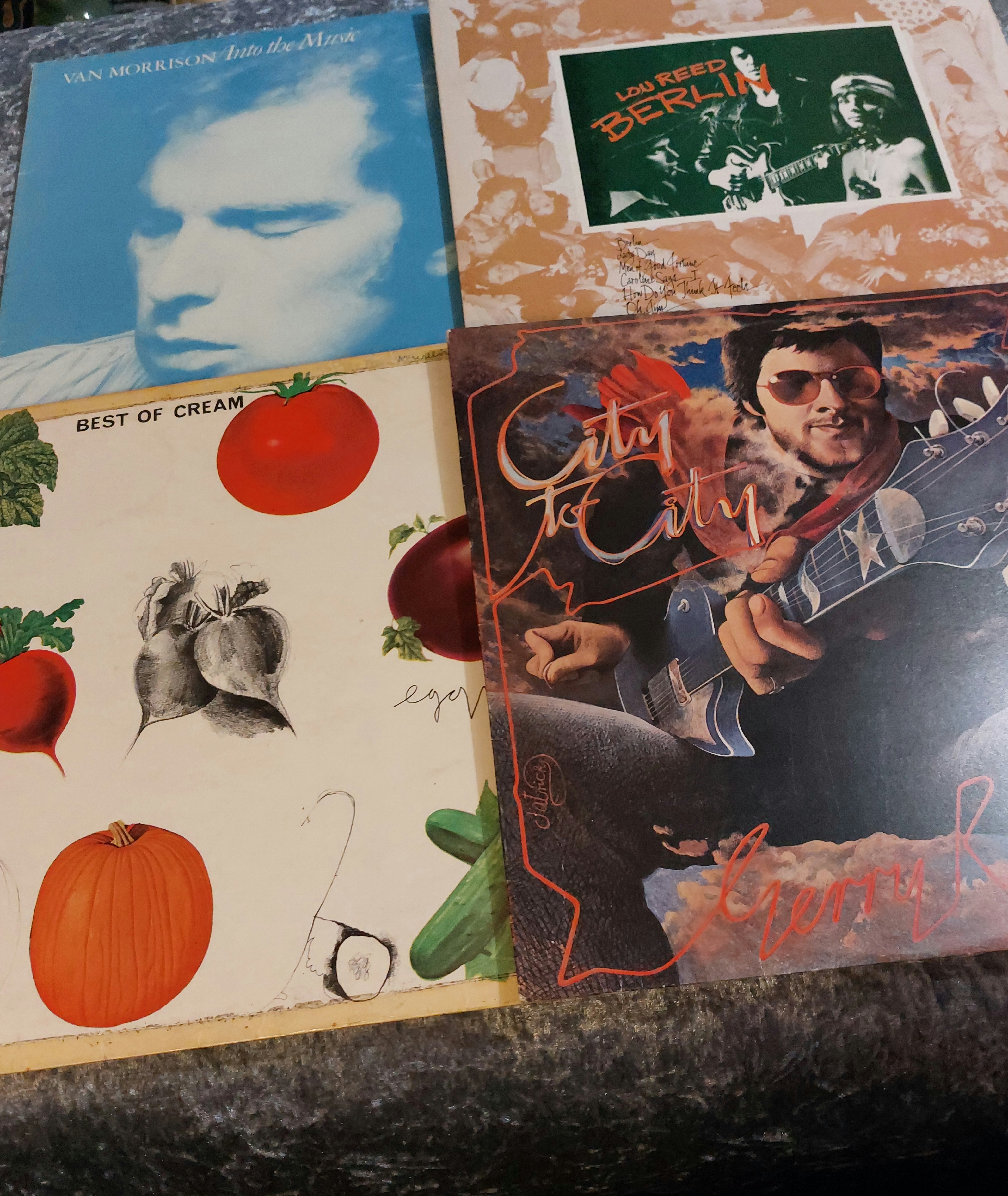 This lot comprises four vinyl LP records. Included are Van Morrison’s “Into the Music” (Mercury label, made in England), Lou Reed’s “Berlin” (RCA Victor label), Gerry Rafferty’s “City to City” (United Artists label), and Cream’s “Best of Cream” (Polydor label, made in England). The album covers show some wear, and one record label has a handwritten inscription. The records themselves are visible but their condition cannot be definitively assessed from the images.