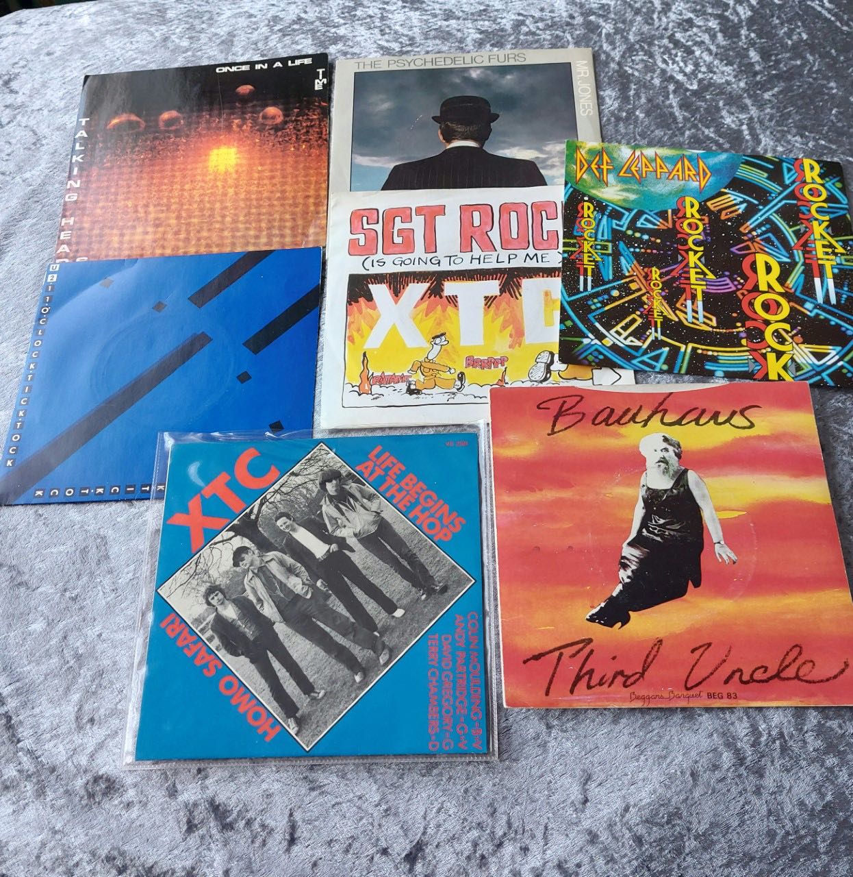 This lot comprises seven 7-inch vinyl singles, presented in their original picture sleeves. The sleeves represent a variety of artists and record labels, notably including XTC, Bauhaus, and Def Leppard, predominantly from the 1980s. Labels observed include Virgin and Rocket. The vinyl discs appear to be black and exhibit varying degrees of surface wear. Further inspection is recommended to assess the playability and sound quality of the records.