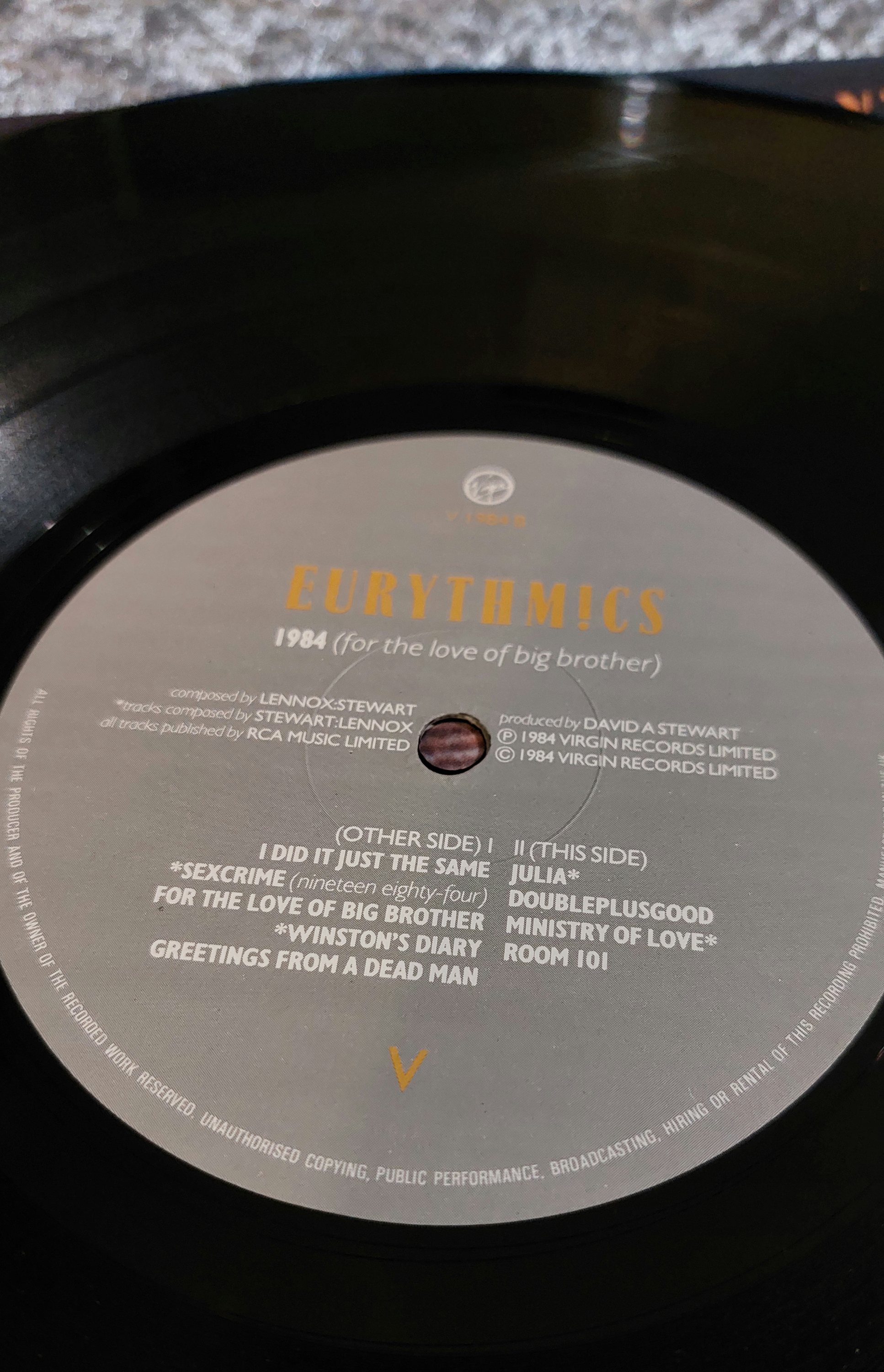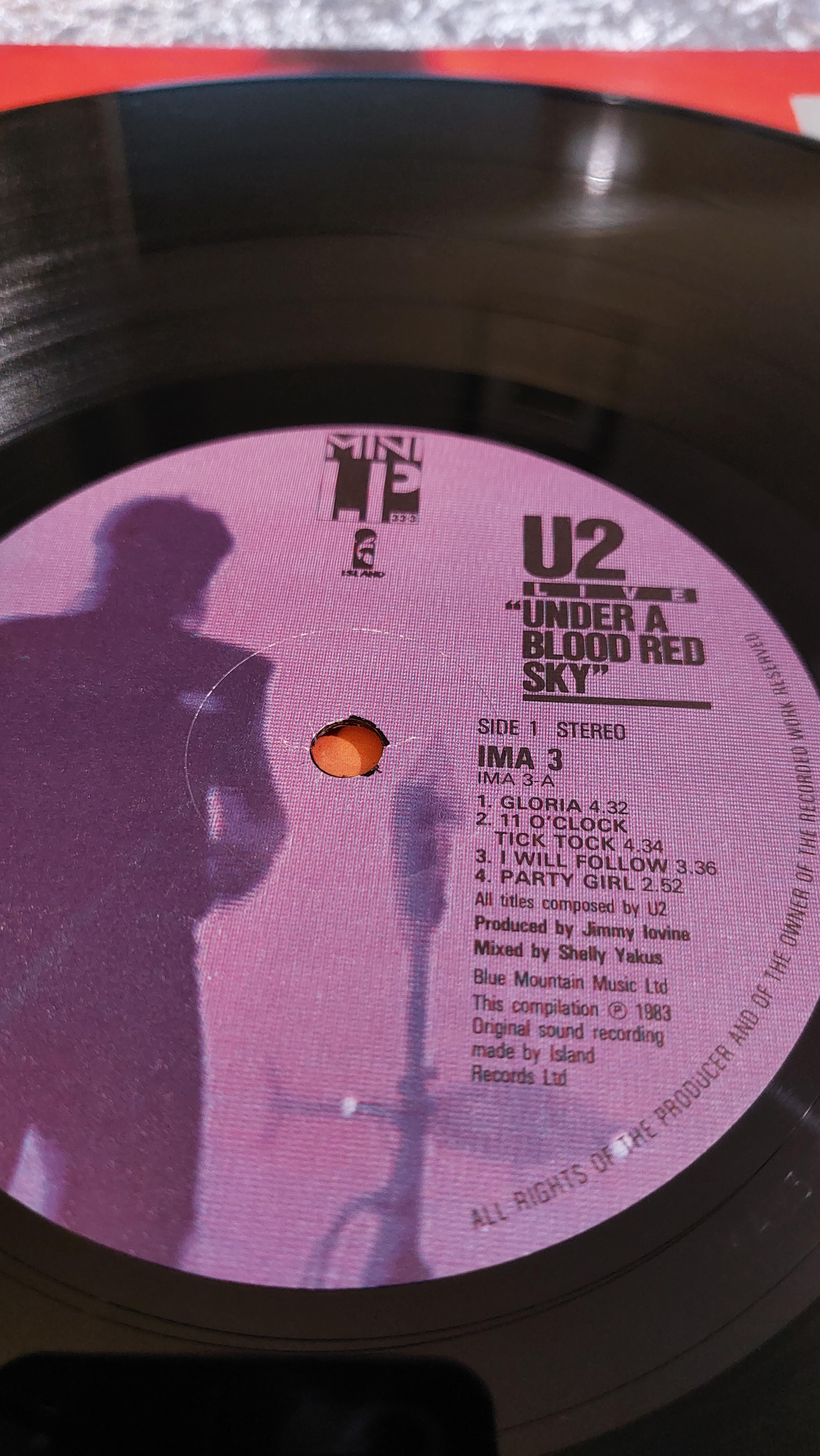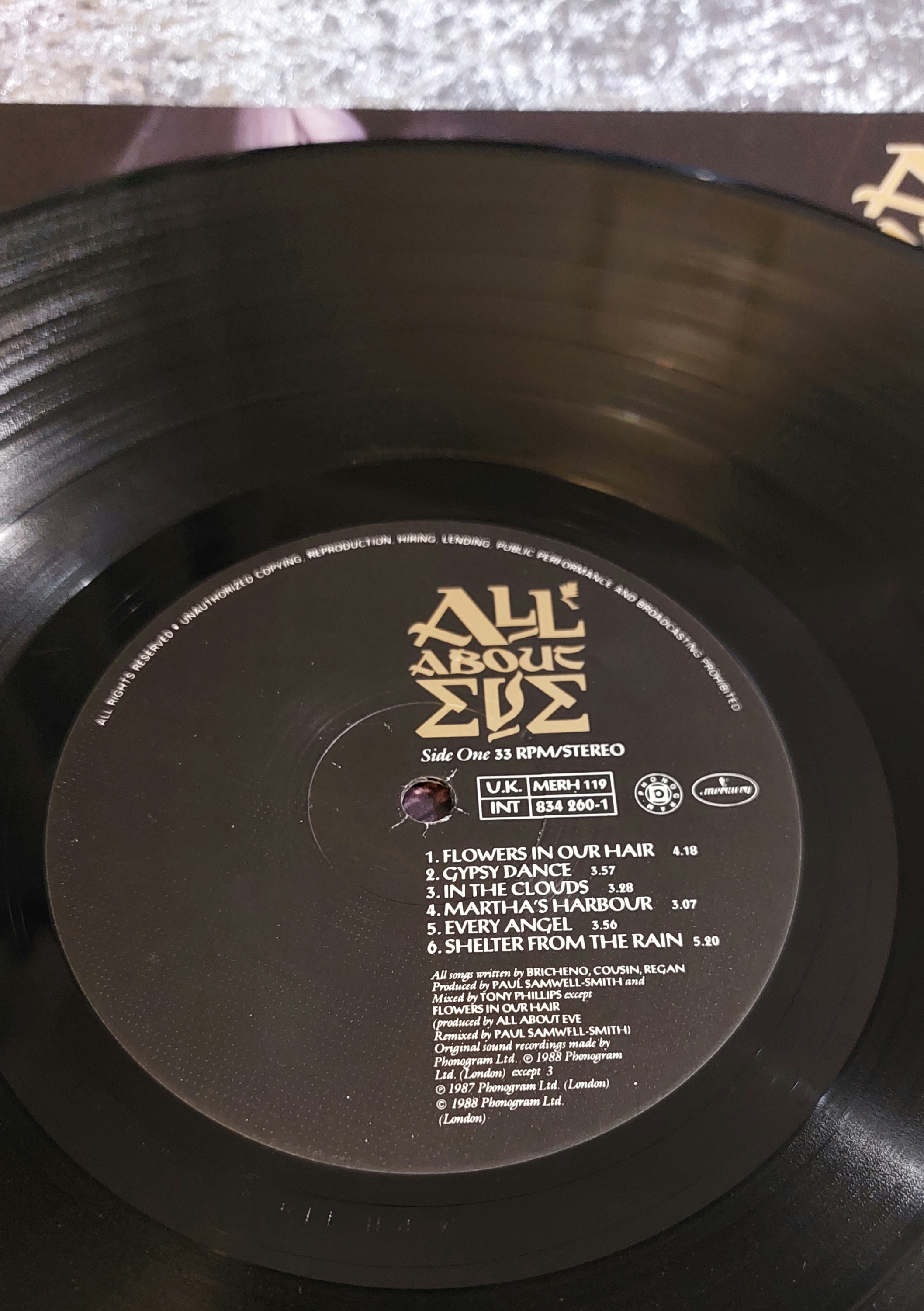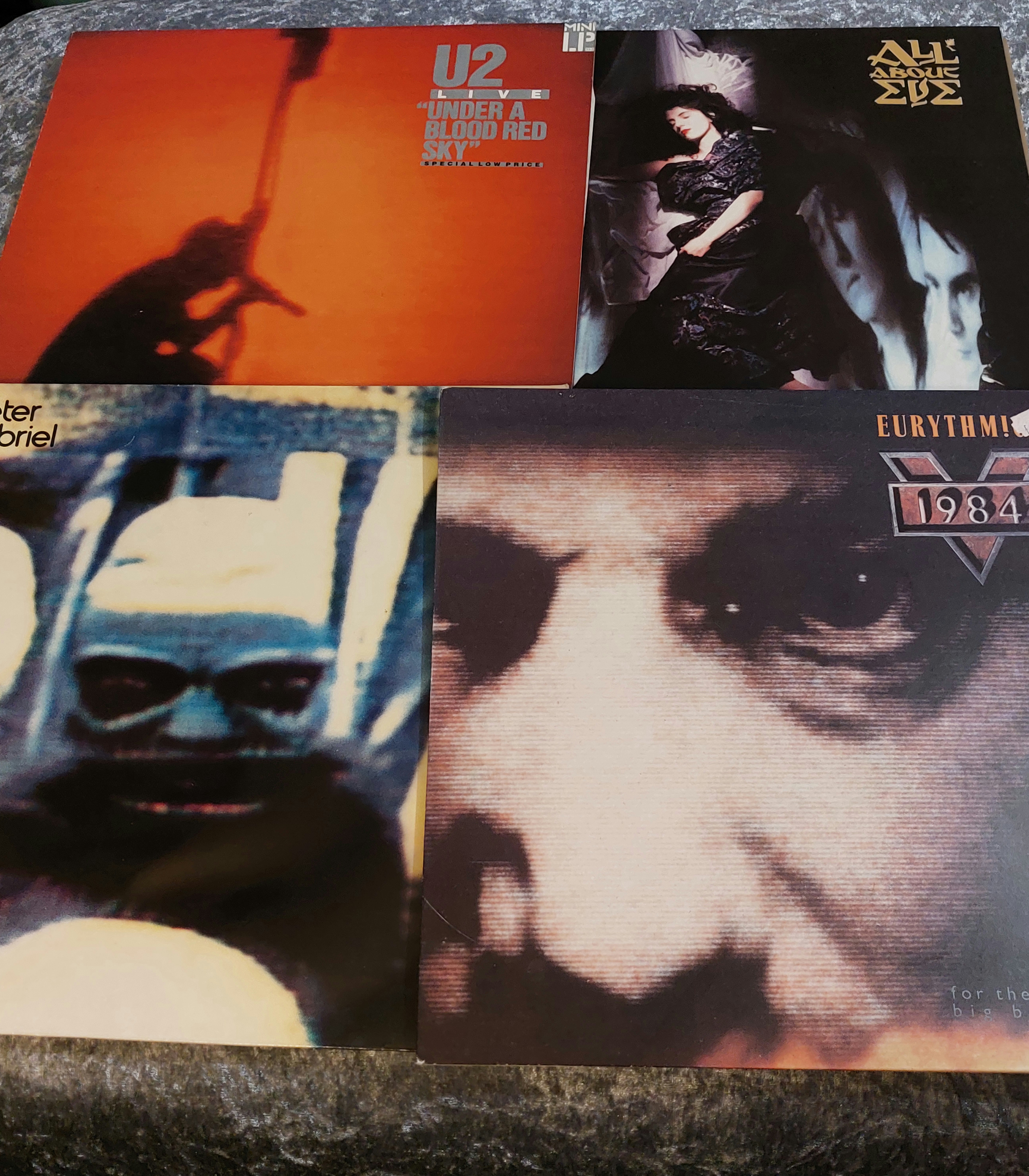 Four 12-inch vinyl LP records, visually identified as U2 “Under a Blood Red Sky,” All About Eve “All About Eve,” Peter Gabriel “Peter Gabriel,” and Eurythmics “1984 (For the Love of Big Brother).” The records and covers show varying degrees of wear consistent with age. Labels include track listings, artist, record company, and copyright information.