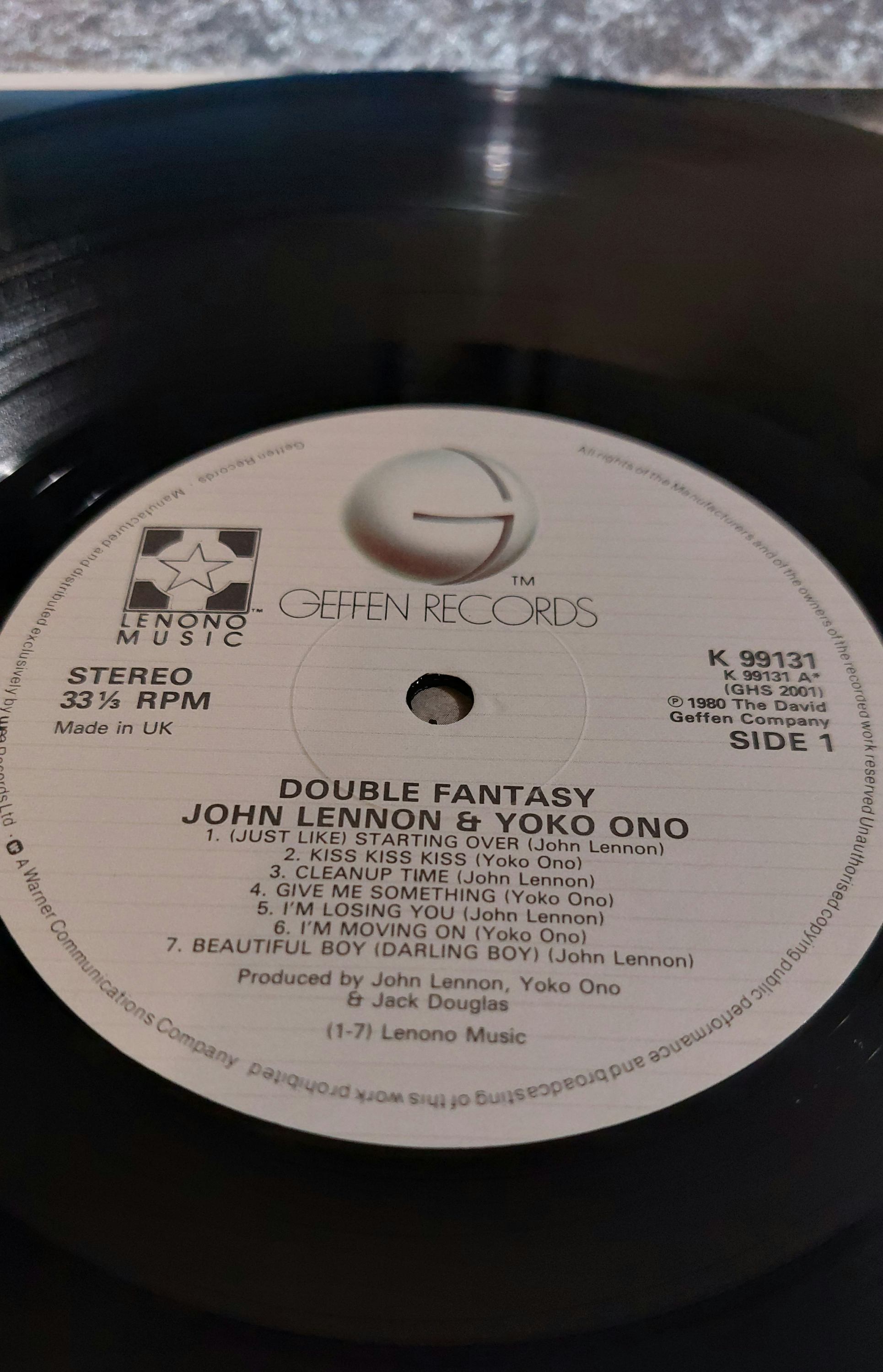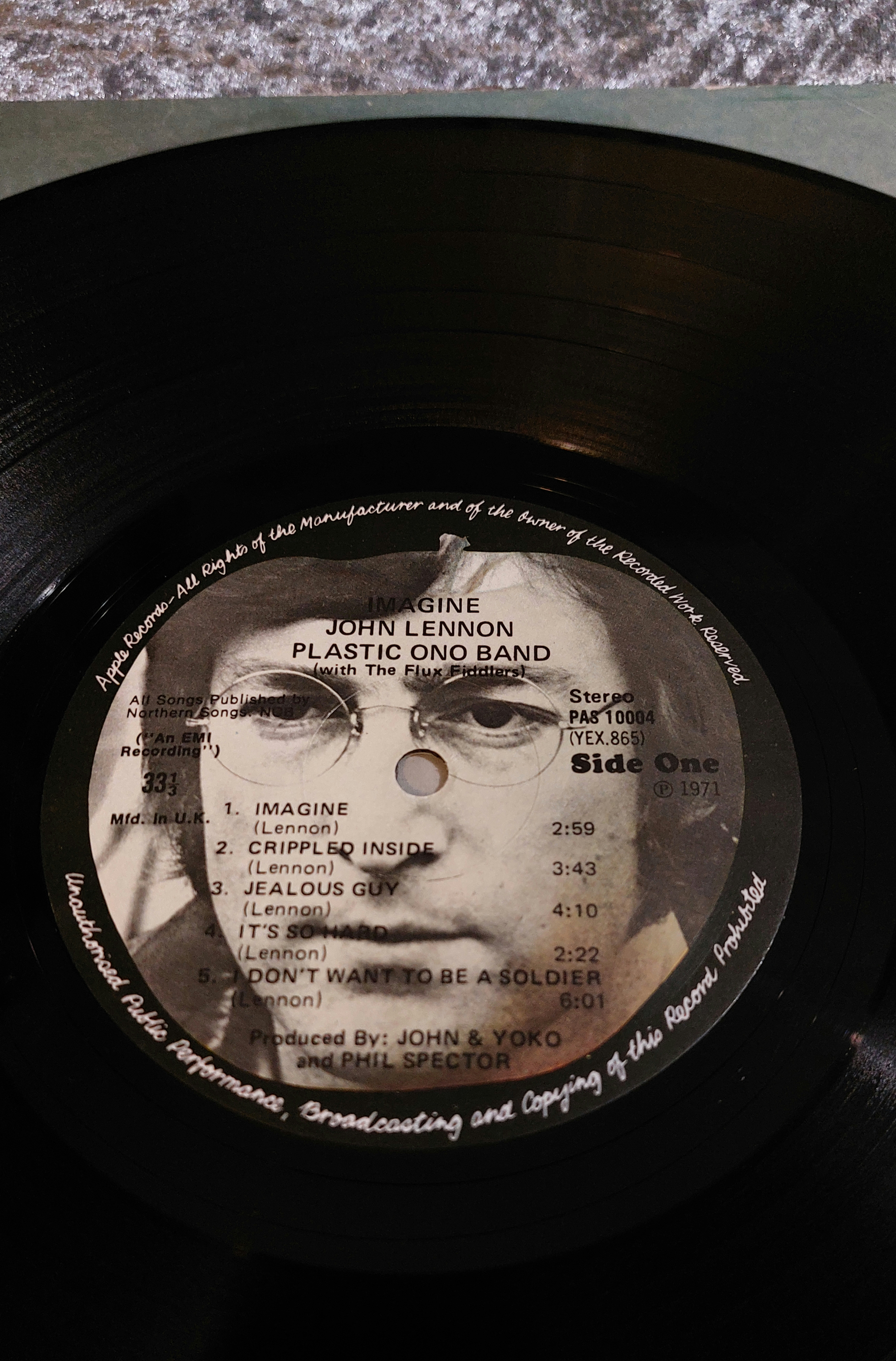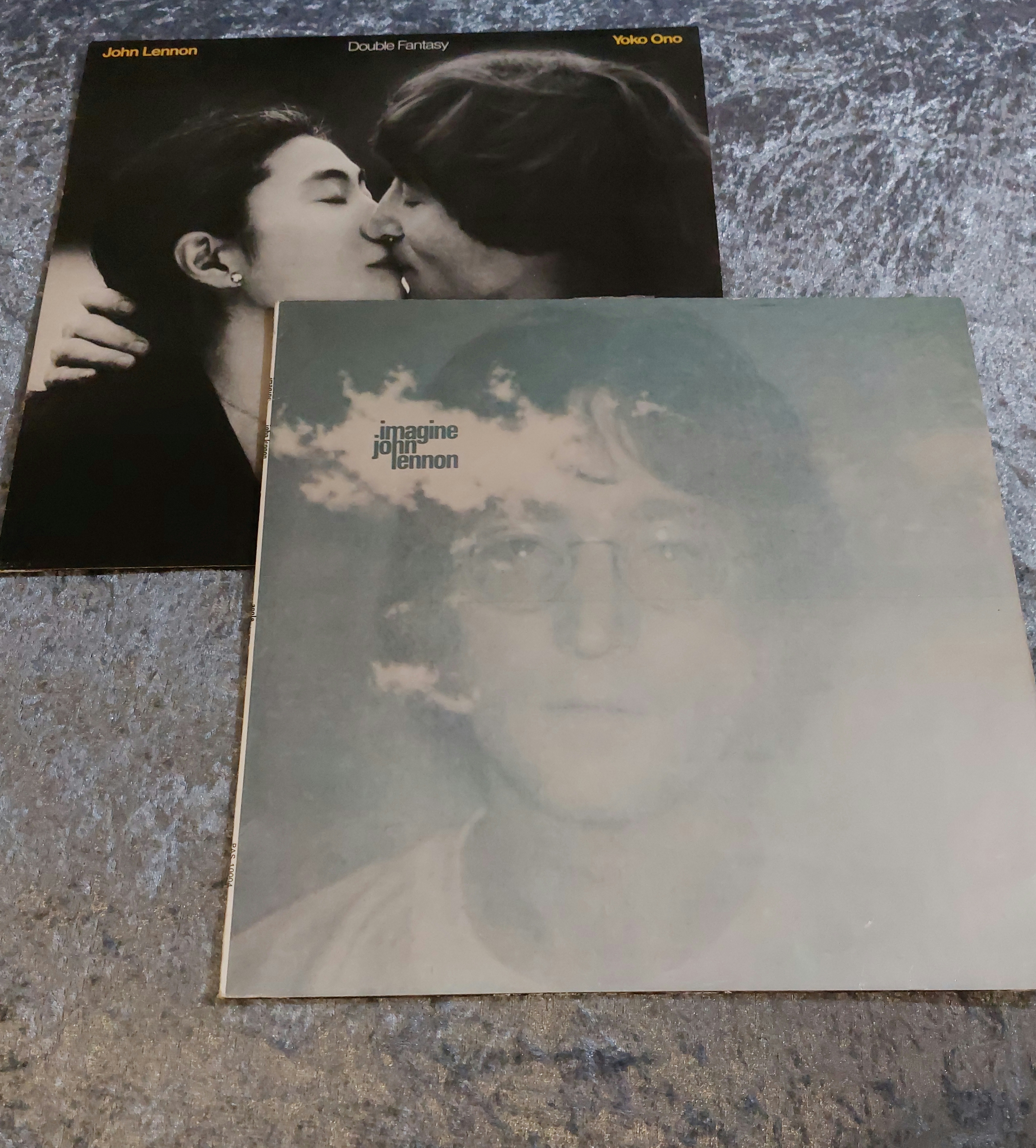Two vinyl LP records by John Lennon, including *Imagine* and *Double Fantasy*. *Imagine*, a Geffen Records release with catalog number PAS 10004, features a close-up image of John Lennon on the cover. *Double Fantasy*, also by Geffen Records, catalog number K 99131, pictures John Lennon and Yoko Ono. Both records are 33⅓ RPM stereo pressings made in the UK, and include original printed inner sleeves.