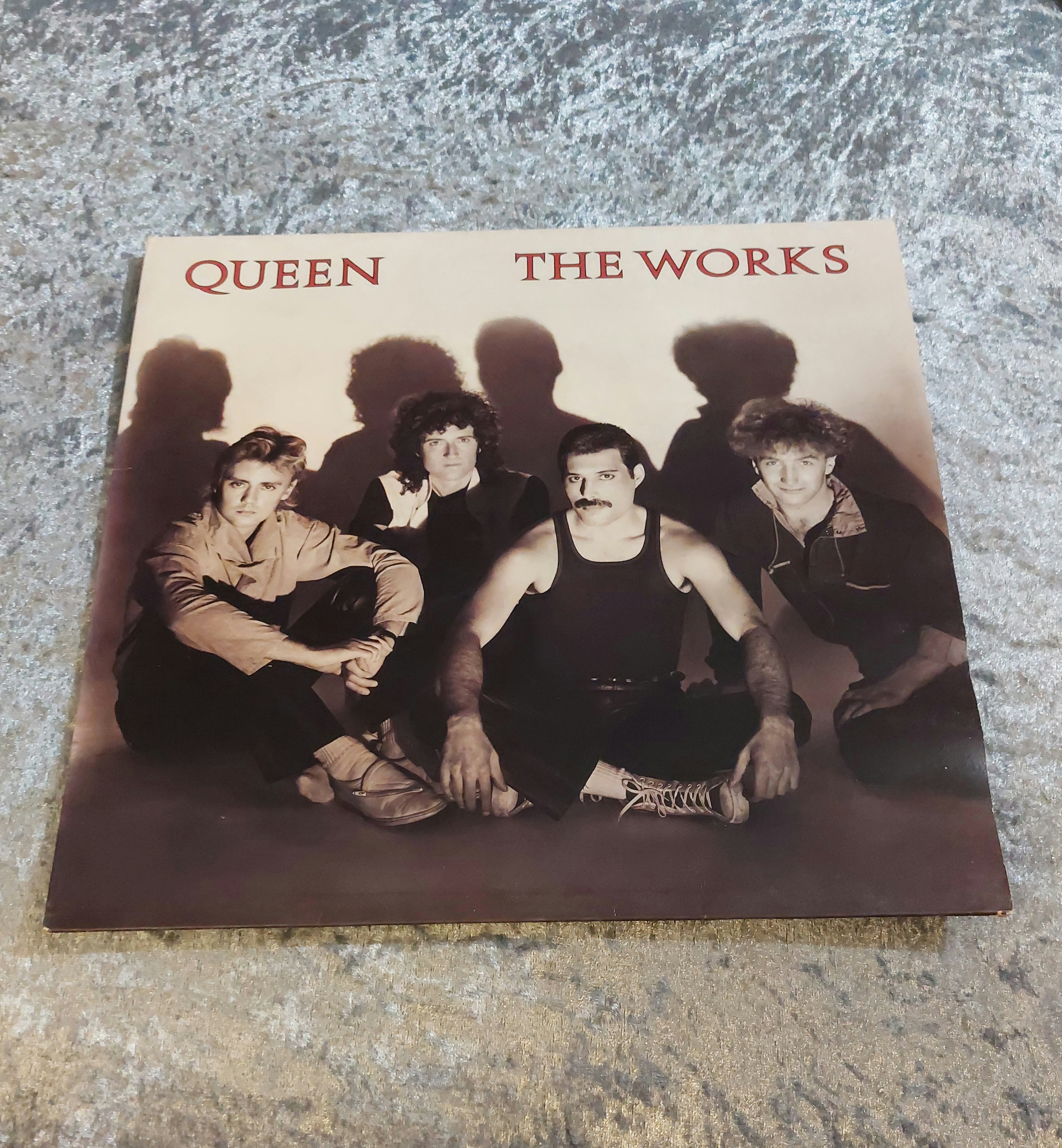 Queen “The Works” vinyl LP album. Cover features a sepia-toned photograph of the band members. The record itself includes production credits for EMI, song titles, and composer information. Stereo EMC 24.0014.1-A. Copyright 1984.