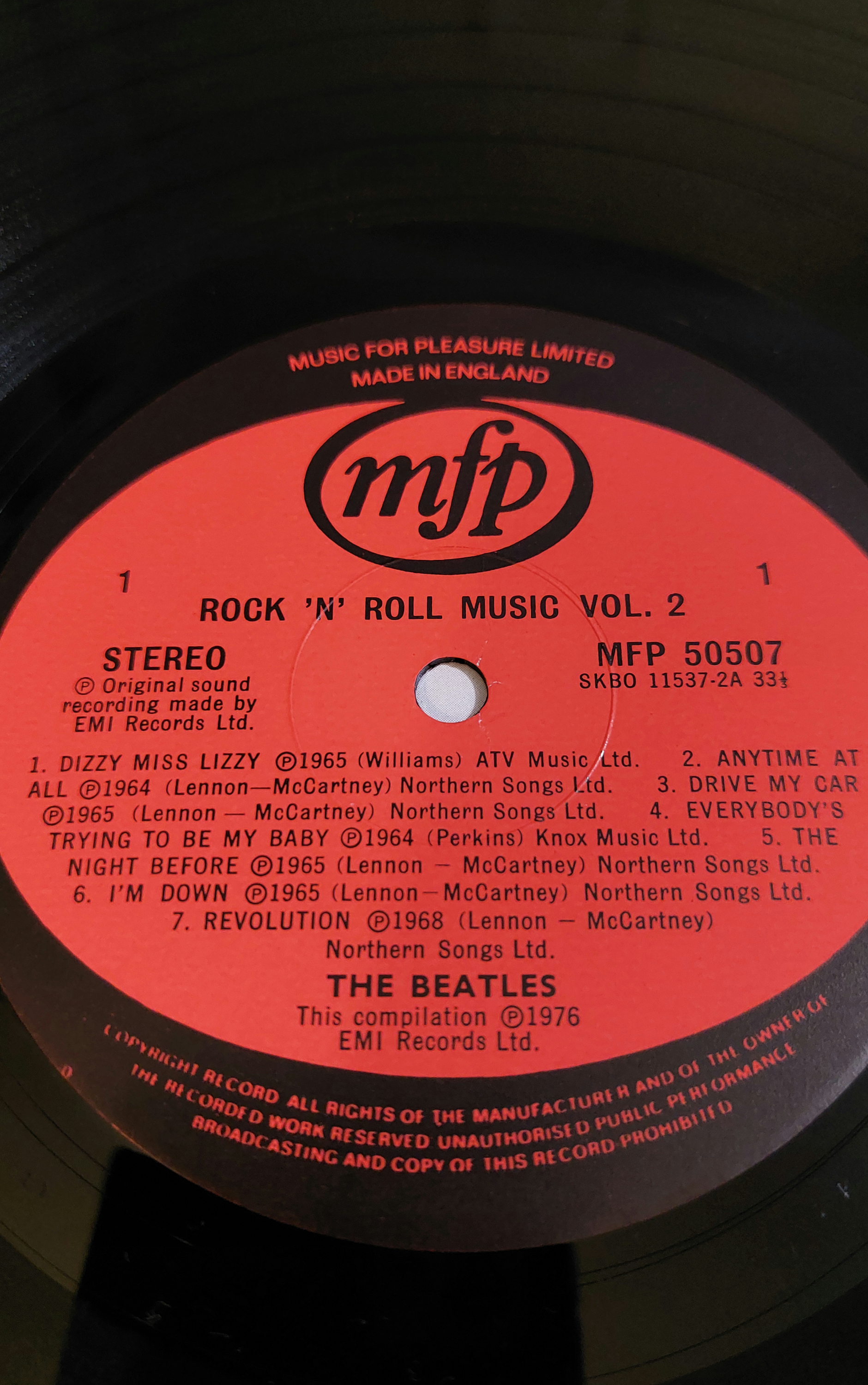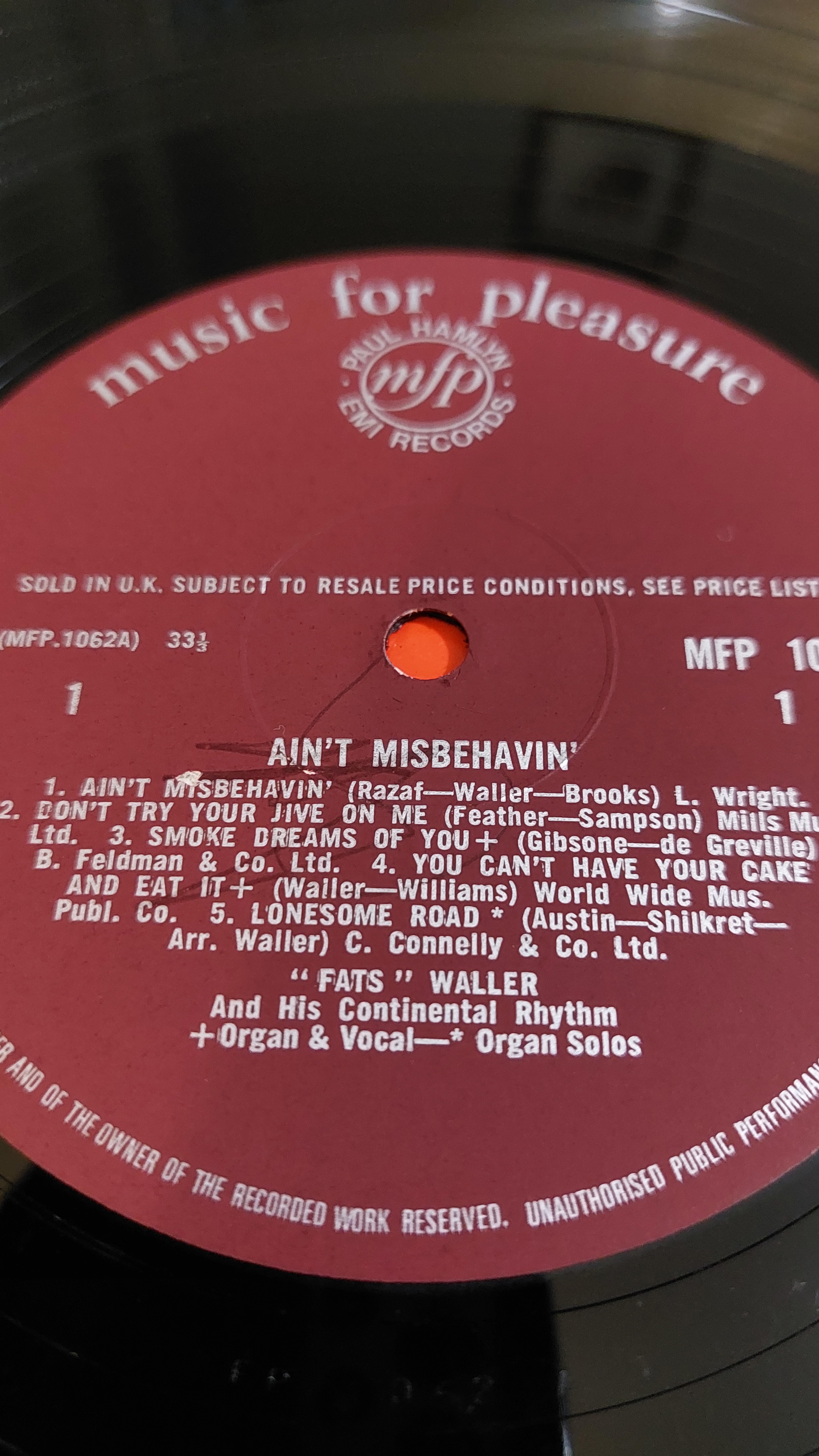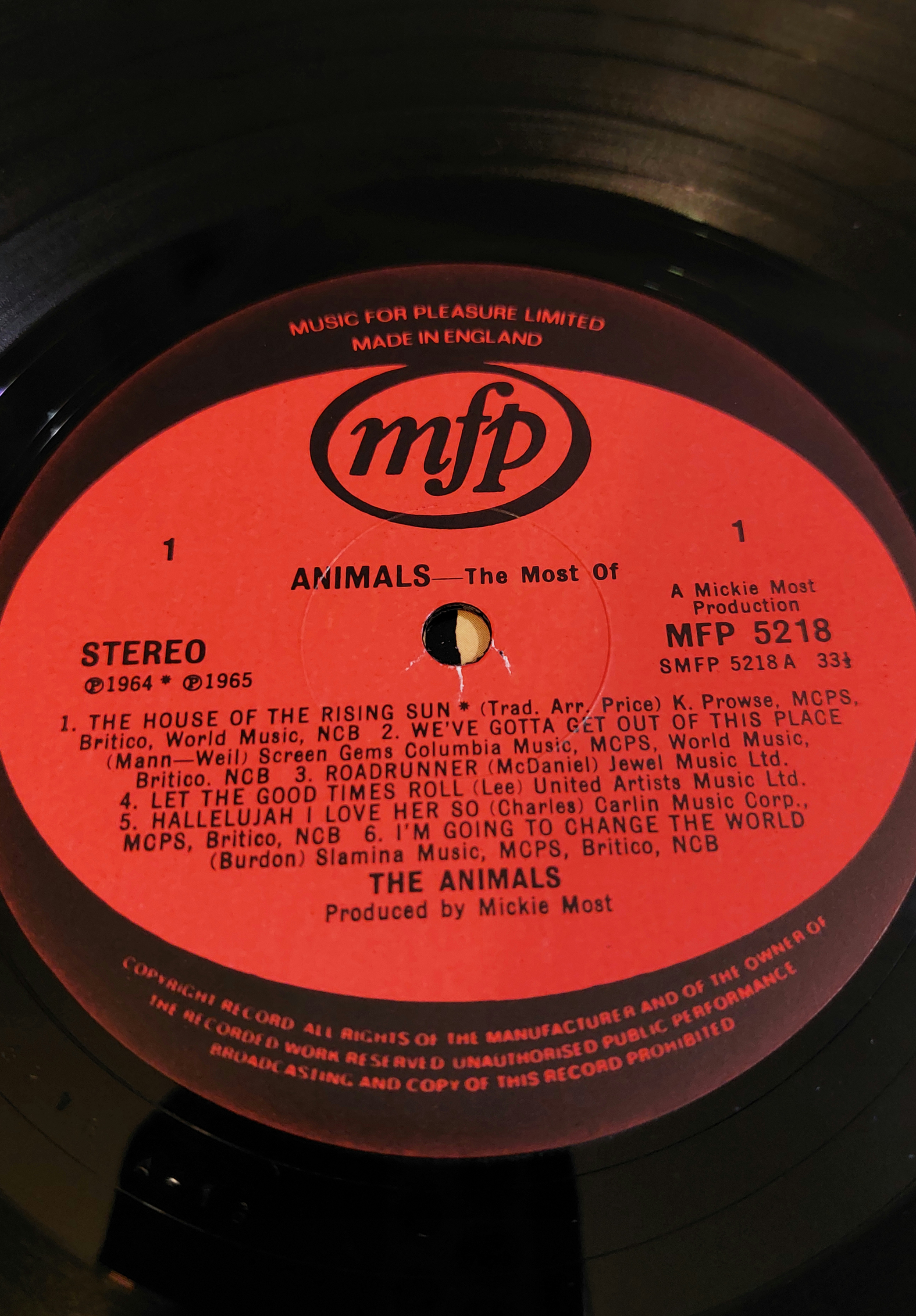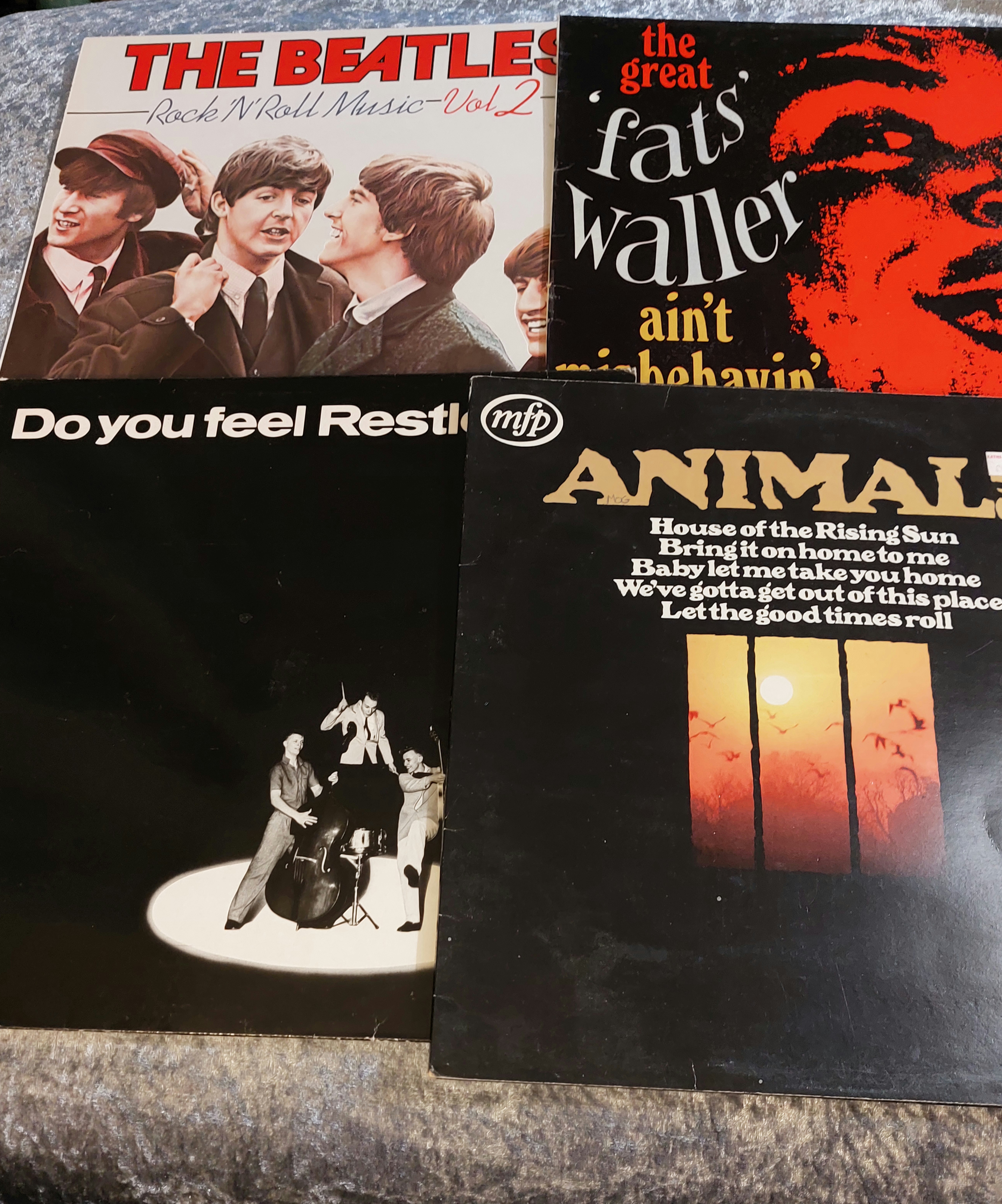 This lot comprises four vinyl LP records. Three are Music for Pleasure (MFP) releases: The Beatles “Rock ‘N’ Roll Music-Vol. 2” (MFP 50507), Fats Waller “Ain’t Misbehavin'” (MFP 1062A), and The Animals “The Most Of” (MFP 5218). The fourth is a Nervous Records release titled “Do You Feel…Restless?” (NERD 015). All appear to be stereo recordings and bear various copyright and production details on their labels.