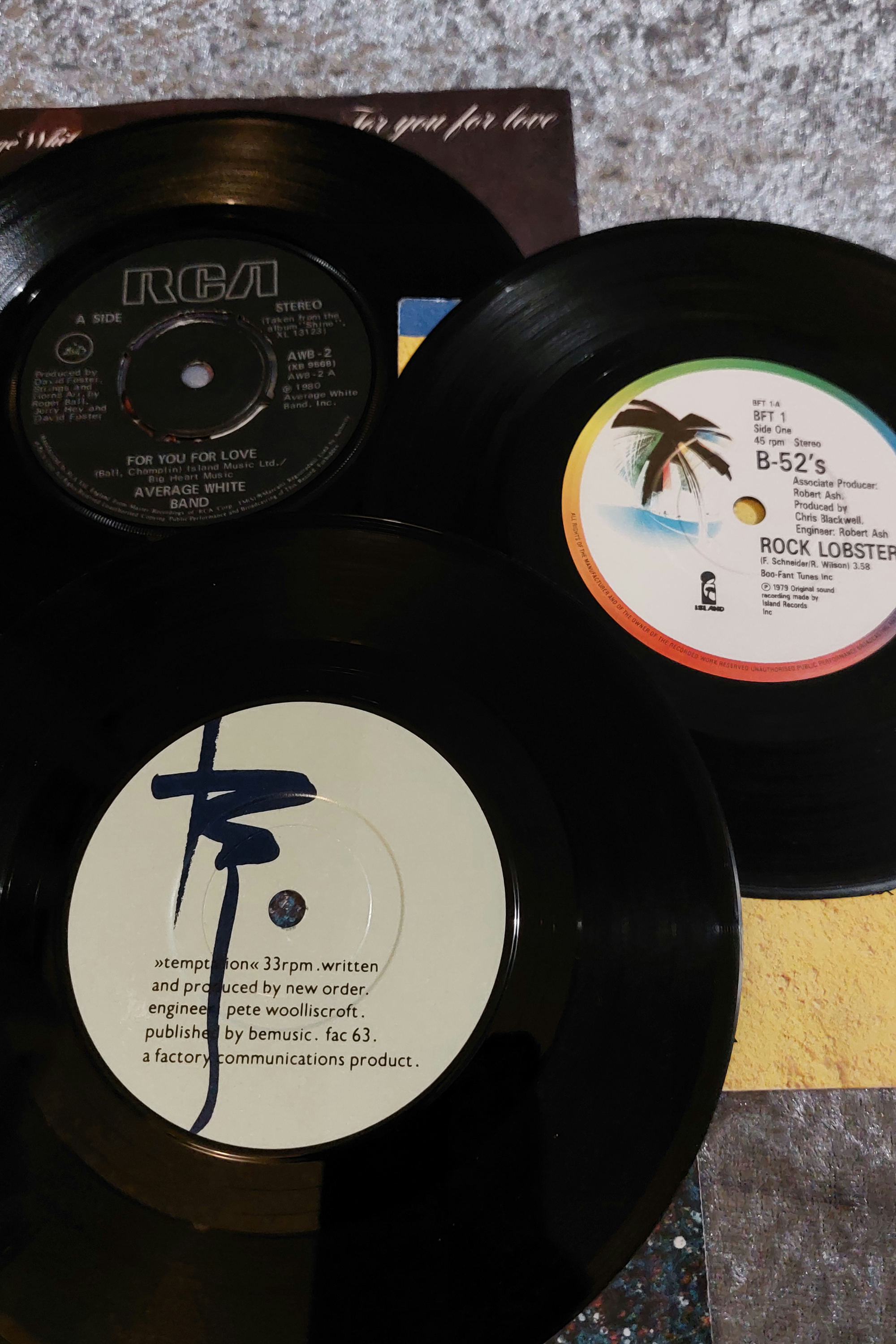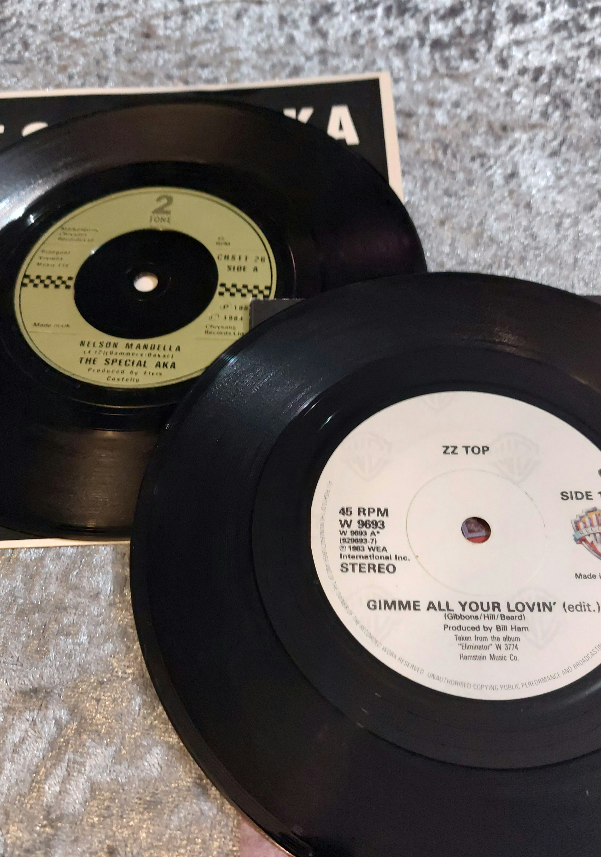 This lot comprises a collection of vinyl records, including four 12-inch LPs and three 7-inch 45 rpm singles. The LPs feature artwork and artist information for Average White Band, The B-52’s, ZZ Top, and The Special AKA featuring Nelson Mandela. Two of the singles are clearly identifiable as releases by The B-52’s, ZZ Top, and The Special AKA featuring Nelson Mandela. The collection also includes a promotional or insert sheet with a speckled surface, possibly painted or splattered. All items appear to date from the late 20th century.