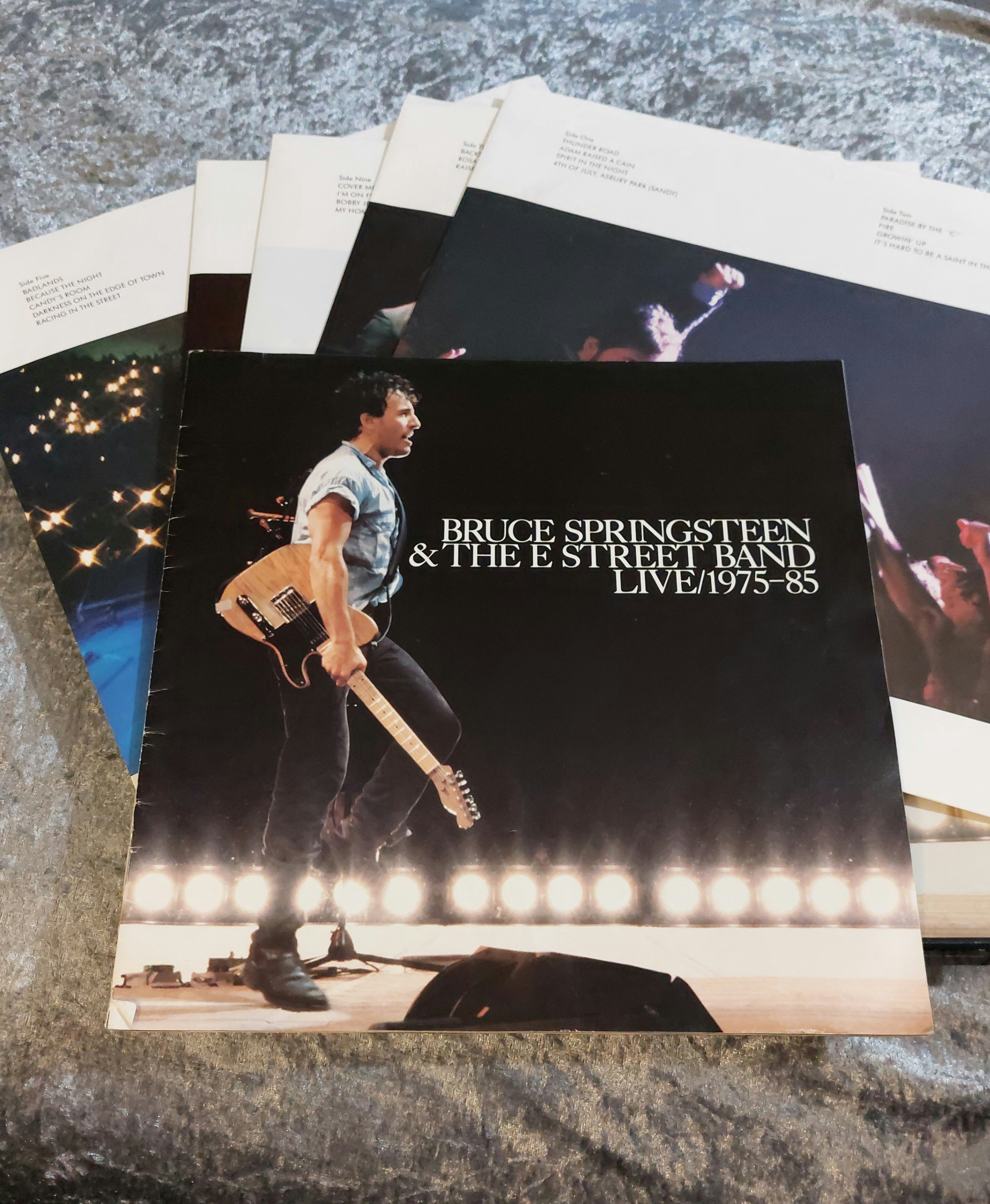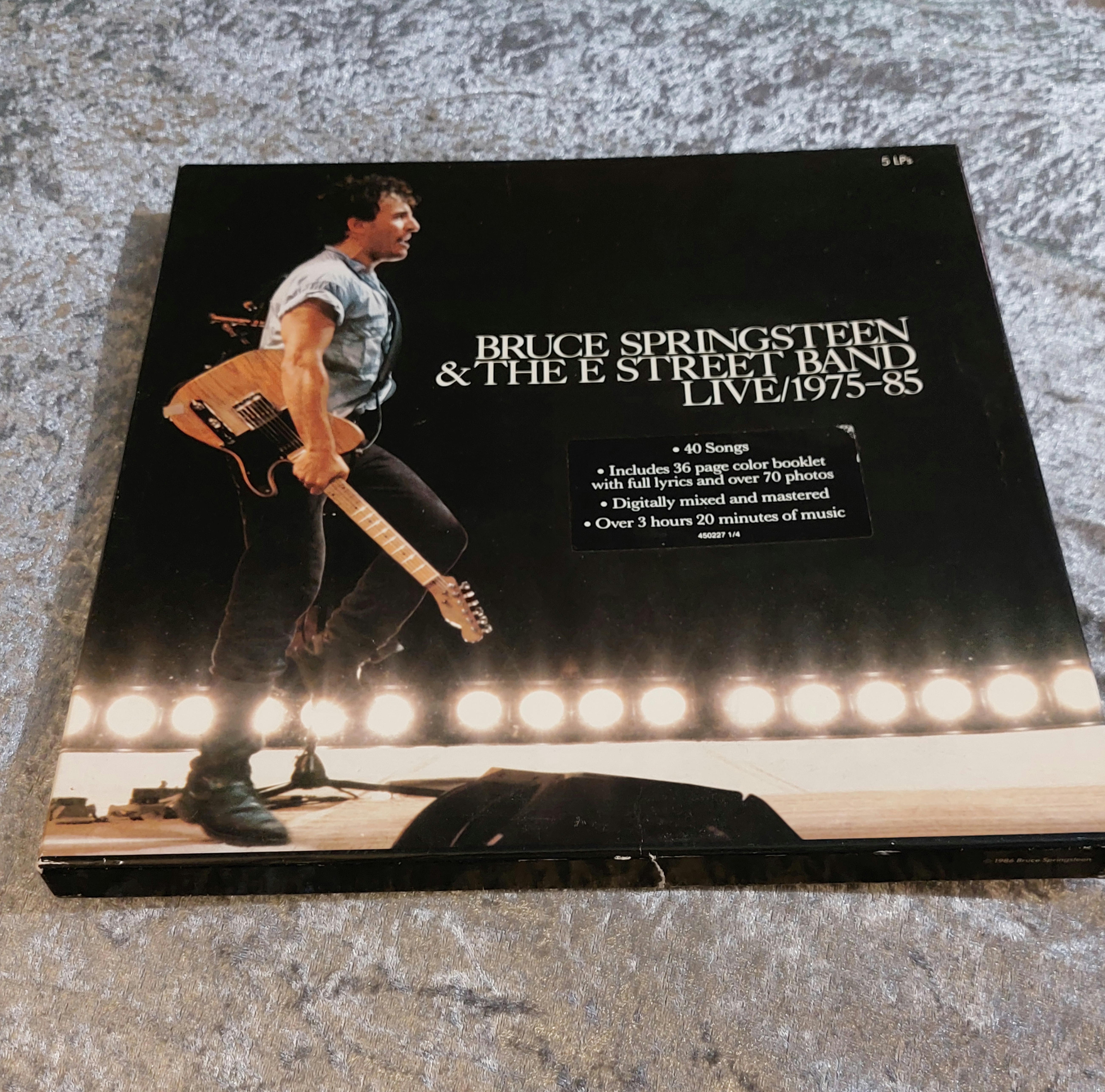 A five-LP box set of Bruce Springsteen & The E Street Band’s *Live 1975-85*. The box features a photograph of Bruce Springsteen on stage with his guitar. Text on the box indicates the set includes a 36-page color booklet with lyrics and photos, digitally mastered recordings, and over 3 hours of music. The box contains five LP records in sleeves and a booklet. The materials appear to be cardboard (box), vinyl (records), and paper (booklet).