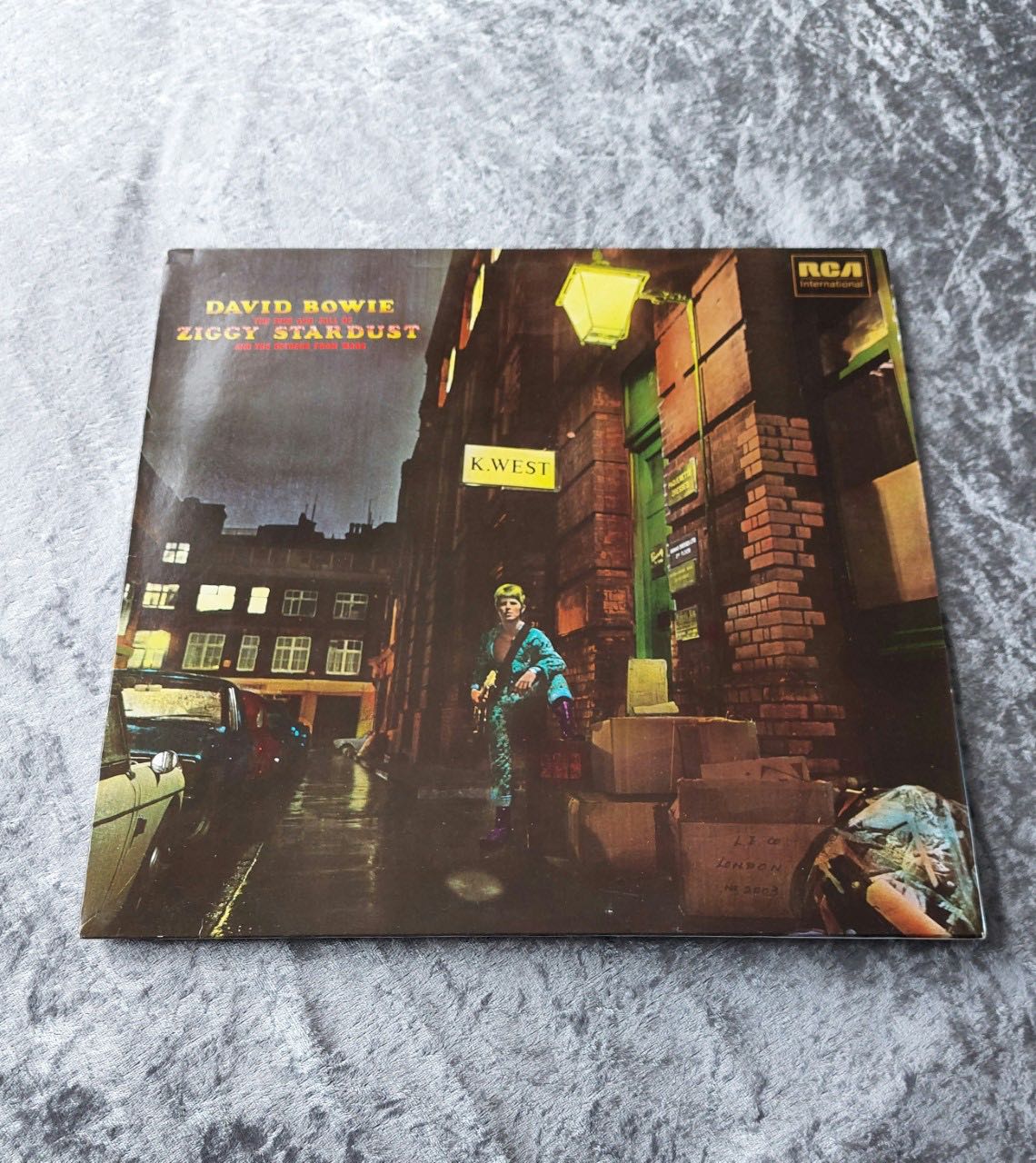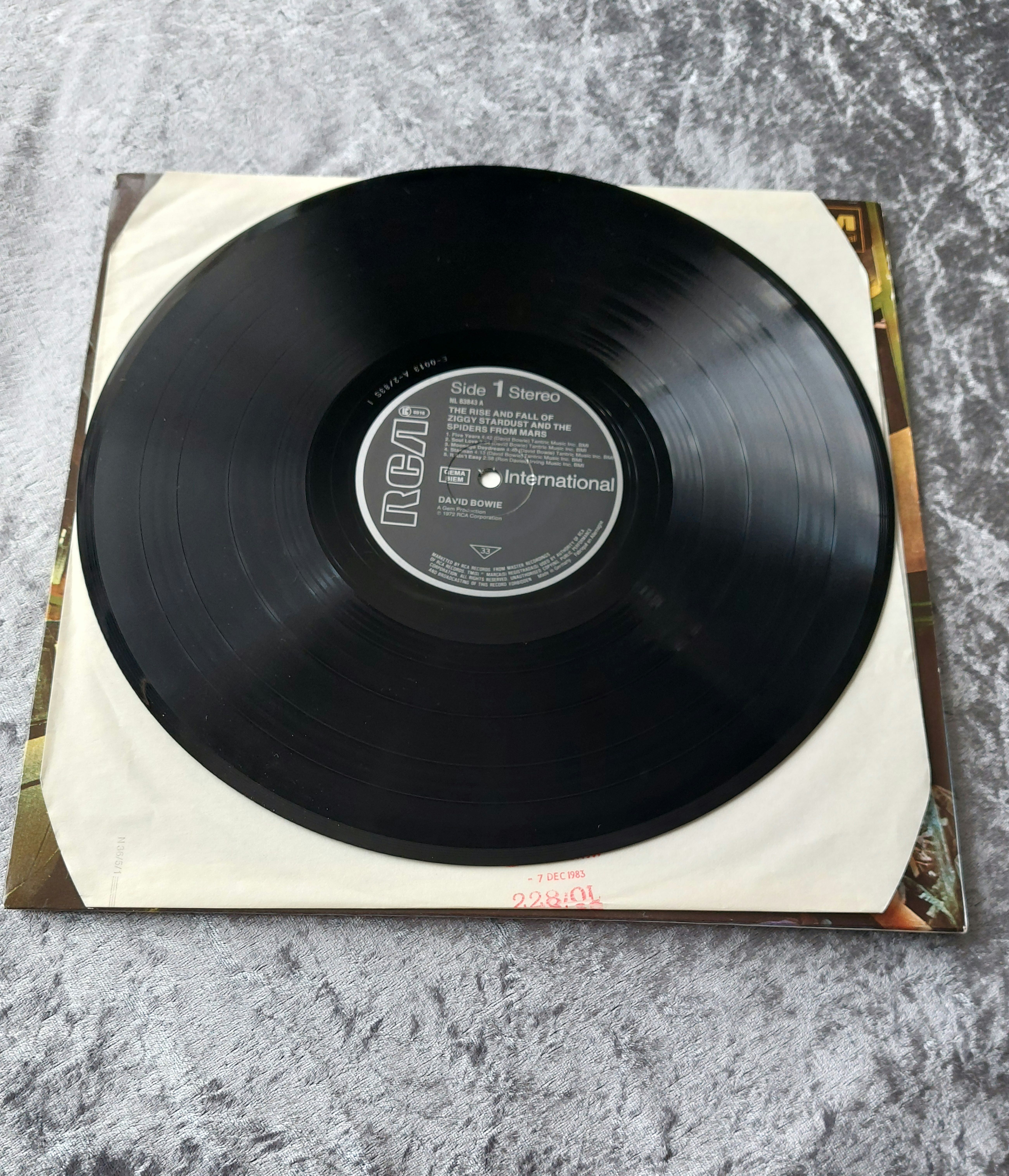 Vinyl LP record album with cover featuring a color photograph of David Bowie as Ziggy Stardust. The album is titled “The Rise and Fall of Ziggy Stardust and the Spiders from Mars.” The record label displays text including “RCA International” and the album title. The vinyl record itself is black and housed within a plain paper inner sleeve.