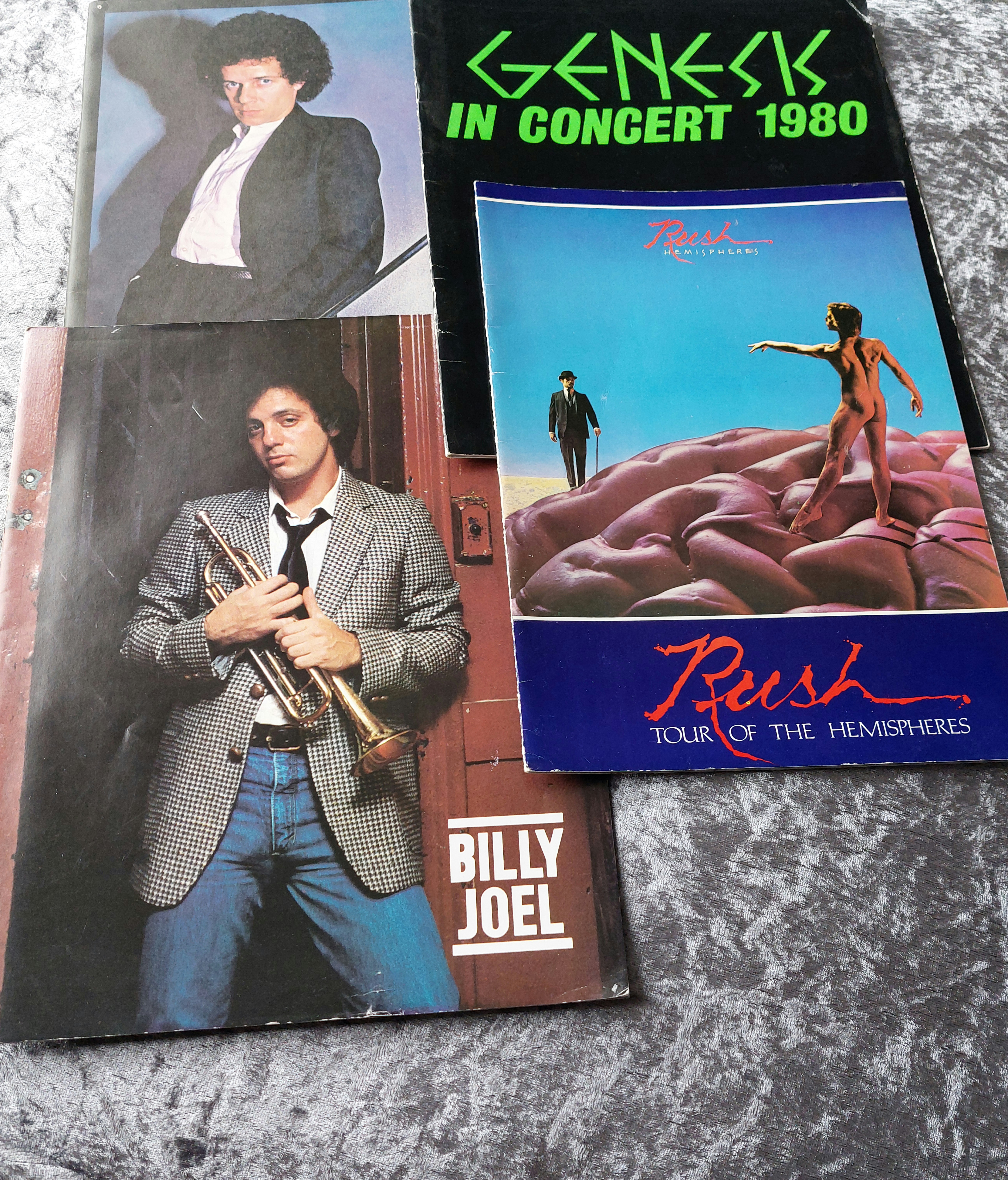 Three vintage concert programs. One features a photograph of Billy Joel holding a trumpet, with his name printed below the image. This program appears to be from the 1970s or 1980s and is printed on card stock. A second program advertises a 1980 Genesis concert tour, with the band’s name in green lettering on a black background. The third program is for Rush’s “Tour of the Hemispheres,” featuring artwork and the band’s name and tour information in red and white lettering on a blue background.