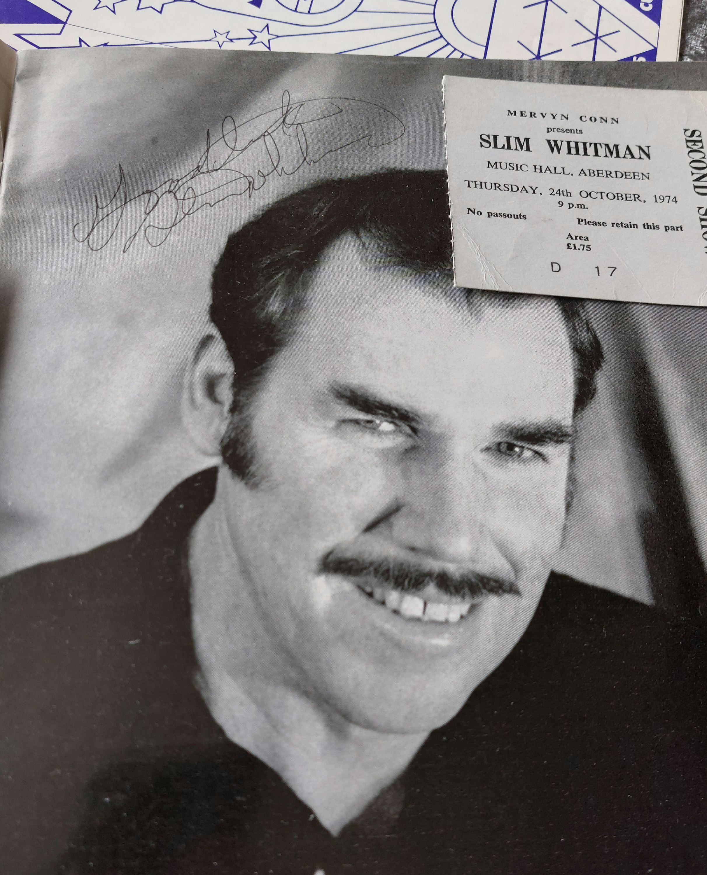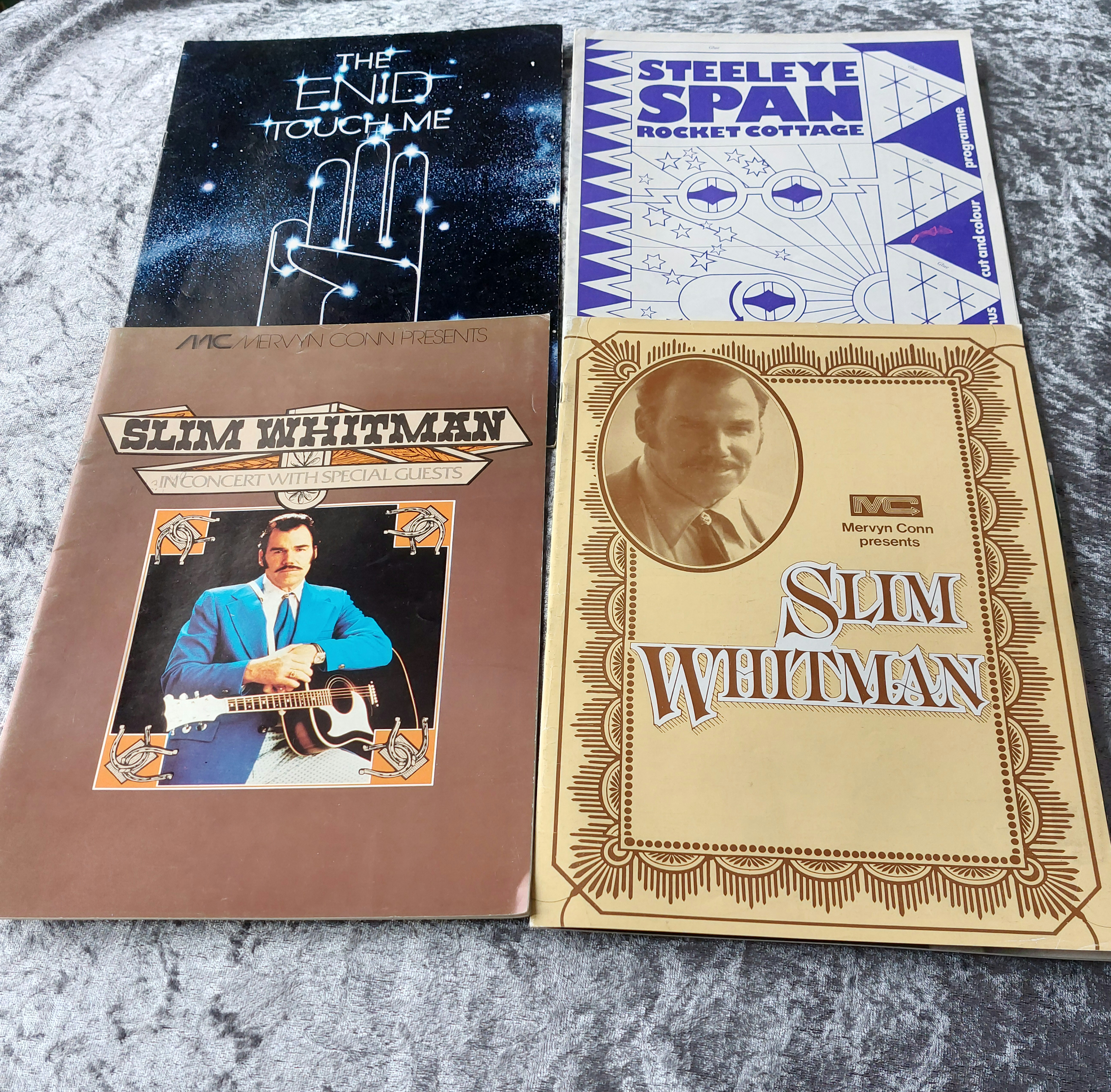 This lot comprises four concert programs and one concert ticket stub, featuring “The Enid,” “Steelye Span,” and two for Slim Whitman concerts, one of which includes the text “Mervyn Conn Presents.” The ticket stub is for a Slim Whitman concert at Music Hall, Aberdeen on October 24th, 1974. A signed photograph of Slim Whitman is also included. All items appear to be made of paper and exhibit printing in color and/or black and white.