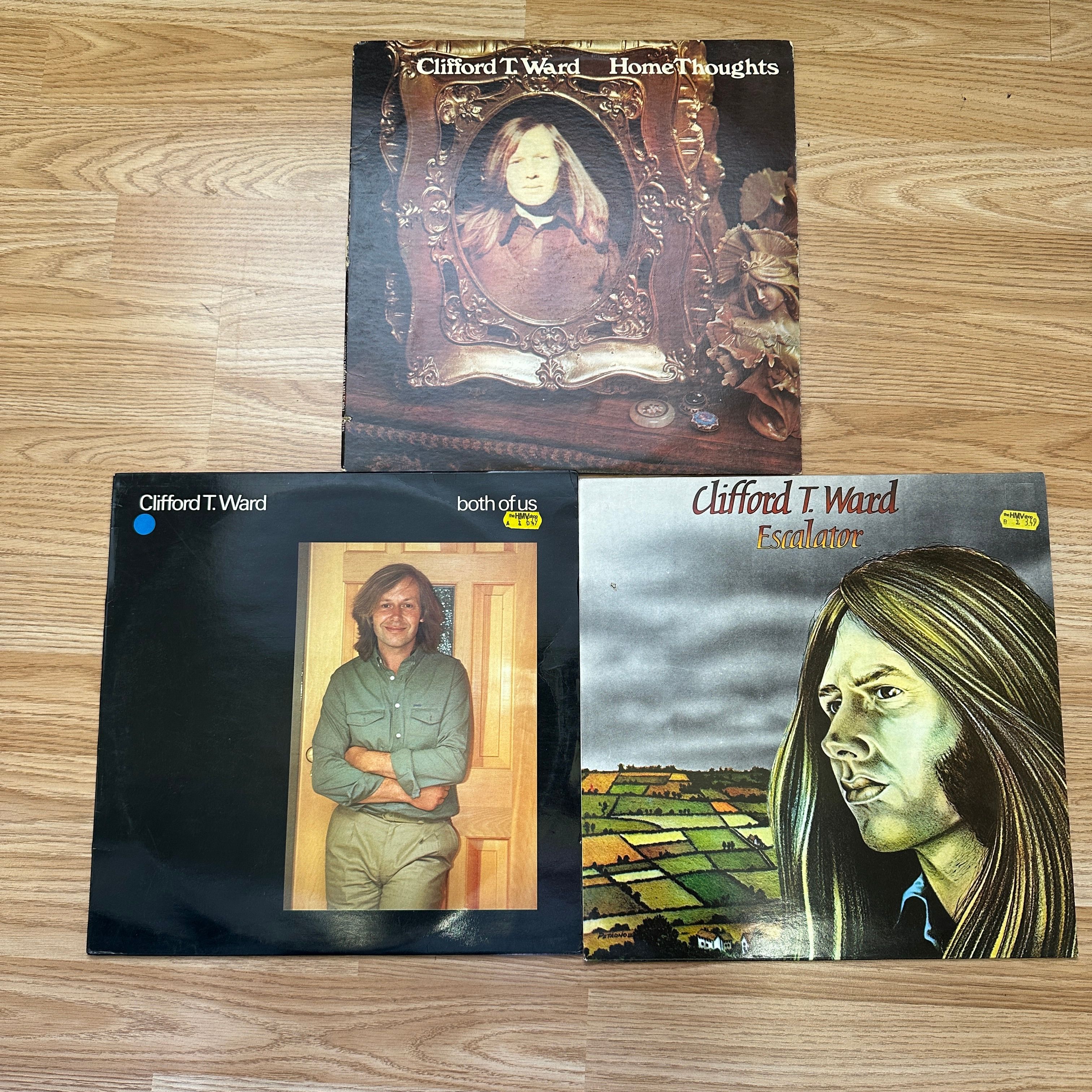 Three vinyl LP records attributed to Clifford T. Ward, featuring cover art consistent with late 20th-century design. The albums are titled “Home Thoughts,” “both of us,” and “Escalator.” The records show some signs of use, possibly from handling and storage.