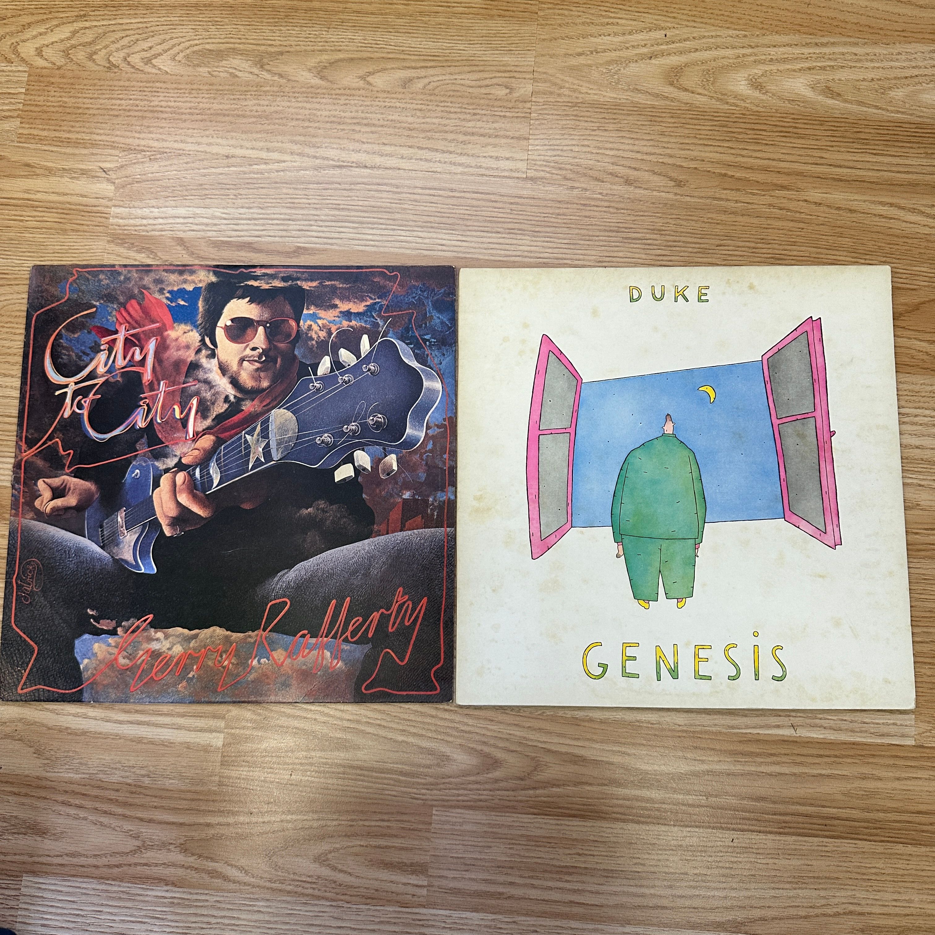 Two vinyl LP records. The first is Jerry Rafferty’s “City to City” album, featuring a painted cover depicting the artist playing a guitar. The second is Genesis’s “Duke” album, with minimalist artwork of a figure in a doorway. Both album covers exhibit some discoloration and minor wear.