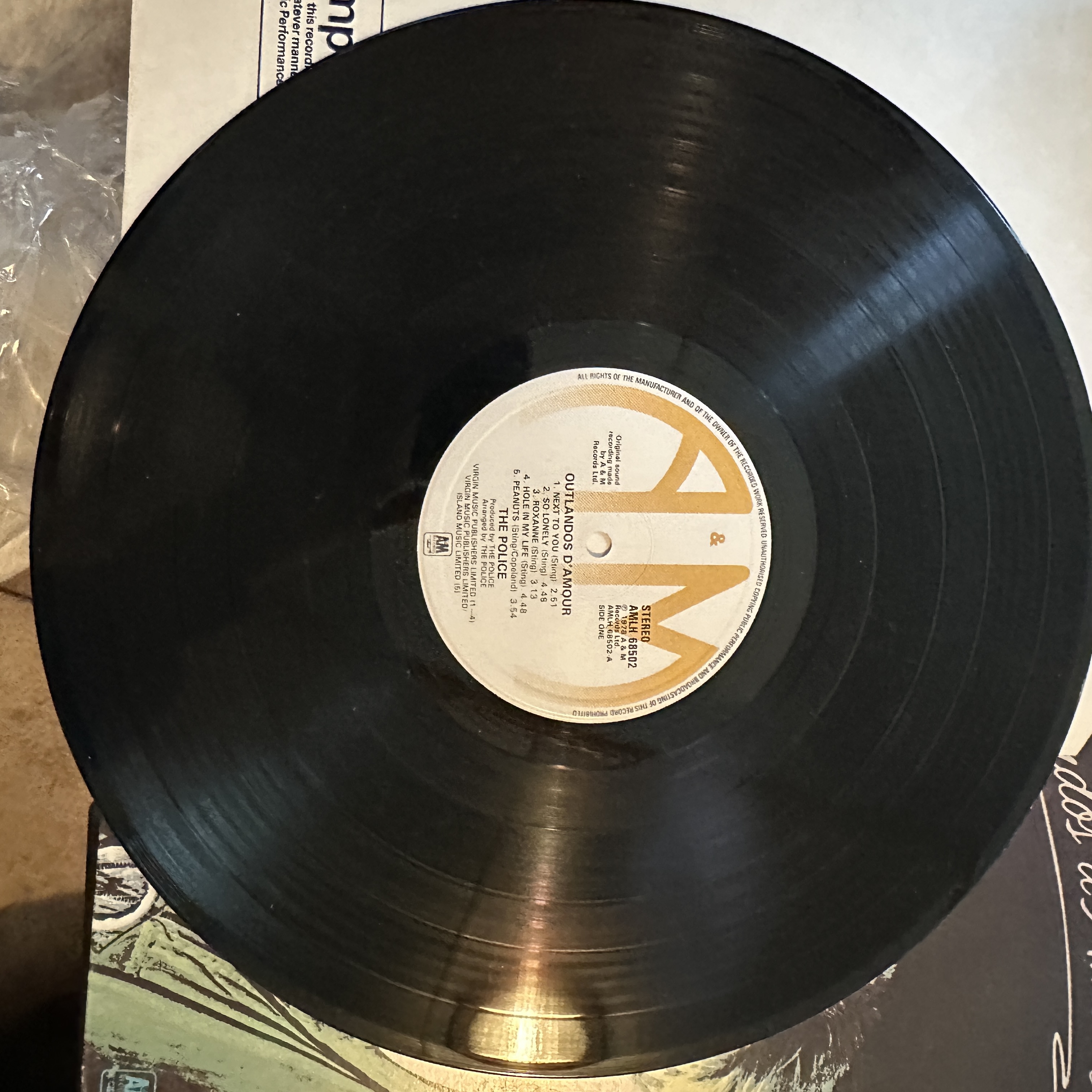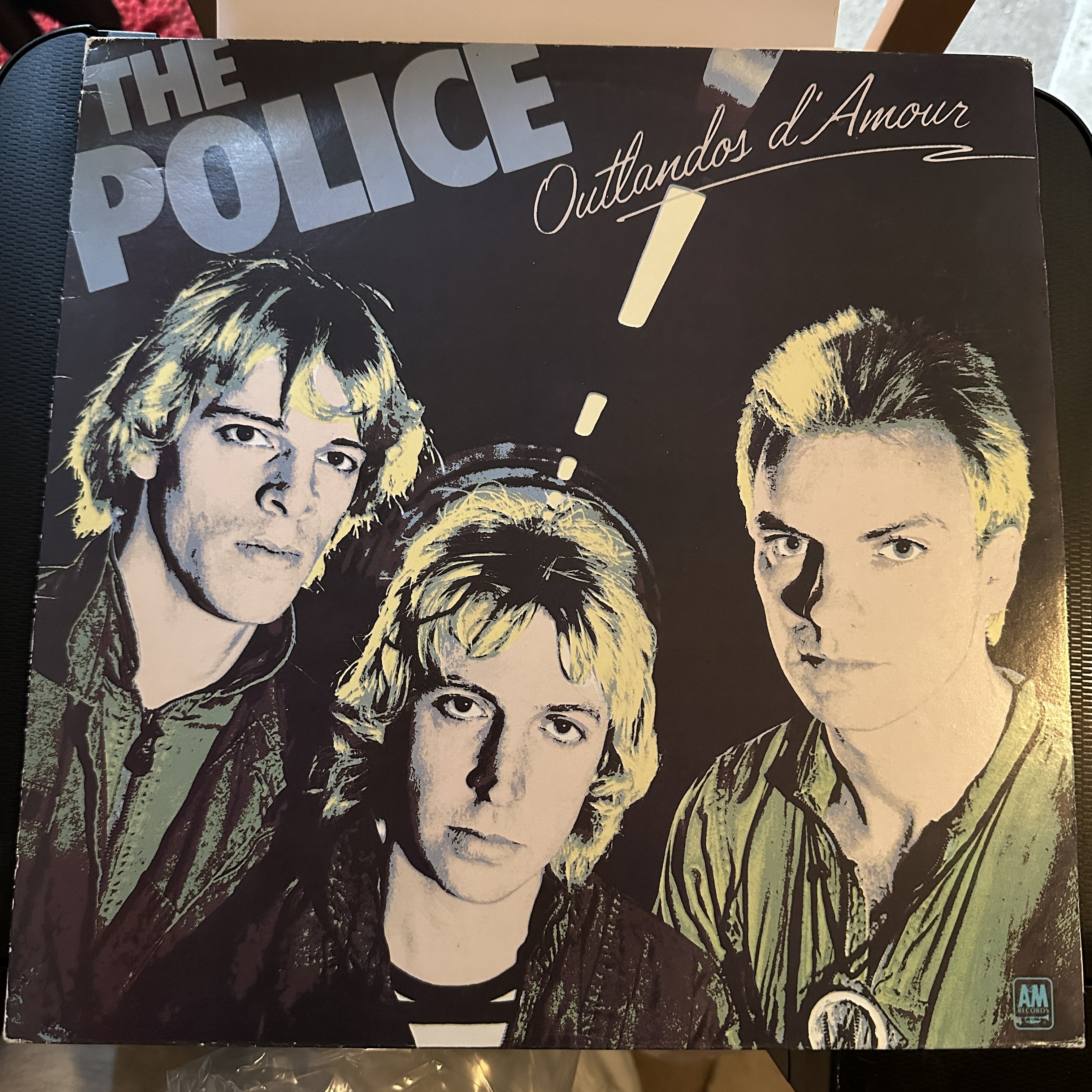 A vinyl LP record album titled “Outlandos d’Amour” by The Police. The album cover features a stylized photographic image of the band members. The record is black vinyl and bears the A&M Records label. The album cover exhibits some minor creasing and scuffing.